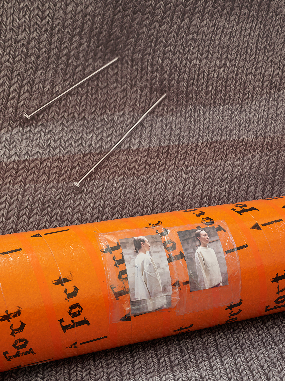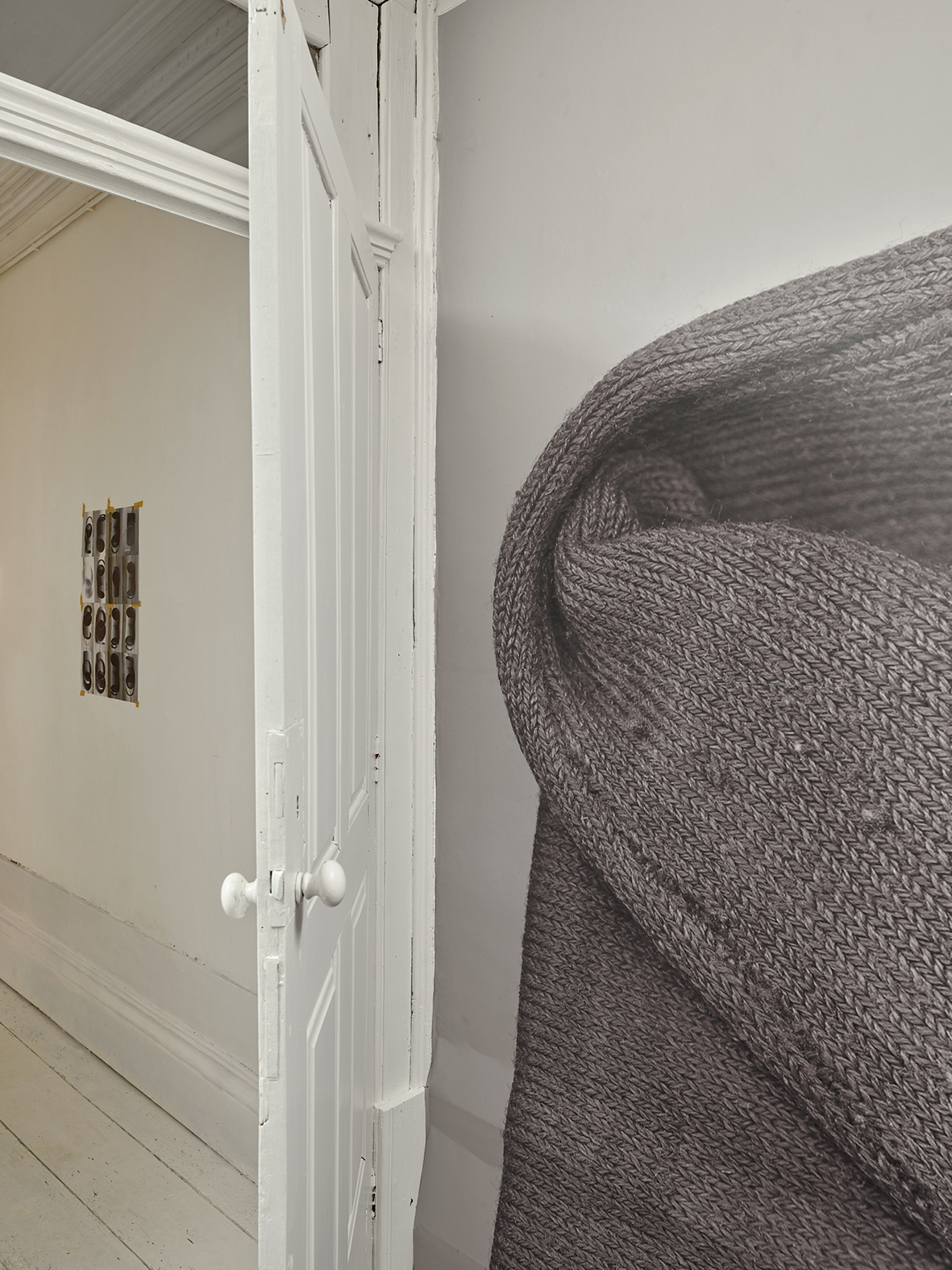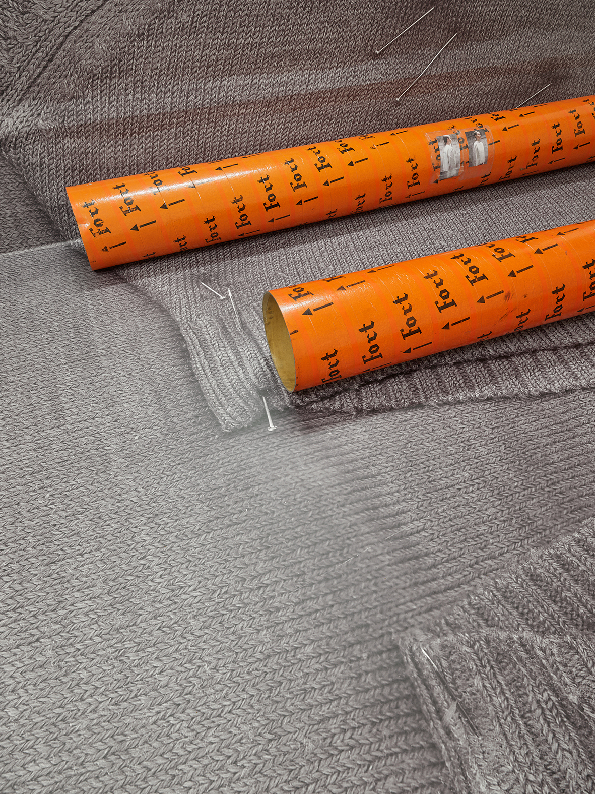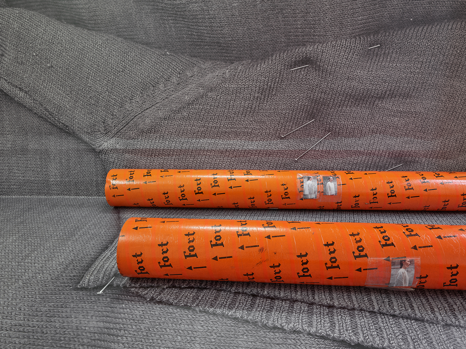 It is 2019 when I first meet June – I am a new mother then and feel alien in my own body, perhaps because the body I have lived in for so long no longer feels like my own. I hardly have time to take care of myself, milk is leaking from my breasts and I am lonely like never before. My life has been turned inside out like a piece of clothing that you pull over your head and, with the inside turned outwards, take off. That's how I feel when I meet June for the first time, turned inside out, empty, a fragile vessel, hollow. At the time, June is giving birth to a new body of work. She is preparing her exhibition No Osso (In the Bone) at Uma Certa Falta de Coerência. Her sculptures seem to hold something within - echoes of bodies, of absence, of structures made to hold or contain - and I immediately sense a connection between my situation, my body, the memory of pain or the pain of memory, June herself and her work. Understanding takes place in the inbetween, in the untold. Hollow spaces offer room for such understandings. Before Junes departure in 2019, she offers me a knitted top - this gesture of care meant more to me than the object itself – I still keep it as a loving memento. Memory appears to be an important aspect in June's work - memory also in the sense of physical remembrance - I am reminded that invisible scars still itch, even if they are covered by beauty with support structures in place. Fast forward to 2025, a lot has happened since our first encounter. The room that once served as my cave in 2019, my bedroom, has now become the vessel for NIKI. June fills this room with an enlarged photograph of another knitted top, her own, folded and held together with sewing needles – needles that are now as big and deadly as swords. Empty construction tubes and photographs of my former self of 2019 lie across the floor. Looking back, it all makes sense: closure and decision-making also pave the way for new beginnings, like an endless unfolding of inevitable transformations.