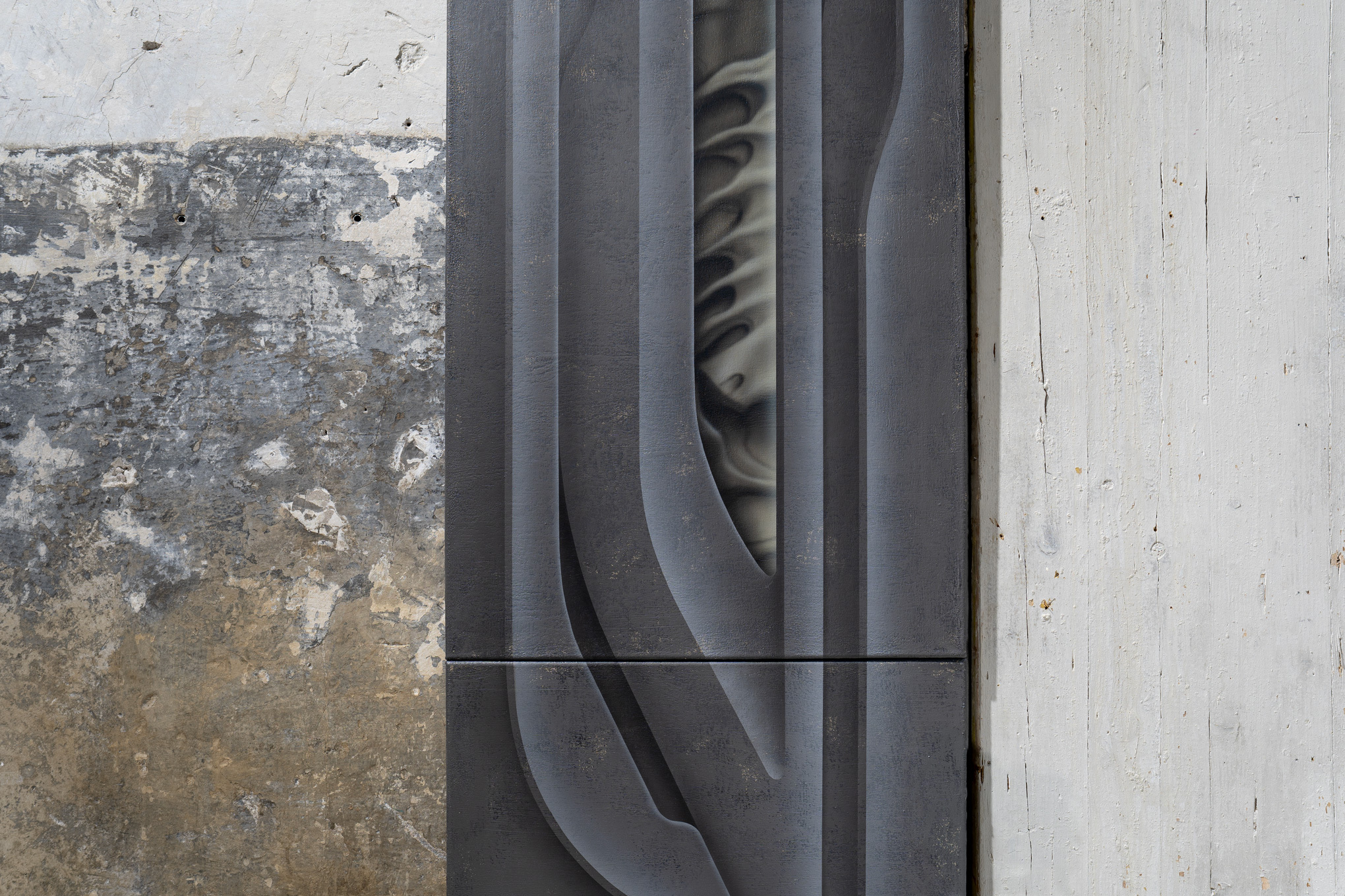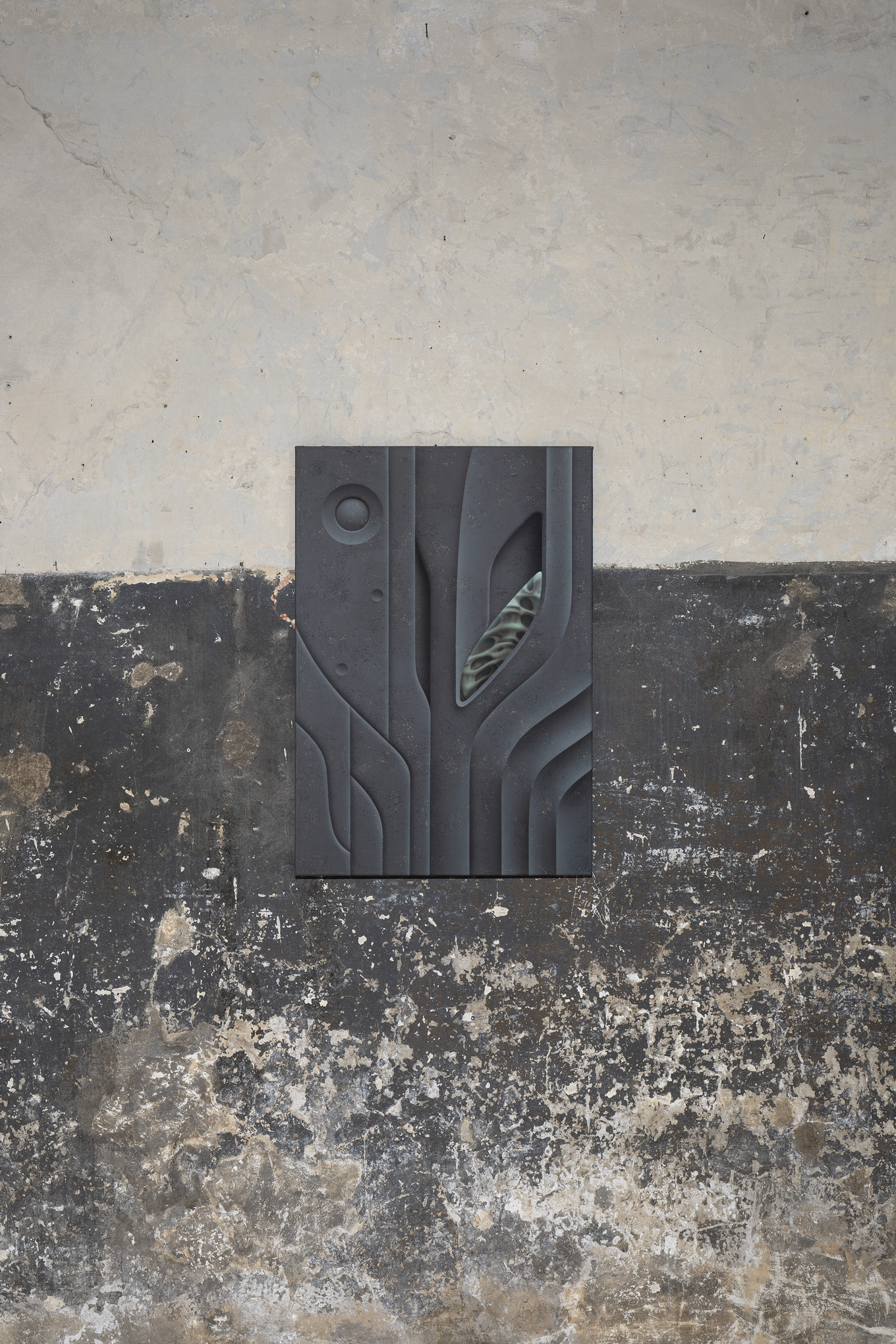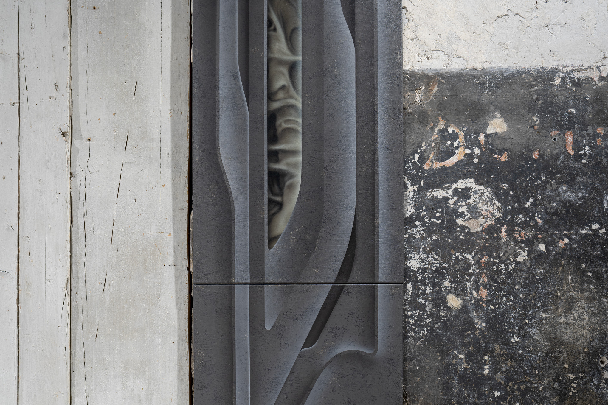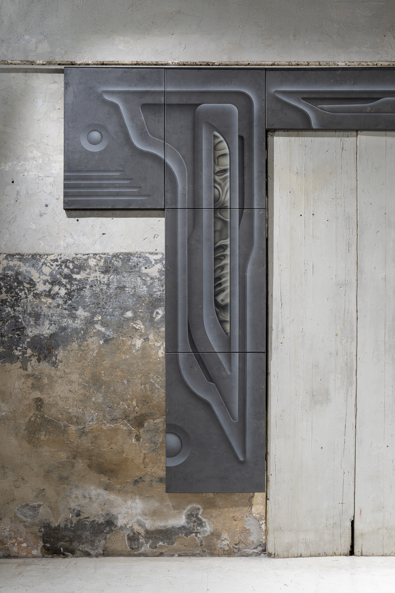 The unsettling glimpses into the portal’s core reveal hints of life, which heighten tension and offer space for imagination. Just as in his remaining objects and paintings, the artist explores the relationship between body and technology. Here, too, it is unclear whether we are observing the remnants of an unknown civilization, fragments of future machines, or ritual objects beyond our current experience.