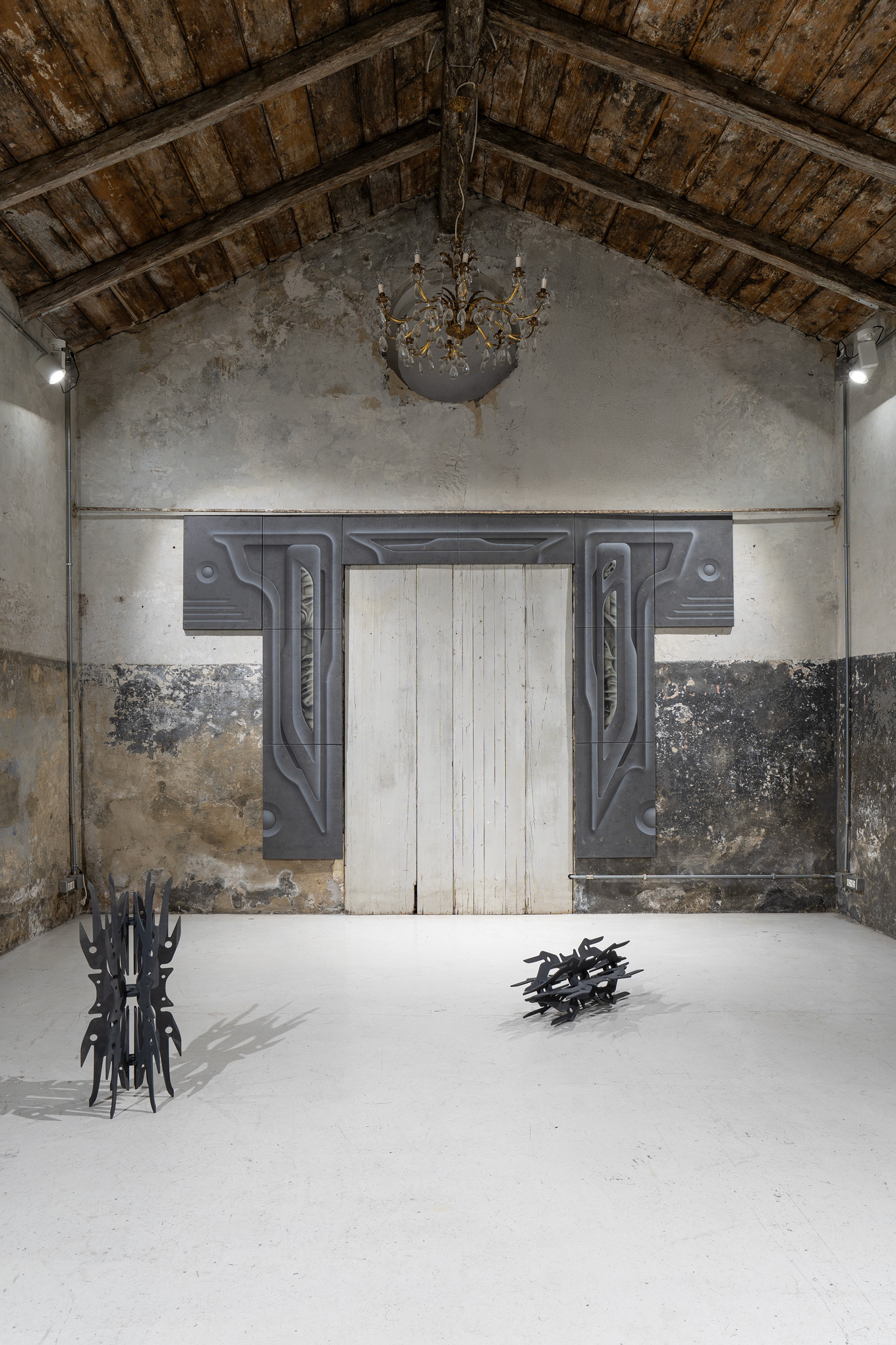 At the core of the project lies the painting installation ARCH:3ON (2025), which transforms an old door frame into an imaginary portal between worlds. By stacking canvases, Vagač constructs an object whose character resembles that of a technological artifact, seamlessly integrating the original interior element of the door into a joint dialogue. The composition recalls an architectural relief with biomorphic details and maintains geometric elements and symmetry, while the artist softens and rounds the individual systems. The grey and ochre colour palette, with its subtle painterly textures, evokes a material marked by erosion, allowing it to engage directly with its surroundings.