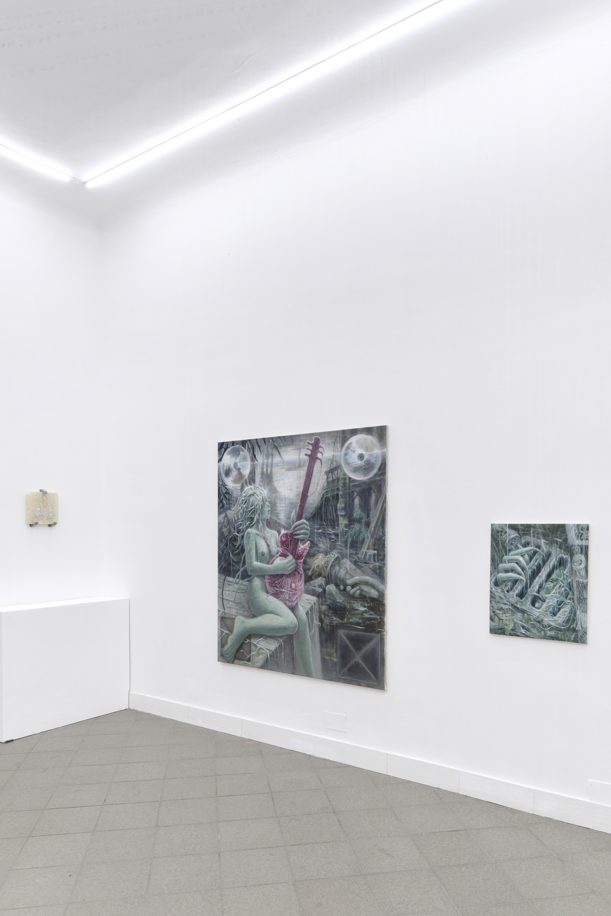 Jung Min Lee constructs post-apocalyptic worlds where vegetal, mechanical and human forms intertwine within cyclical processes of decay and regeneration. Her paintings function as post-organic ecosystems, depicting the remnants of humanity through a lens of nostalgia, as perceived by hybrid beings that emerge in the aftermath of human collapse.