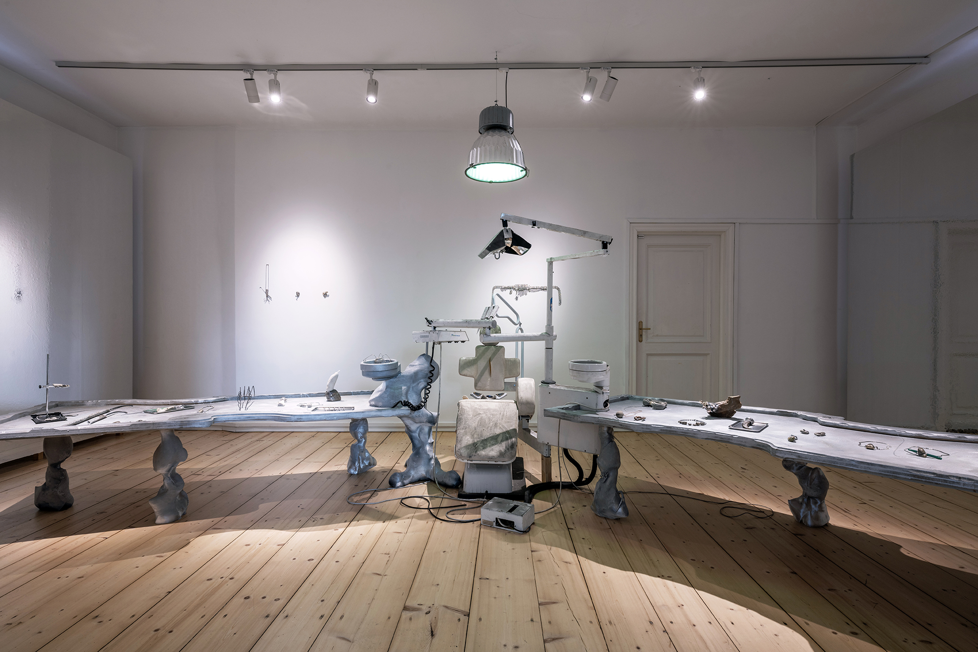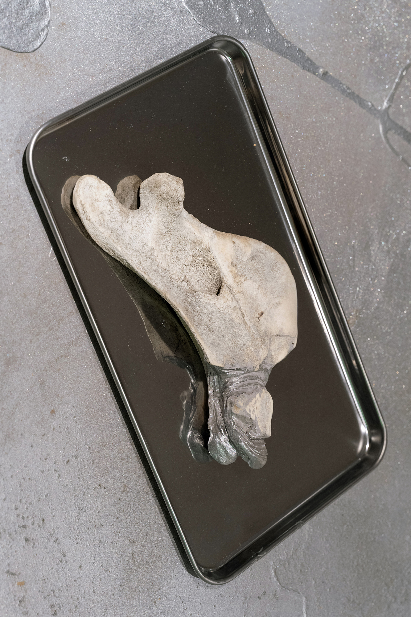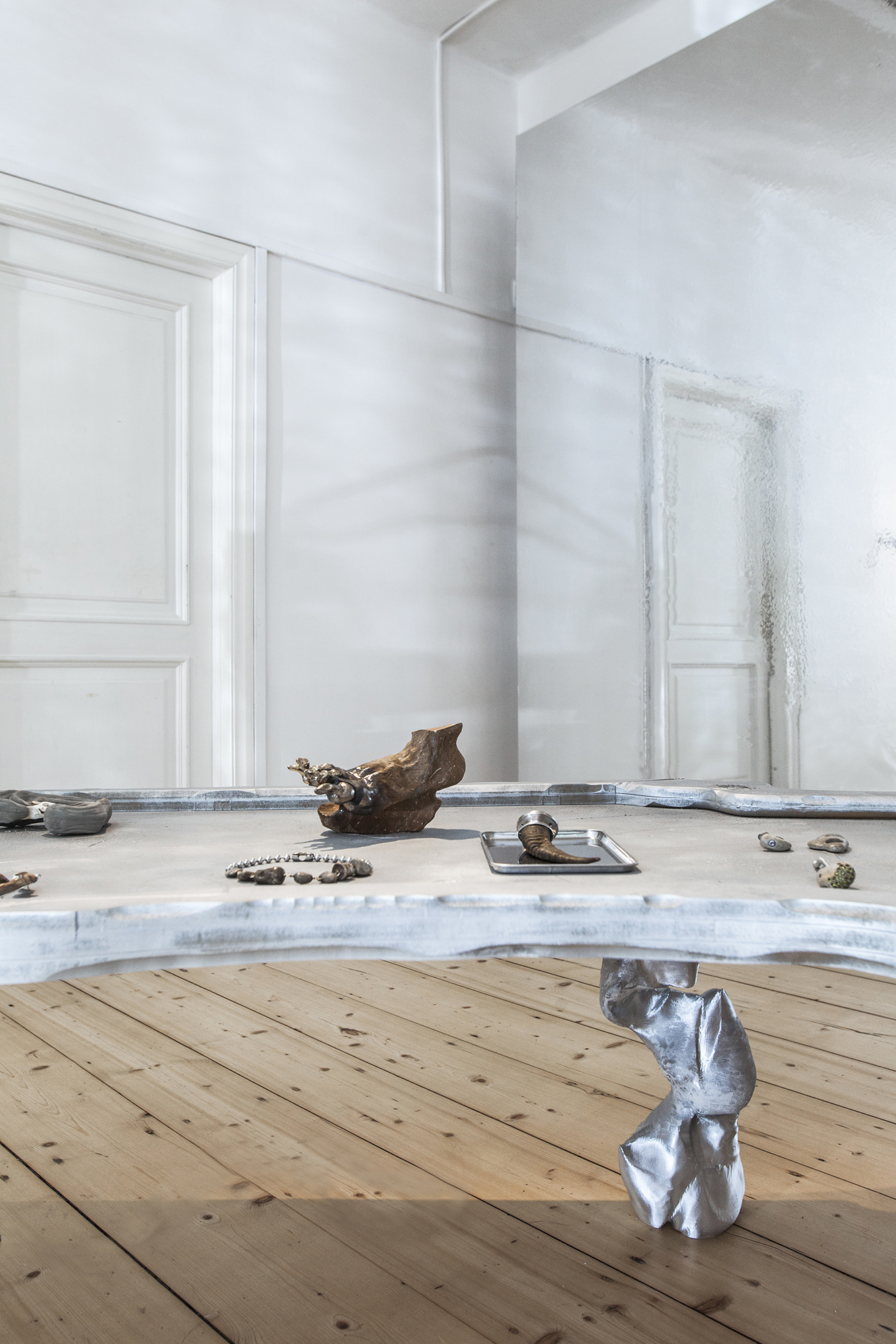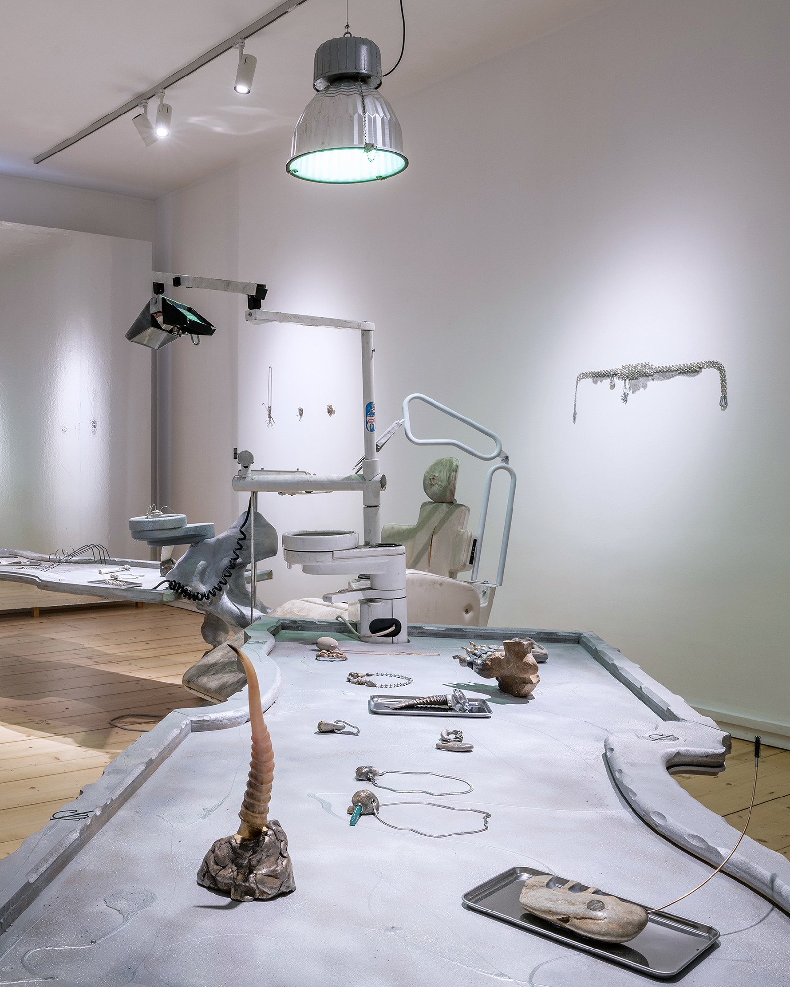 Hirtentreu’s and Popolitova’s installation presents an aesthetic laboratory with an undefined temporal origin. It is partly a shrine, partly a clinic, where medical and cosmetic objects intertwine – everything from nail soakers, bootyshakers, gaze amplifiers and body triggers – as well as animal-derived artefacts and materials like silver, charcoal, and stone, all of which appear to be part of an attempt to invent yet another absurd beauty procedure promising eternal youth for the body. Through the materials used, the artists highlight the invasive methods and almost unattainable standards employed in the pursuit of beauty and youth.