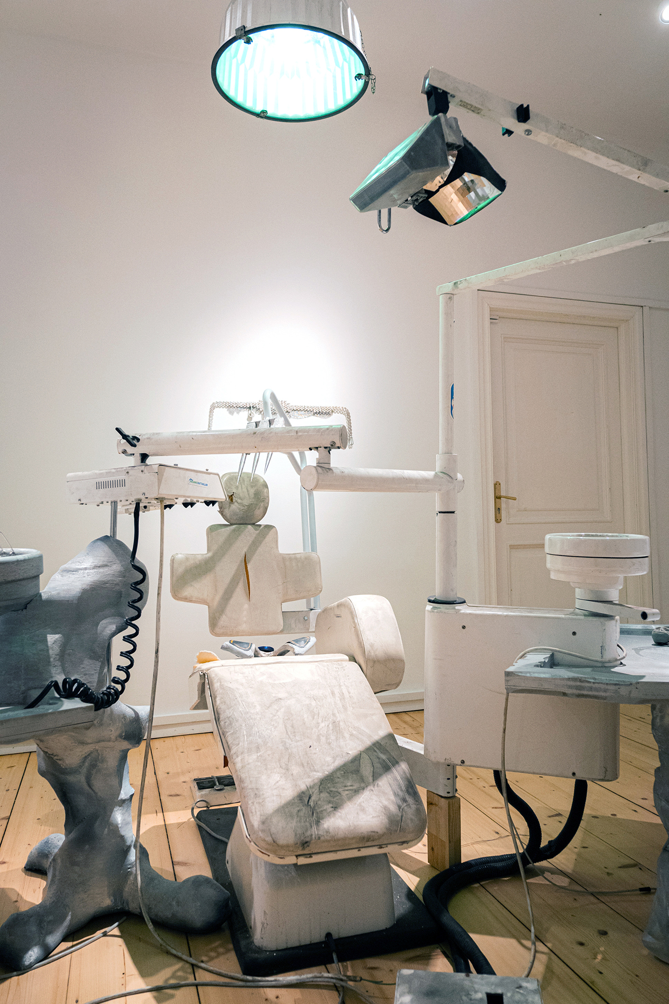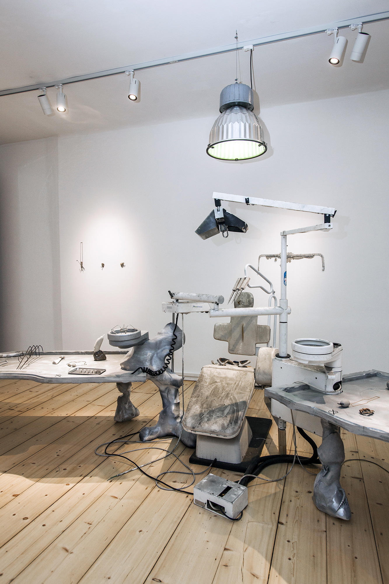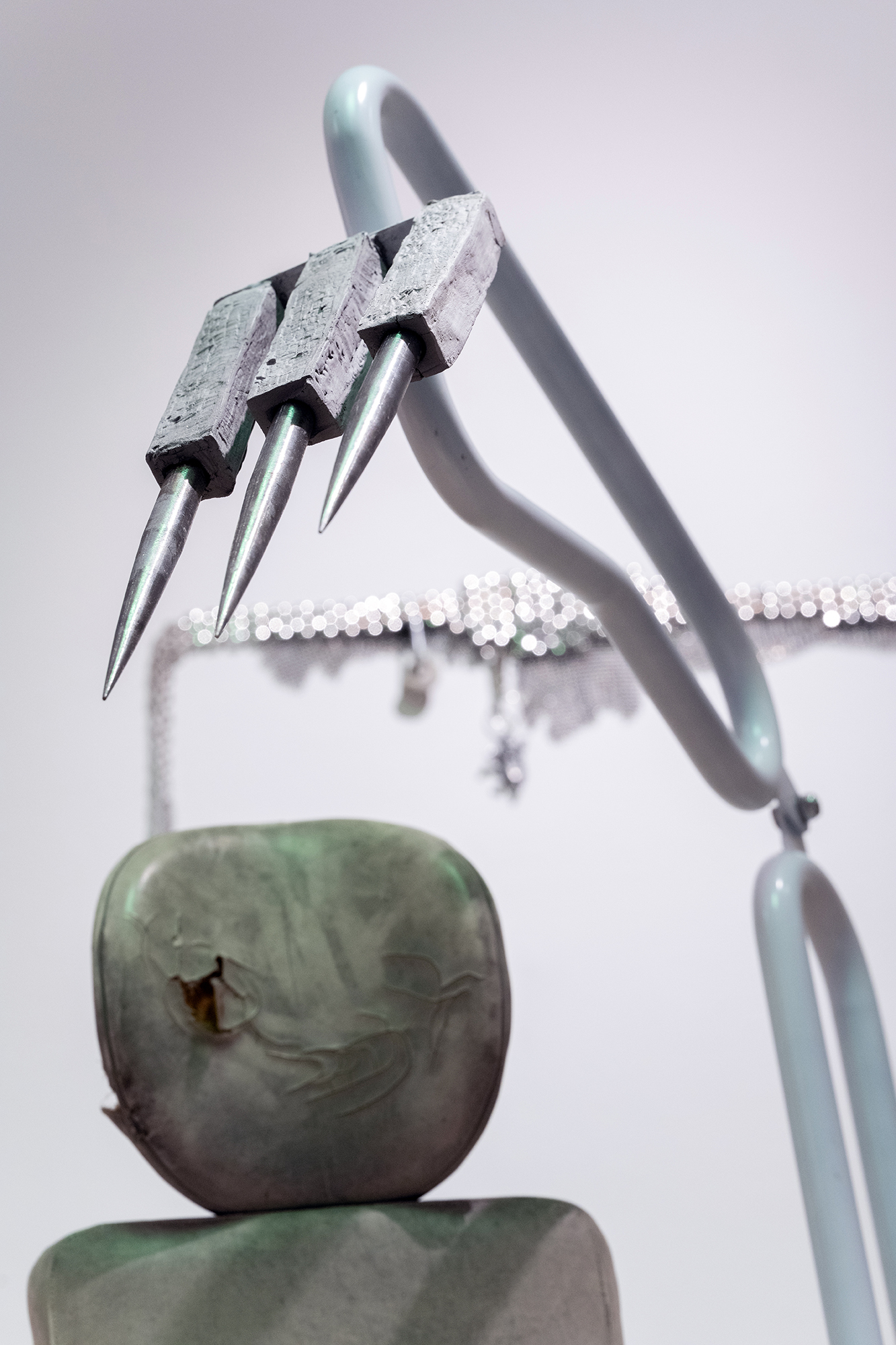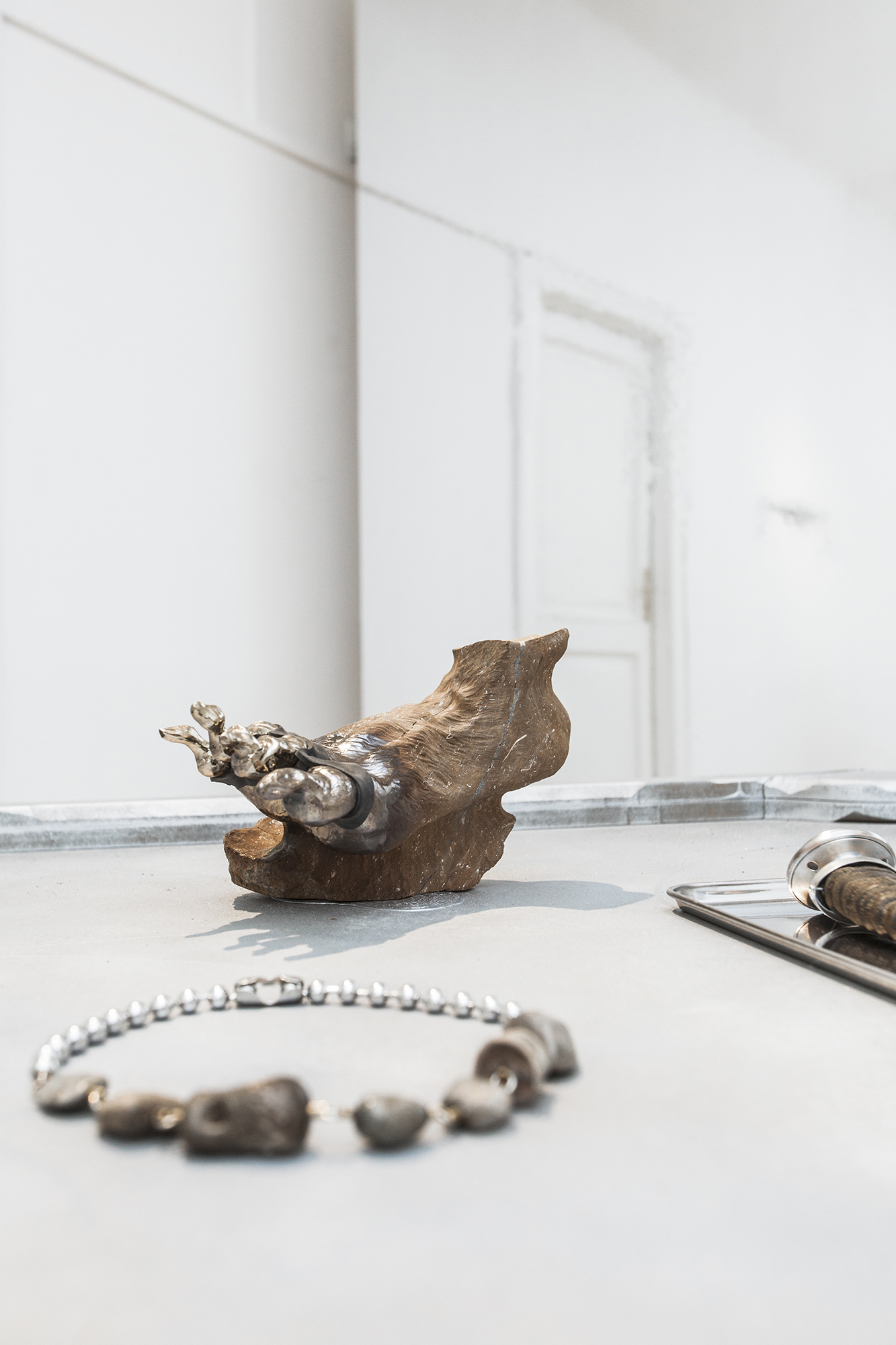 Hirtentreu’s and Popolitova’s installation presents an aesthetic laboratory with an undefined temporal origin. It is partly a shrine, partly a clinic, where medical and cosmetic objects intertwine – everything from nail soakers, bootyshakers, gaze amplifiers and body triggers – as well as animal-derived artefacts and materials like silver, charcoal, and stone, all of which appear to be part of an attempt to invent yet another absurd beauty procedure promising eternal youth for the body. Through the materials used, the artists highlight the invasive methods and almost unattainable standards employed in the pursuit of beauty and youth.