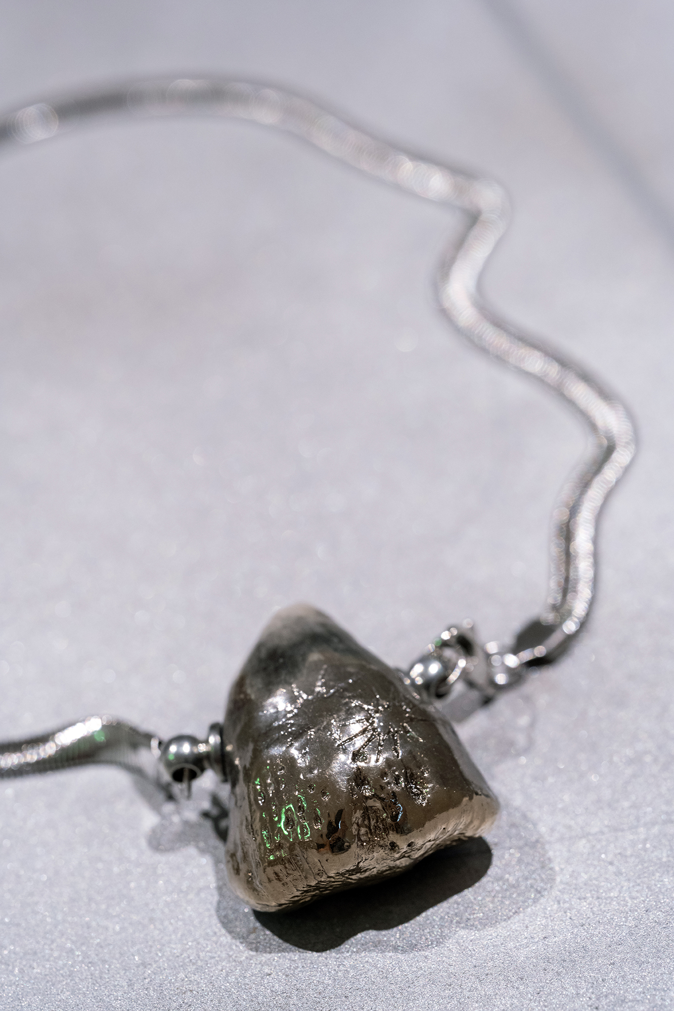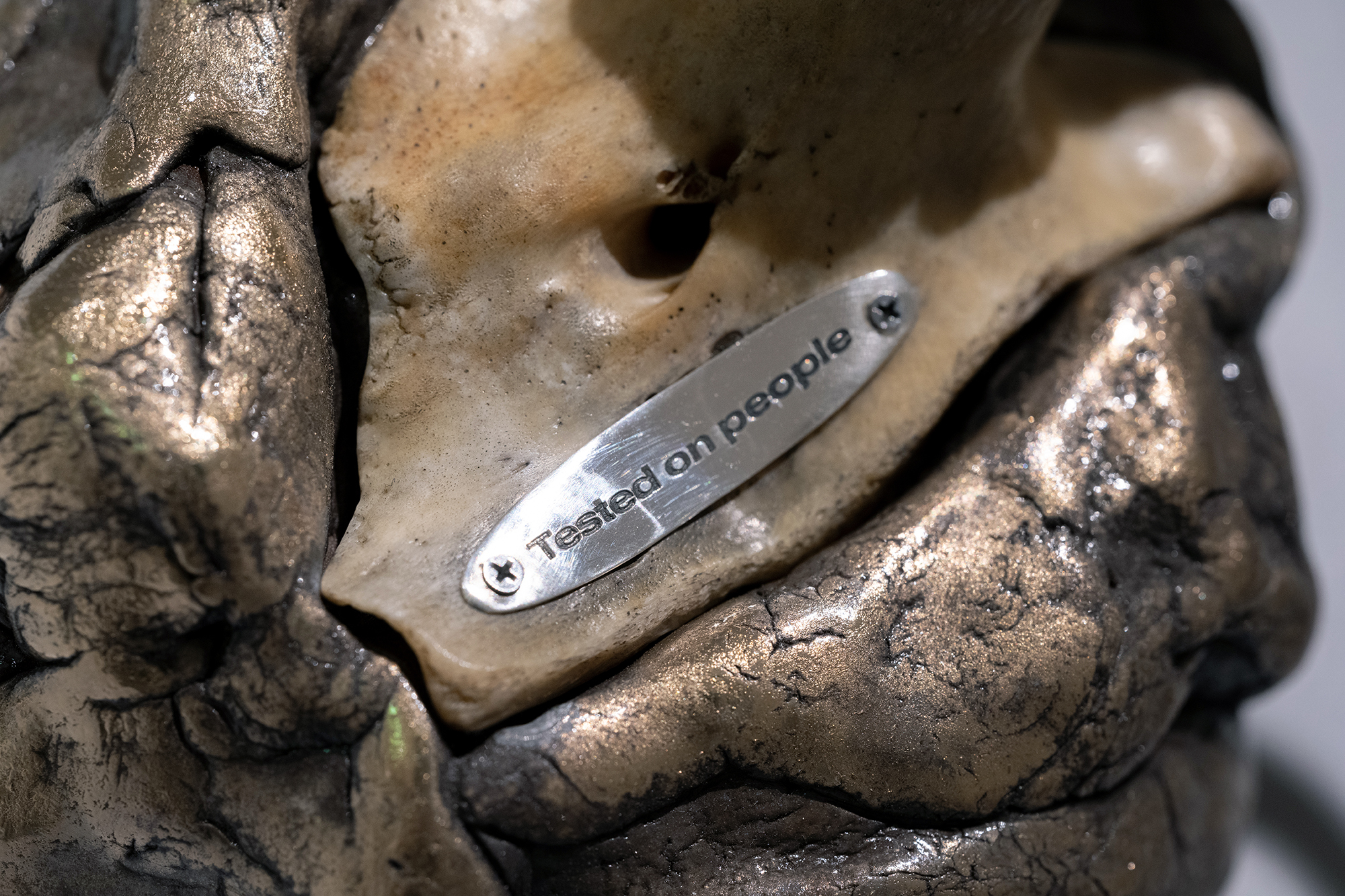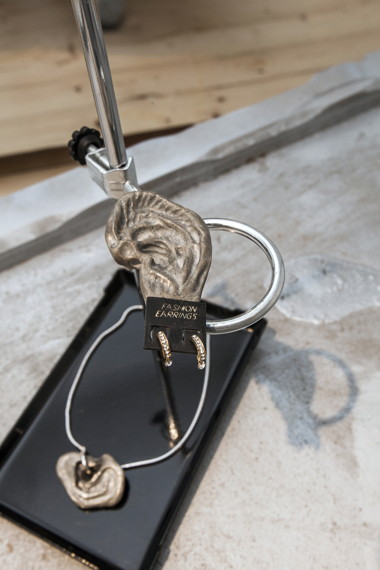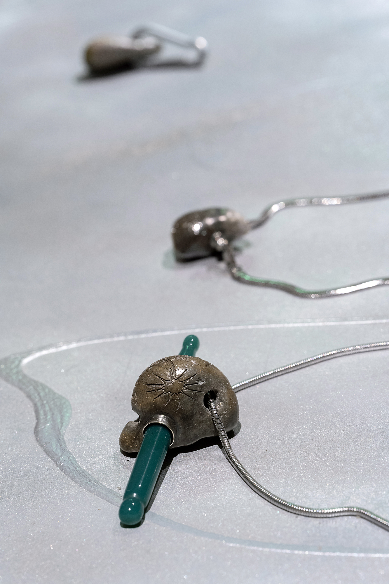 Hirtentreu’s and Popolitova’s installation presents an aesthetic laboratory with an undefined temporal origin. It is partly a shrine, partly a clinic, where medical and cosmetic objects intertwine – everything from nail soakers, bootyshakers, gaze amplifiers and body triggers – as well as animal-derived artefacts and materials like silver, charcoal, and stone, all of which appear to be part of an attempt to invent yet another absurd beauty procedure promising eternal youth for the body. Through the materials used, the artists highlight the invasive methods and almost unattainable standards employed in the pursuit of beauty and youth.