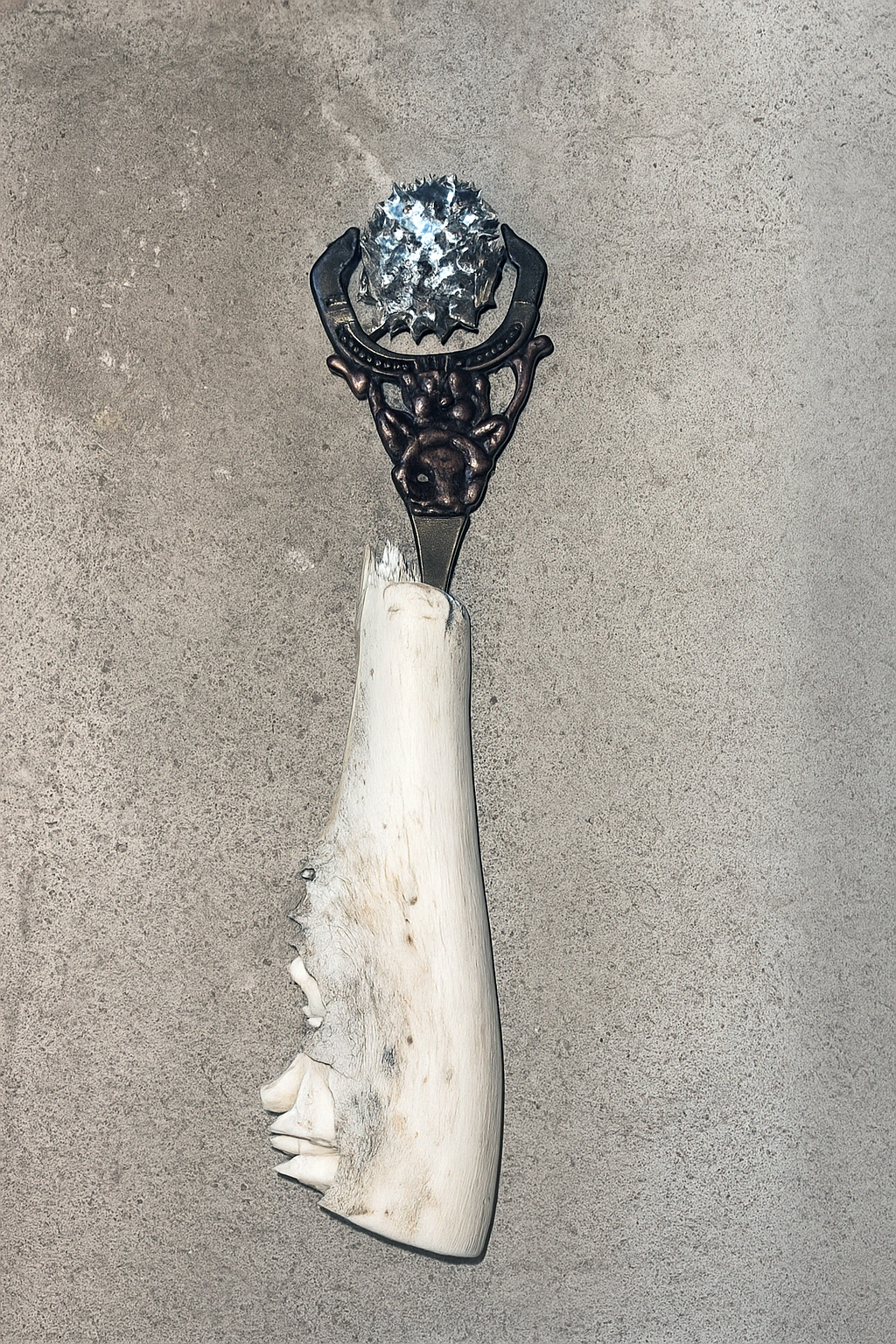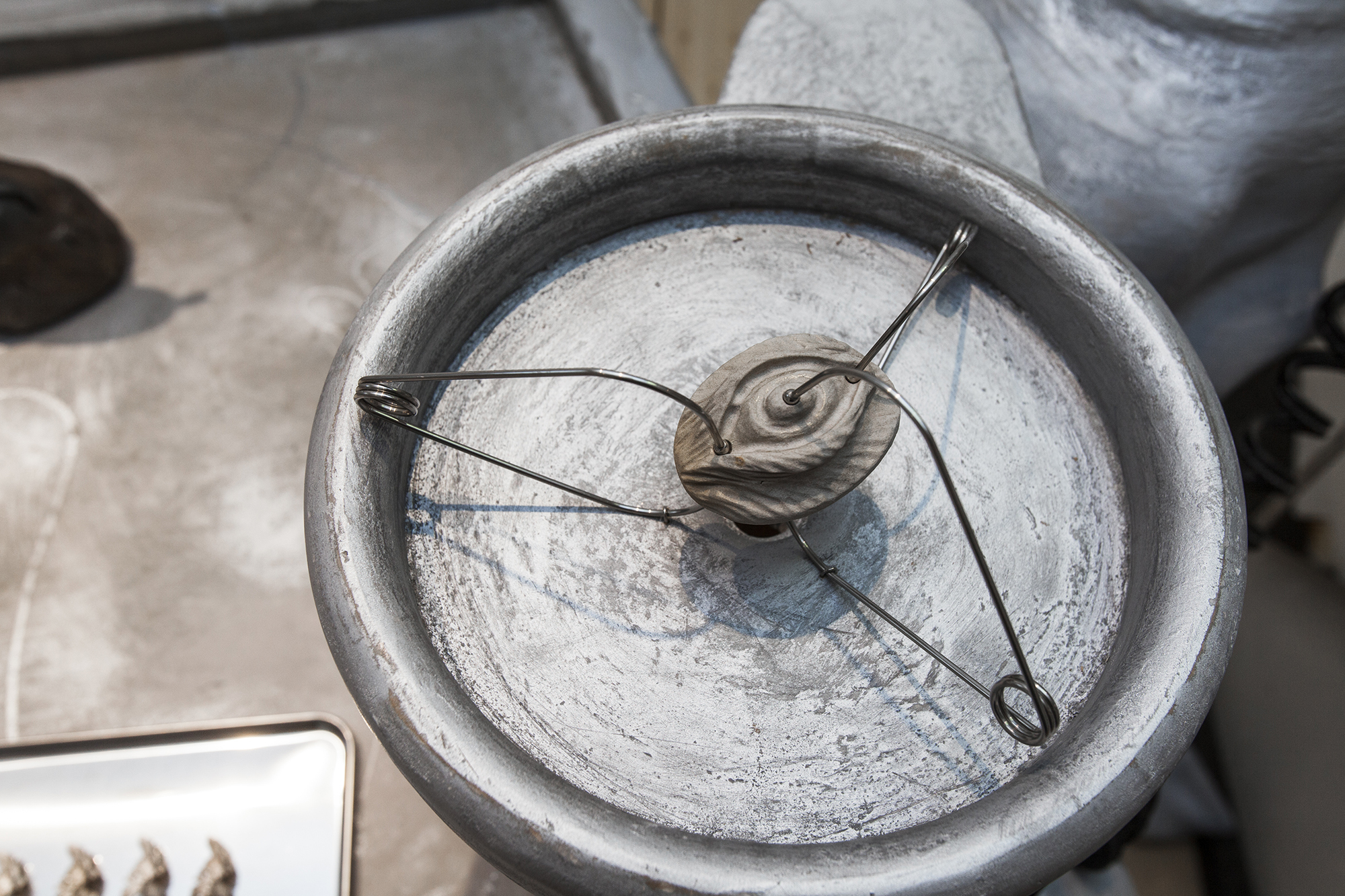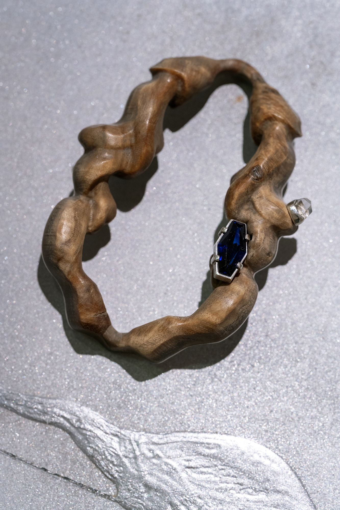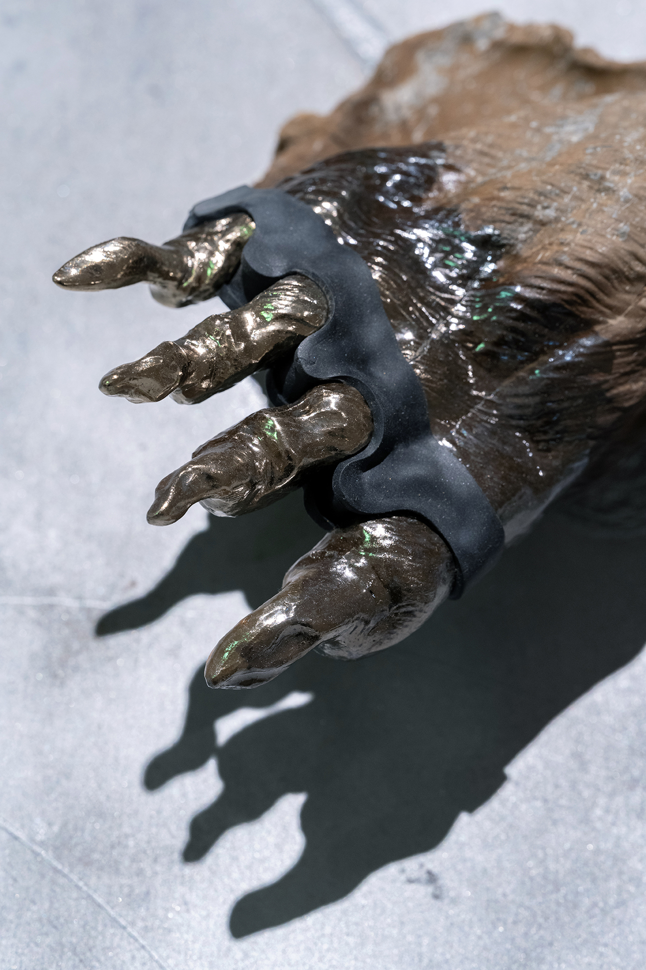 Hirtentreu’s and Popolitova’s installation presents an aesthetic laboratory with an undefined temporal origin. It is partly a shrine, partly a clinic, where medical and cosmetic objects intertwine – everything from nail soakers, bootyshakers, gaze amplifiers and body triggers – as well as animal-derived artefacts and materials like silver, charcoal, and stone, all of which appear to be part of an attempt to invent yet another absurd beauty procedure promising eternal youth for the body. Through the materials used, the artists highlight the invasive methods and almost unattainable standards employed in the pursuit of beauty and youth.