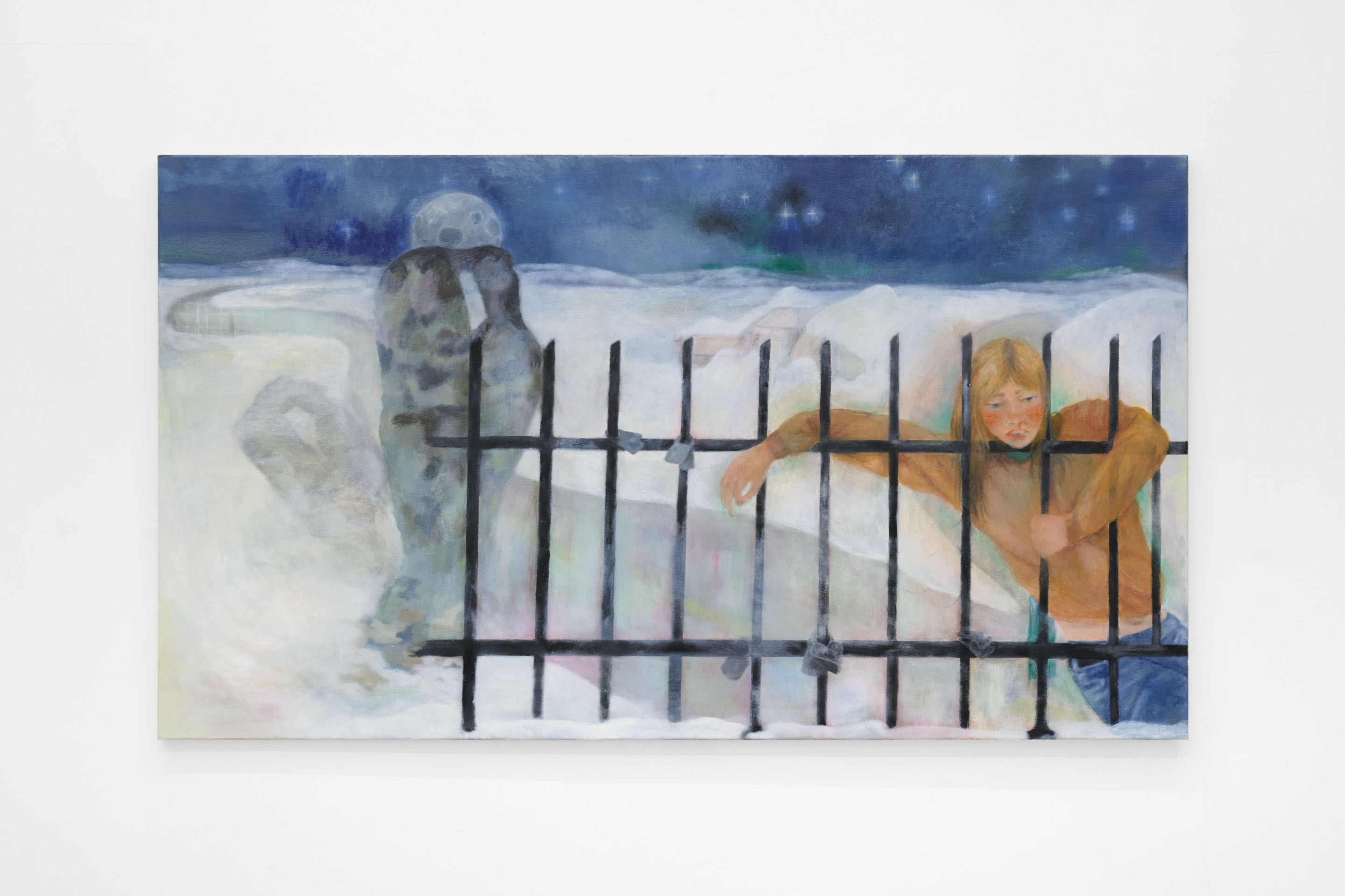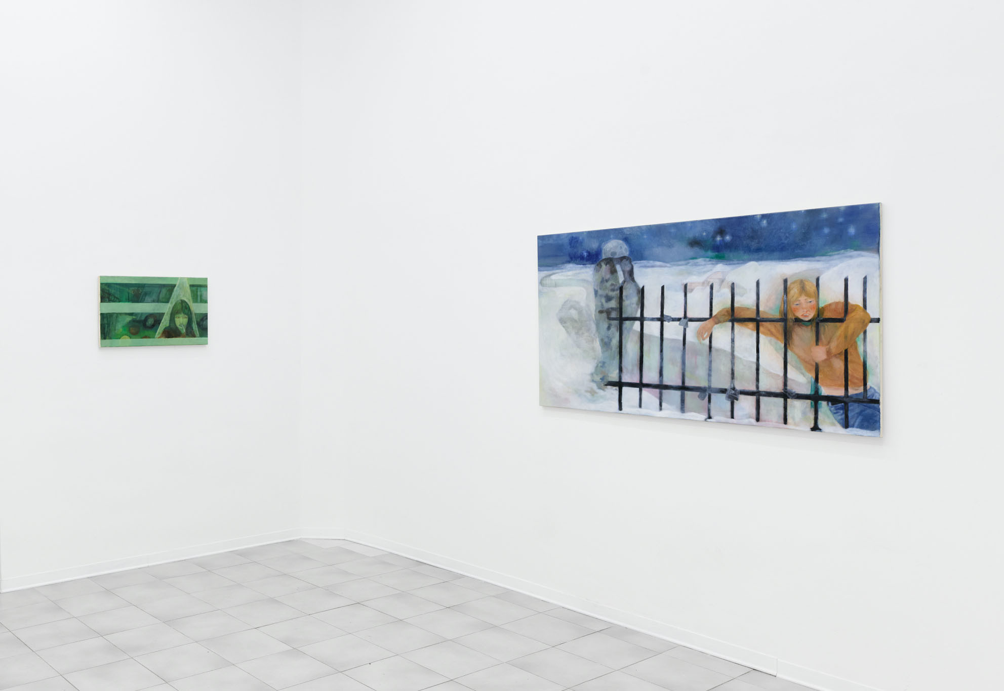 We are happy to announce From A to X (too much love), an exhibition by Sofie Tobiášová and Adam Vít opening on Thursday, January 15 at UNA | Milano. The exhibition unfolds as an investigation into movement, instability, and identity as a condition in flux, addressing the contradictions embedded in the contemporary search for meaning and belonging —to a place, a practice, or to another person. Central to the show are themes of in-betweenness and uprootedness, experiences of foreignness, and the tension between rural and urban contexts. Walking operates as a critical gesture, while the road emerges as both a physical and symbolic space. From A to X (too much love) proposes a space of deceleration and reflection—a human-scale response to a world driven by acceleration and productivity. Sofie Tobiášová presents a body of predominantly horizontal paintings, developed through cycles of action and denial, decision and erasure. Her painterly process unfolds as a layered temporal space, where uncertainty, failure, and loss are embraced as necessary components of creation. The works employ deliberately kitsch or emotionally “awkward” imagery—adolescent love, loneliness, heartbreak, snowy landscapes, star-filled nights, romantic icons—to uncover their latent emotional and aesthetic potential. Adolescence becomes a central reference point: a phase marked by transition, vulnerability, and quiet shame, echoing the experience of migration and arrival in a new country. The recurring figure of the young girl embodies a threshold—no longer a child, not yet an adult—burdened with desire, expectation, and external projections. Rather than illustrating specific formative events, the paintings evoke the emotional atmosphere of that time: confusion, tenderness, longing, and clumsy attempts at love. The titles, drawn from love song lyrics, further anchor the works in an affective and temporal register. A recurring element in this new series of Tobiášová’s paintings is the color green, often appearing as a luminous accent. Ambiguous in nature, it evokes both urban alienation—recalling the nocturnal glow of neon lights—and the surrealist tradition, particularly the Czech avant-garde. The artist references figures such as Toyen and Jindřich Štyrský, whose trajectories of emigration and artistic struggle resonate with her own experience and subtly permeate the work. Adam Vít’s practice explores an expanded conception of painting, focusing on how meaning and value are produced, displaced, and transformed. Through small gestures of layering and juxtaposition, his work engages with instability—in authorship, identity, and interpretation—while negotiating the tension between intimacy and structure. Through processes of reuse and recontextualization, the artist questions systems of presentation and representation within artistic production, alongside issues of economic exploitation, individuality, and identity.