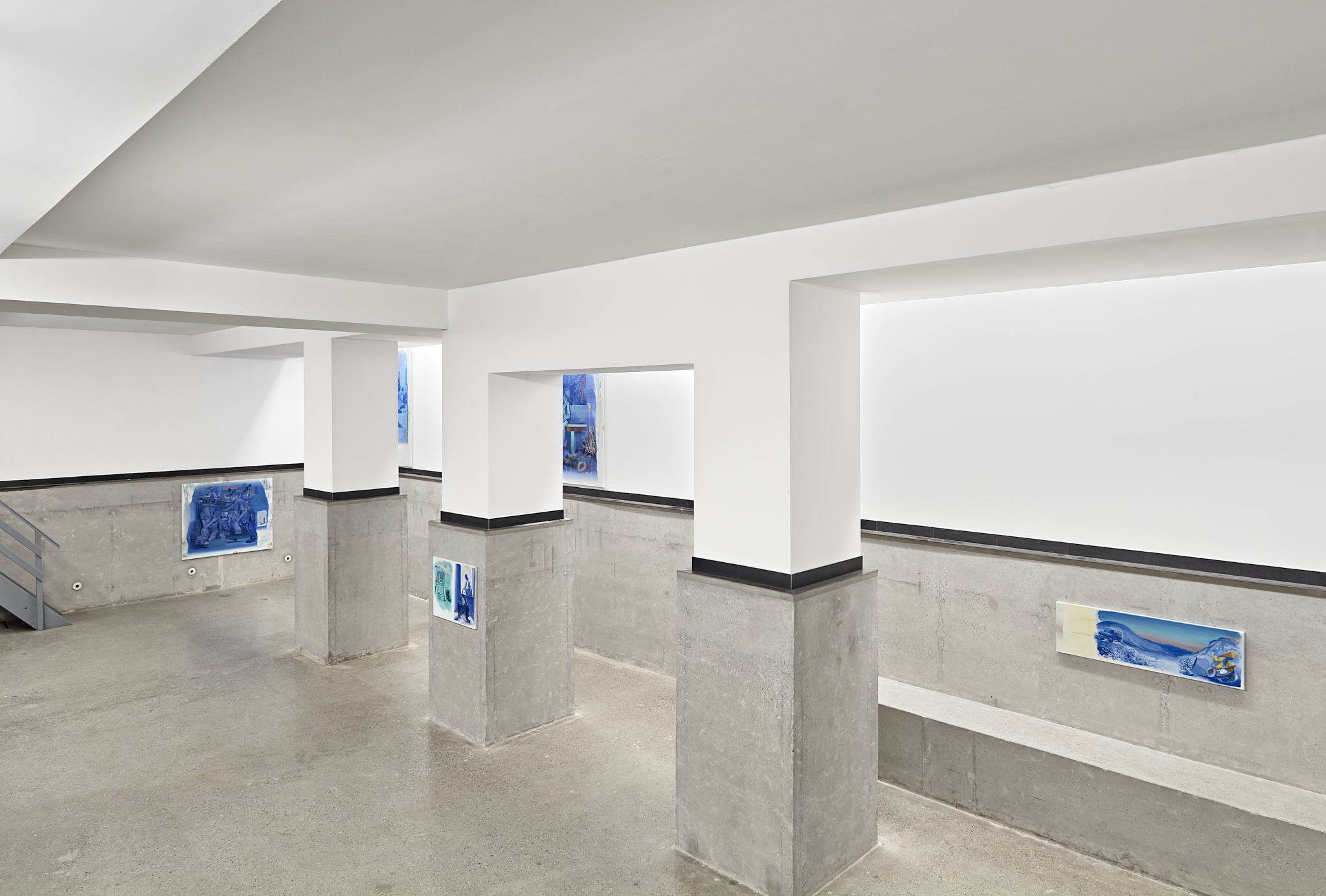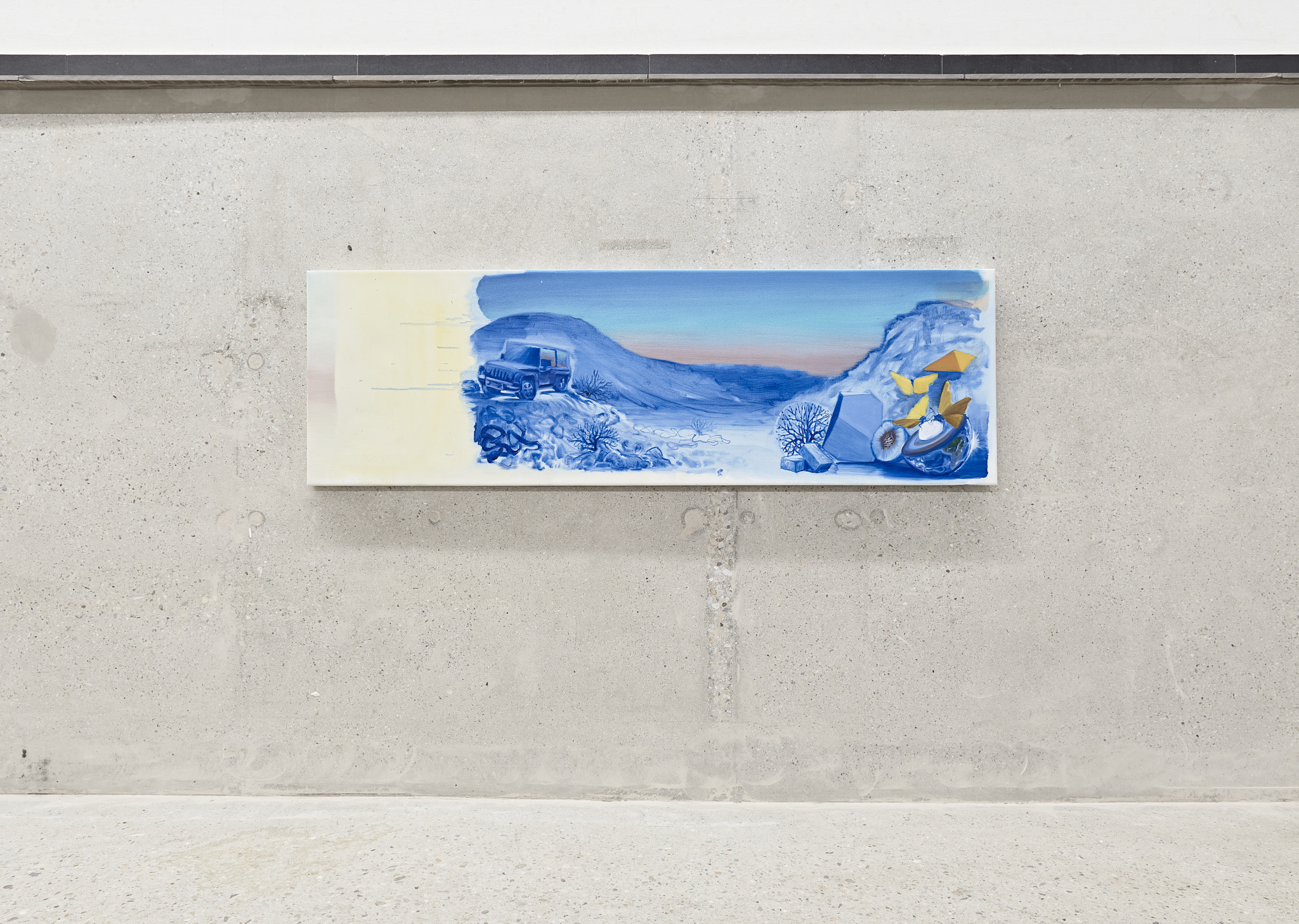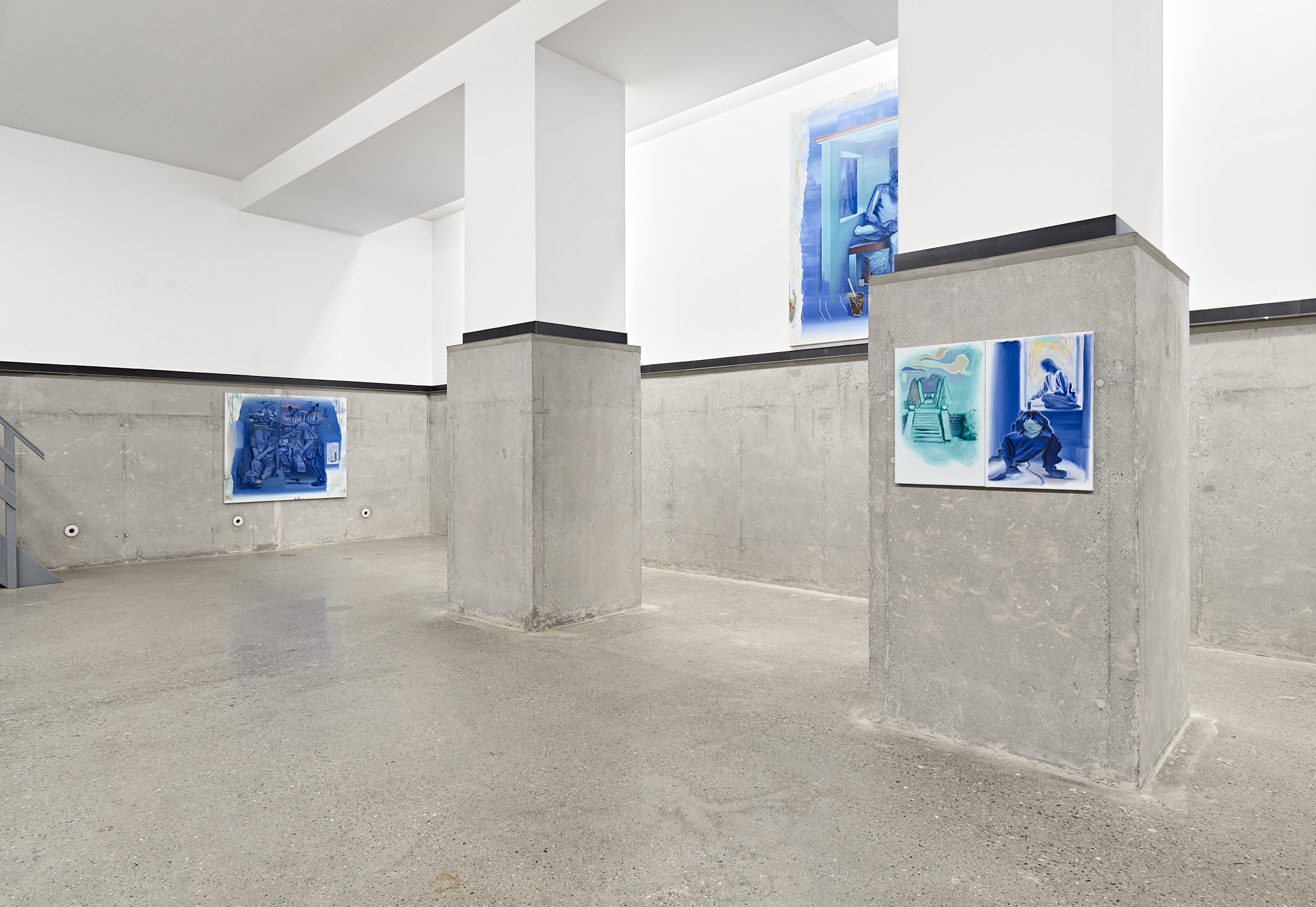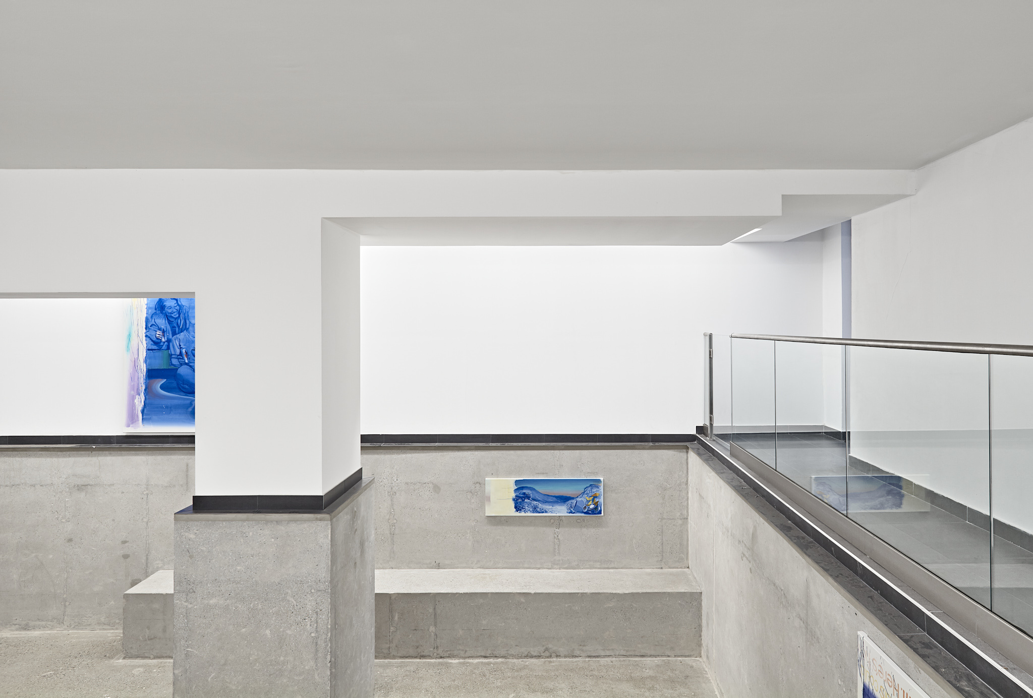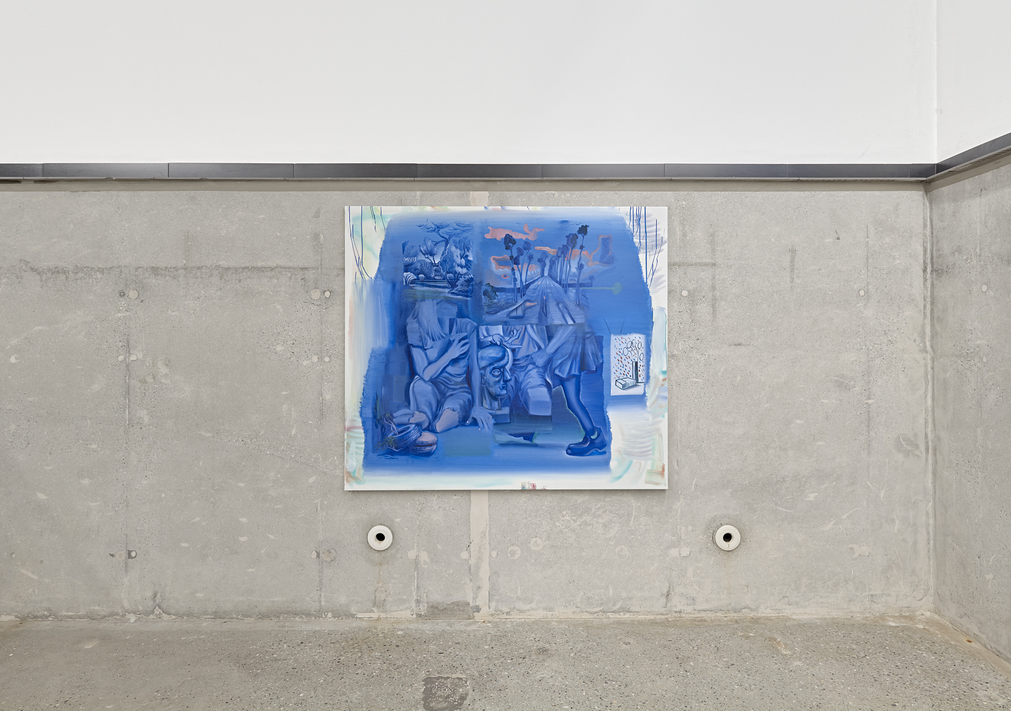 Blue Marble Blue Marble, the title of Gábor Pintér’s exhibition, is inspired by a yet-to-be-realized installation. The concept centers around a dishwasher filled with unwashed plates, evoking and extending the scenes depicted in his paintings. On top of the imagined dishwasher sits a slab of blue marble—not a real material, but a fictional design element—which lends a strangely elegant and comforting presence to the domestic setting. According to the original plan, the paintings in this exhibition were to encircle this installation, creating a visual and conceptual loop between the sculptural and the pictorial. The paintings are structured around dualities. Each work plays with human recognition and perception. What initially appears abstract gradually reveals a figurative composition, encouraging the viewer to shift between visual modes. Seemingly ordinary, everyday scenes begin to tilt toward the transcendental through subtle compositional disruptions. This delicate balance between the familiar and the transcendent is a hallmark of Pintér’s approach. Gábor Pintér, born in 1983 in Budapest, is a contemporary Hungarian painter known for his vivid, collage- like compositions that blur the lines between realism, abstraction, and symbolic imagery. He studied at the Hungarian University of Fine Arts, where he developed a distinctive visual language that merges gestural oil painting with conceptual precision and a strong sense of visual irony and play. In recent years, Pintér has incorporated large-scale chalk murals into his exhibitions, drawing directly onto gallery walls in conversation with his canvases. These ephemeral wall drawings deepen his investigation into time, surface, and spatial experience, expanding his practice beyond traditional painting into immersive installation. Pintér received the Ludwig Prize in 2007 and has exhibited widely in Hungary and abroad. His recent solo shows include exhibitions at Mega Foundation in Stockholm and the Institute of Contemporary Art in Dunaújváros. He has participated in international group exhibitions at Albert van Abbehuis in Eindhoven, the Ludwig Museum in Budapest, Košice Cultural Centre, and UGM in Maribor. His work is held in major public collections including the Hungarian National Gallery and the Ludwig Museum Budapest. In Blue Marble, Pintér continues to explore how ordinary moments and materials can be reassembled into poetic visual environments. His work invites viewers to slow down, reconsider what they think they see, and find meaning in subtle shifts between the everyday and the imaginary. Péter Bencze