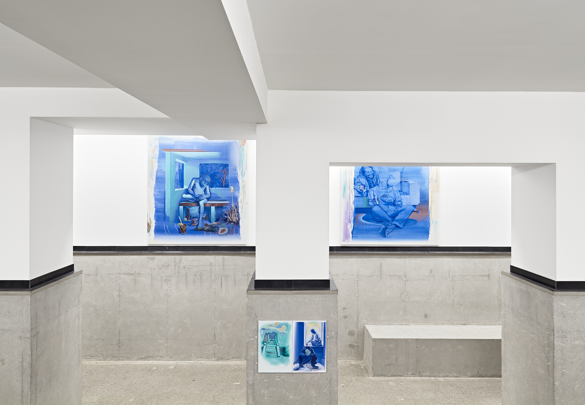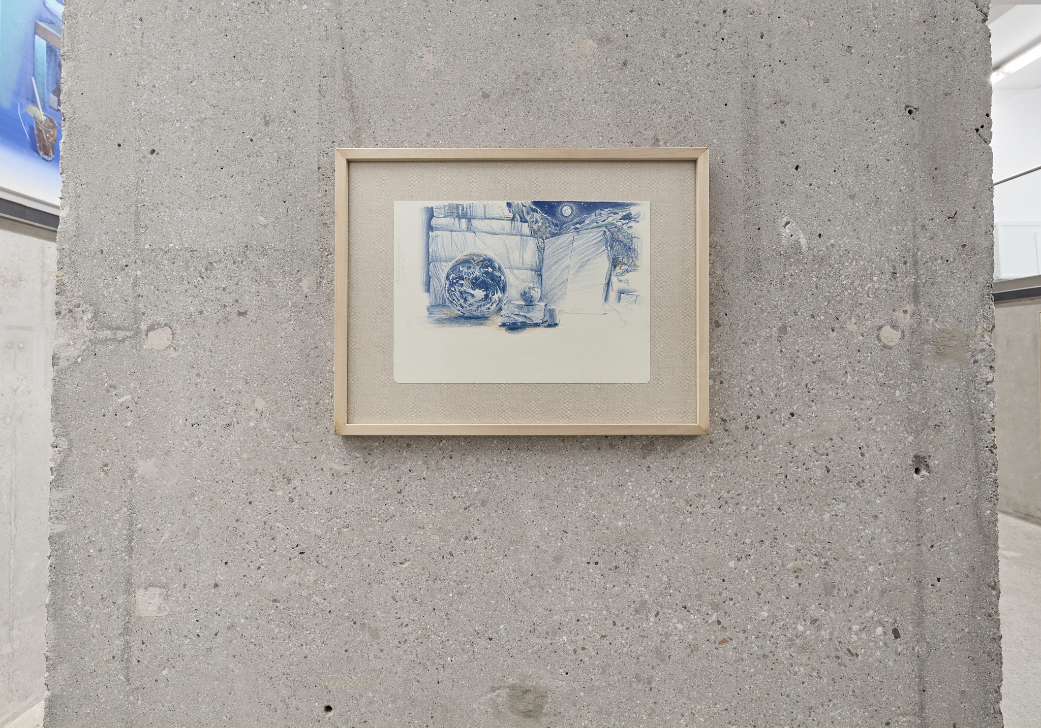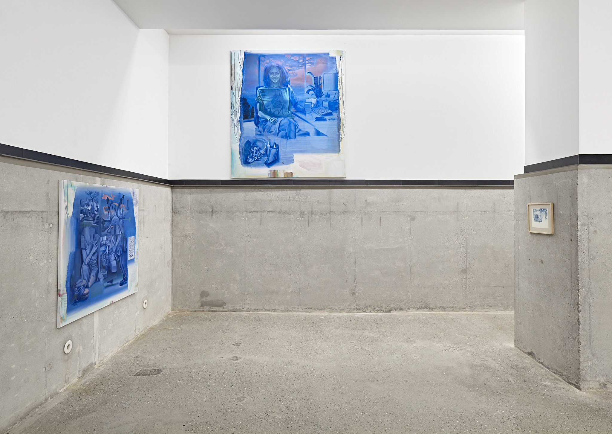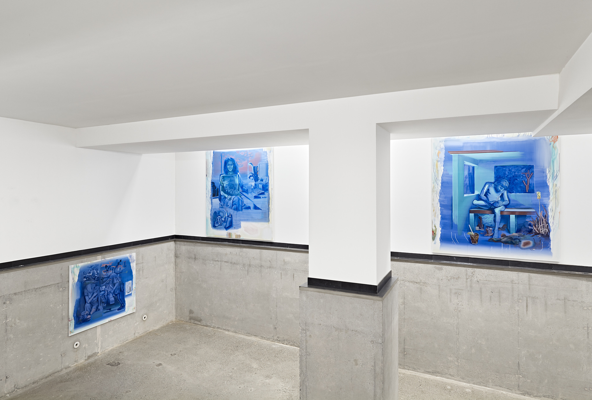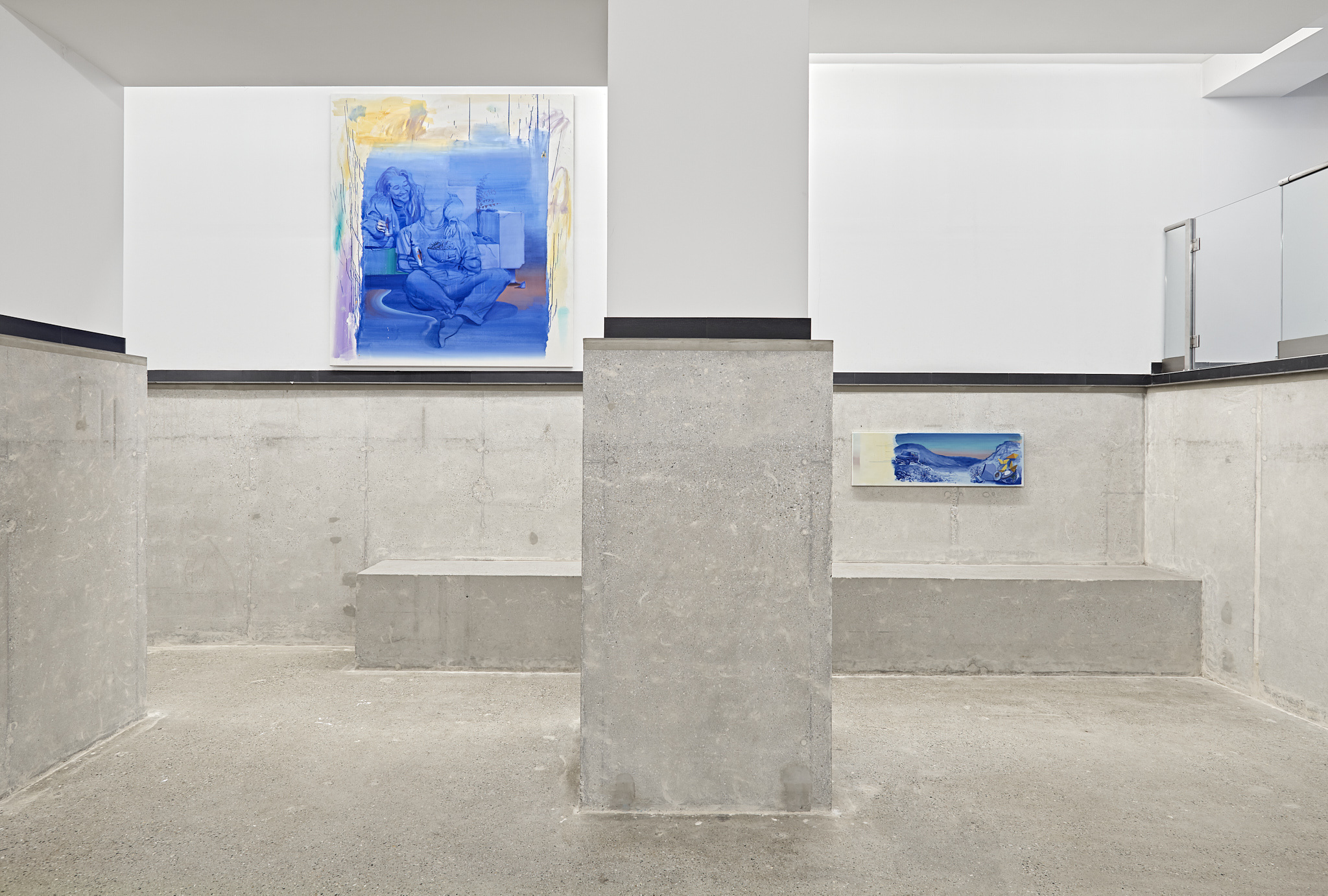 Blue Marble Blue Marble, the title of Gábor Pintér’s exhibition, is inspired by a yet-to-be-realized installation. The concept centers around a dishwasher filled with unwashed plates, evoking and extending the scenes depicted in his paintings. On top of the imagined dishwasher sits a slab of blue marble—not a real material, but a fictional design element—which lends a strangely elegant and comforting presence to the domestic setting. According to the original plan, the paintings in this exhibition were to encircle this installation, creating a visual and conceptual loop between the sculptural and the pictorial. The paintings are structured around dualities. Each work plays with human recognition and perception. What initially appears abstract gradually reveals a figurative composition, encouraging the viewer to shift between visual modes. Seemingly ordinary, everyday scenes begin to tilt toward the transcendental through subtle compositional disruptions. This delicate balance between the familiar and the transcendent is a hallmark of Pintér’s approach. Gábor Pintér, born in 1983 in Budapest, is a contemporary Hungarian painter known for his vivid, collage- like compositions that blur the lines between realism, abstraction, and symbolic imagery. He studied at the Hungarian University of Fine Arts, where he developed a distinctive visual language that merges gestural oil painting with conceptual precision and a strong sense of visual irony and play. In recent years, Pintér has incorporated large-scale chalk murals into his exhibitions, drawing directly onto gallery walls in conversation with his canvases. These ephemeral wall drawings deepen his investigation into time, surface, and spatial experience, expanding his practice beyond traditional painting into immersive installation. Pintér received the Ludwig Prize in 2007 and has exhibited widely in Hungary and abroad. His recent solo shows include exhibitions at Mega Foundation in Stockholm and the Institute of Contemporary Art in Dunaújváros. He has participated in international group exhibitions at Albert van Abbehuis in Eindhoven, the Ludwig Museum in Budapest, Košice Cultural Centre, and UGM in Maribor. His work is held in major public collections including the Hungarian National Gallery and the Ludwig Museum Budapest. In Blue Marble, Pintér continues to explore how ordinary moments and materials can be reassembled into poetic visual environments. His work invites viewers to slow down, reconsider what they think they see, and find meaning in subtle shifts between the everyday and the imaginary. Péter Bencze