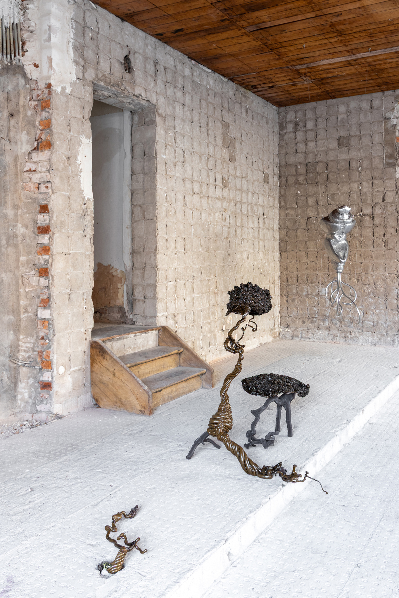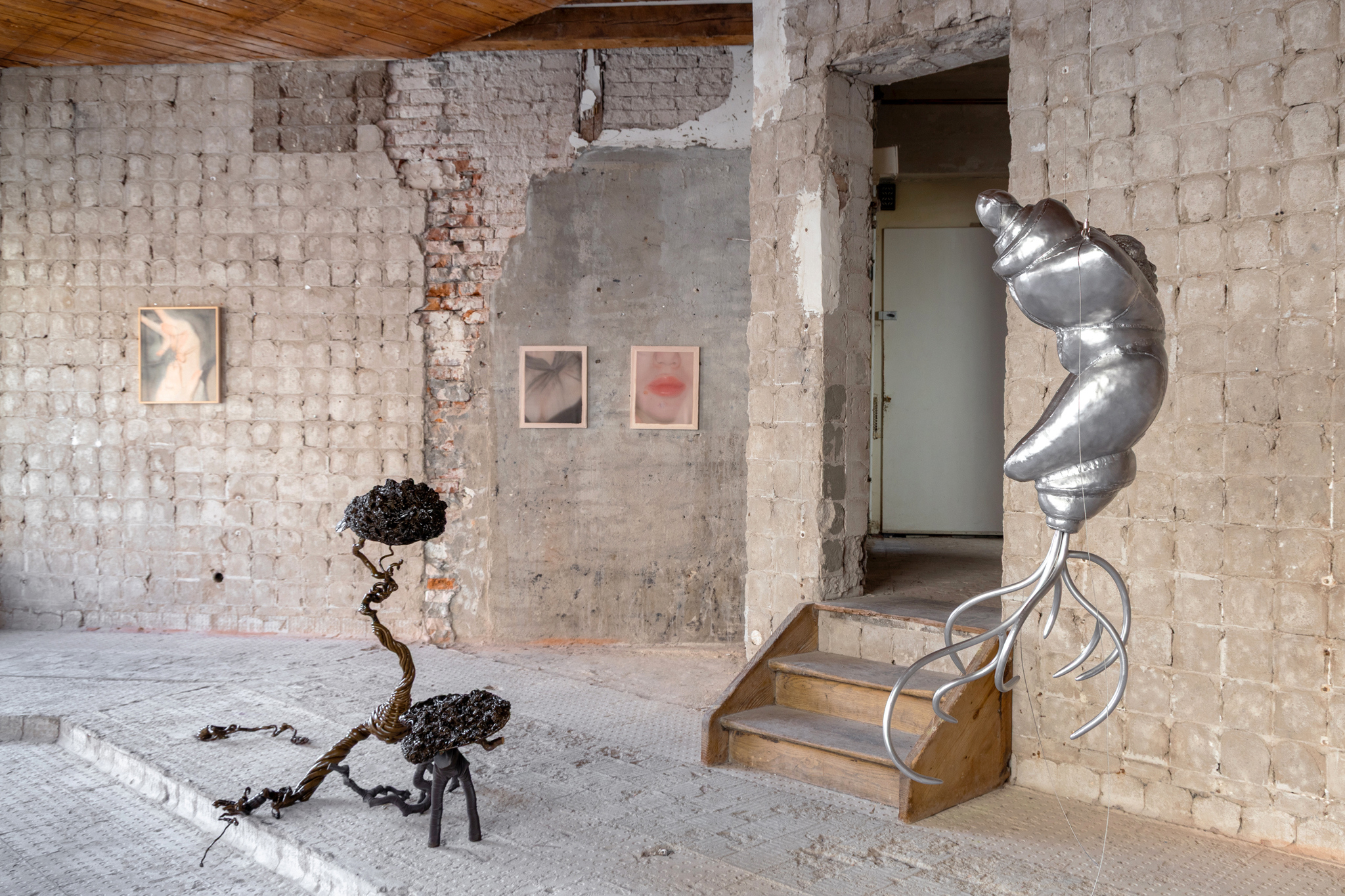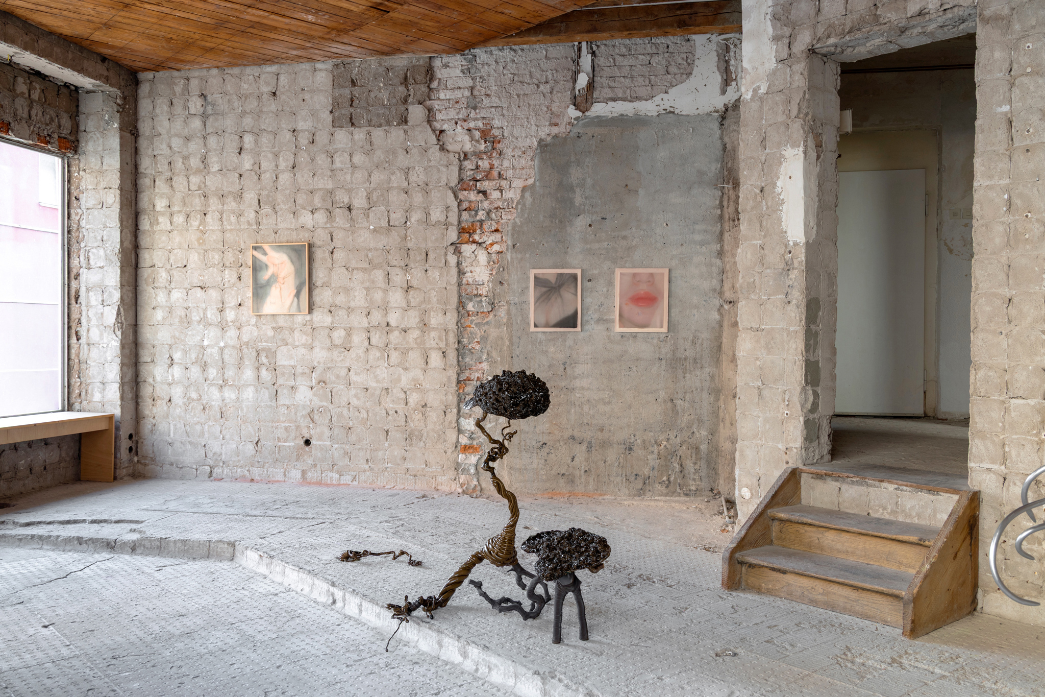 The twisted hazelnut branches and creased textiles of Dominik Stykâs objects open onto the pleasure parks of the 18th and 19th centuries, where hermits were employed as âliving ornamentsâ - in German, as âSchmuckâ or jewellery - to live in grottos as part of the surrounding scenery. His interest lies in the act of cultivation, plants and animals shaped to suit human purposes, an undertaking which includes even the human body. The kind of grotesque forms we see in the exhibition - the spikes and piercings and the sense of immanent threat and disgust these harbour - all this we build for others to see. We sing in a way that others can hear and understand our song. This is why we sing so loud and so clear, so our voice carries ever further and our circle is ever wider. We build our homes and carry them with us so that we have a place into which we can retreat, giving us strength to fulfil our tasks. But we also build our home with the other in mind, so that they can admire the apparent solidity of our walls. Donât look though at what I have built for you - mum, mum, look at me! Over here! Look at me. I am over here.