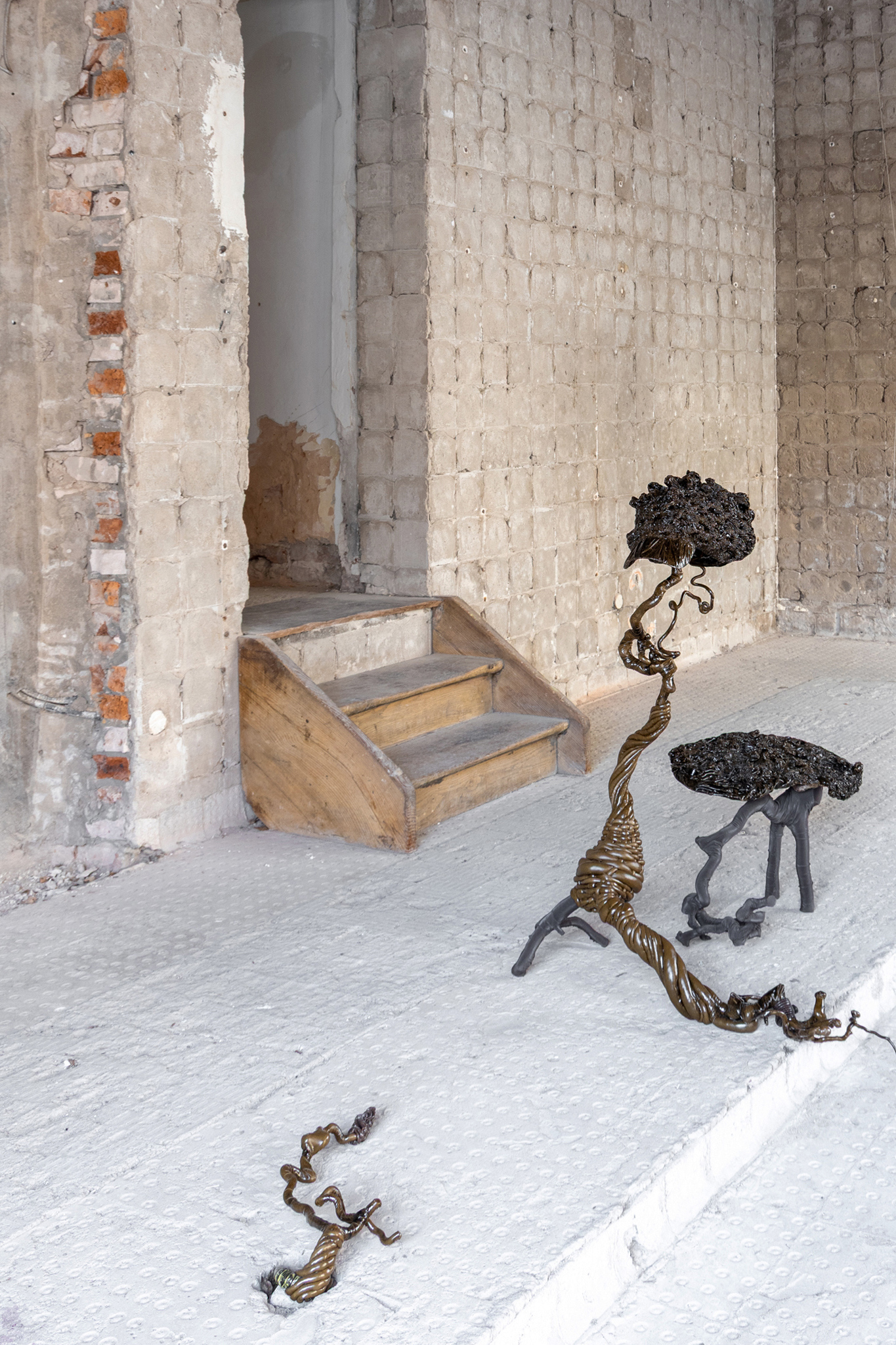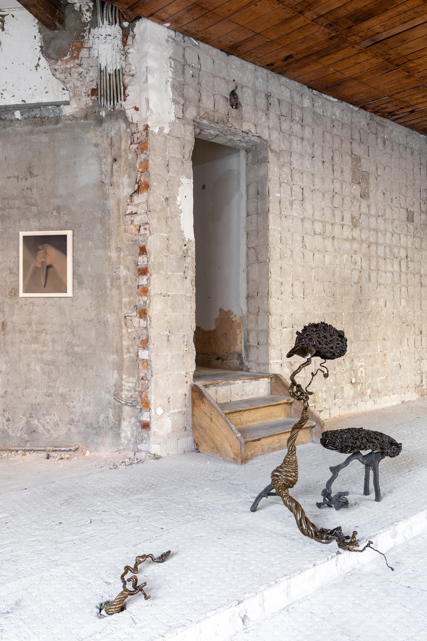 This kind of encircling that establishes a safe space serves a purpose. The organisation of space into an outside and an inside begets action, allowing us to accomplish things and fulfil tasks, as the barrier we build holds off those forces of chaos that threaten to overcome us. We sing before battle, a child hums in the dark. We feel strong - we can face⊠anything. But in so doing we also declare our presence to others. I am describing an affective state, the way my presence is registered by others around me in my immediate environment. For the curator of the exhibition âUnderneath Things,â Jieun Kim, this carving out of a territory, which is also the self-declaration of presence, she associates with the art practices of Glory Kim, Jinju Park and Dominik Styk. Her question is of strength in its visible form - for what is it that we see when you approach, what do I hear when you sing? Often this hides a paradox, as what we take to be a sign of strength, is the most flimsy of things. I now think of the tent made of sticks before Melancholia collides with earth. It is the very fierceness with which we declare ourselves - a child always holds their stick very tightly and sings very loud - that gives the impression of armour, with its spikes and horns and other grotesque features. And the point would be, to look underneath.