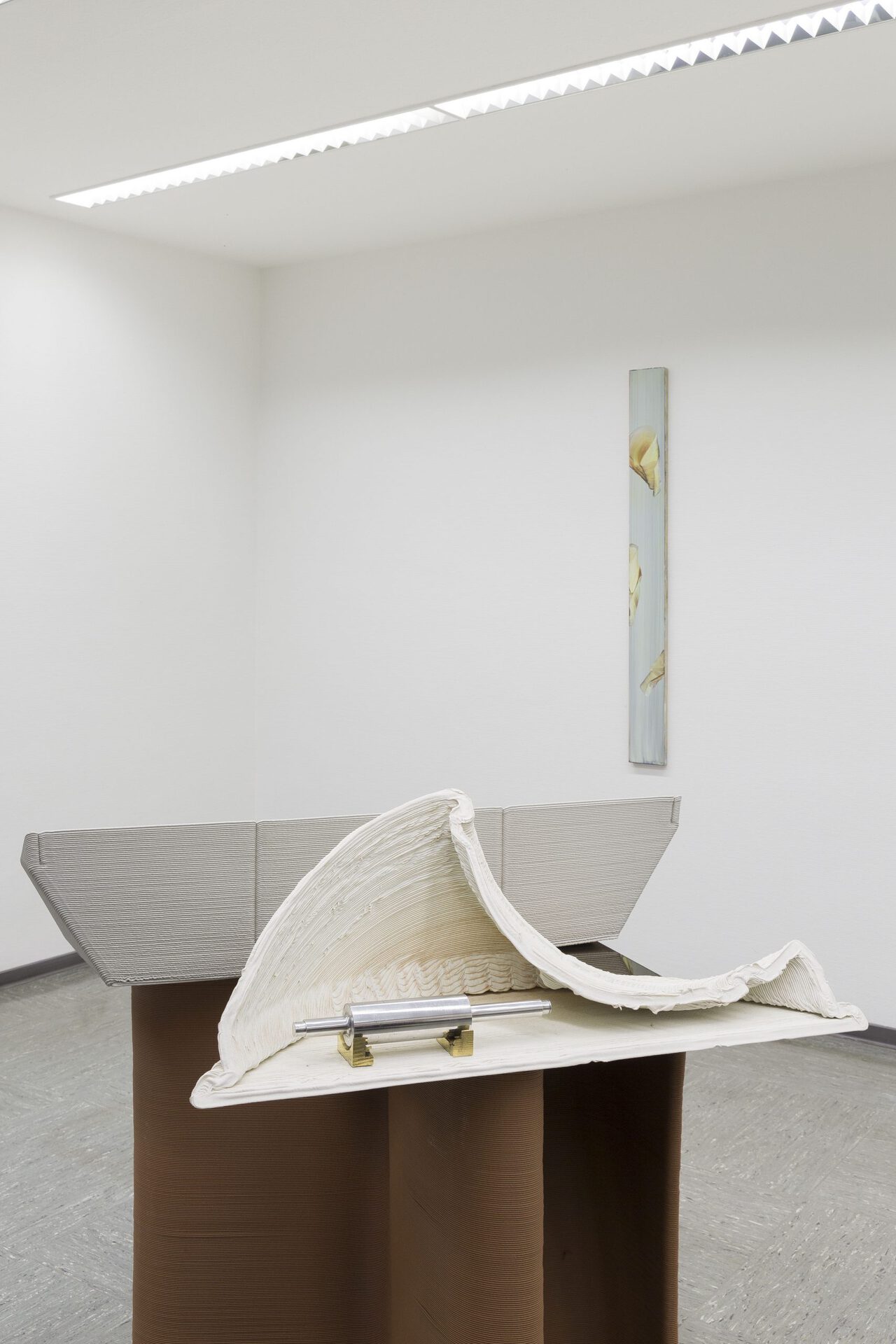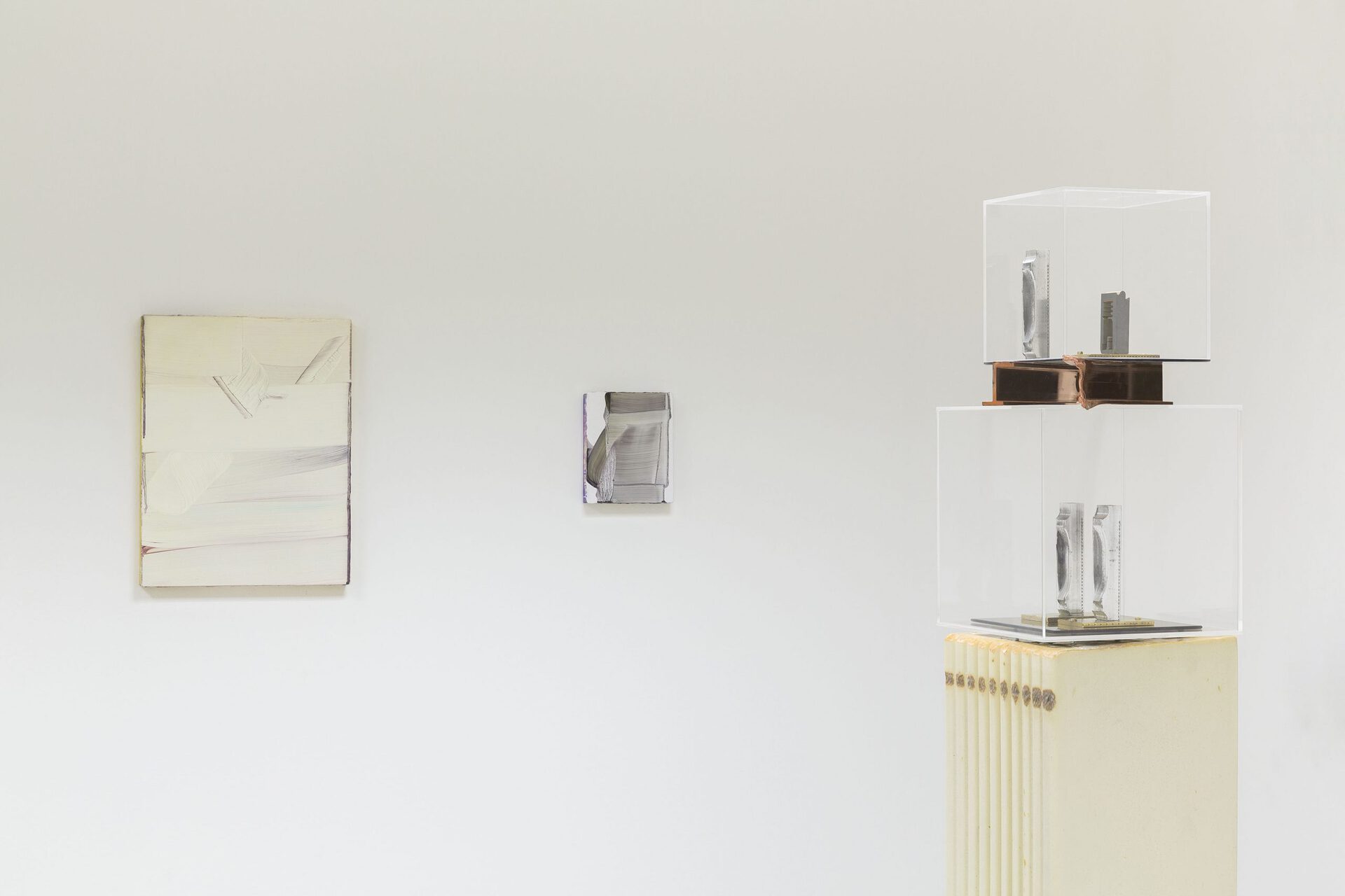 Im Zwiegespräch mit Sailes malerischen Begegnungen setzt sich David Jablonowski mit der Provenienz von Gebrauchsgegenständen und digitalen Formen auseinander. Die Arbeiten sind Teil von zwei Werkserien, die entweder aus ausrangierten und defekten Industrieprodukten oder aus Nebenprodukten verschiedener professioneller 3D-Drucktechniken bestehen. Ein freistehender Sockel, hergestellt aus wiederverwendetem Bau-Styropor, dient als Basis. Darauf ruhen sorgfältig ausgewählte, vergoldete Metallobjekte. Diese sind fein säuberlich arrangiert und werden in einer geschützten Vitrine aufbewahrt. Dies deutet auf den zentralen Aspekt der Sorgfalt hin, den David in seinen Ansatz einbringt: die Pflege von etwas, das vielleicht viele gefährliche Erinnerungen birgt. Ihre Entstehungsgeschichte ist eine der industriellen Evolution und der marktgesteuerten Innovation, die eng mit dem aggressiv expandierenden System des freien Marktes verbunden ist, das Geschwindigkeit und Profit über alles andere stellt. Die kleinen Metallobjekte, die durch ihre Schönheit und Form bestechen, wurden produziert, um zwei verschiedene Positionen auf einer Großbaustelle in den Niederlanden miteinander zu verbinden, und dienten entweder als Träger für Kabel oder als Stützpfeiler. Doch das Konzept der Innovation wird hier nicht als gottgegebenes Wunder oder als Rettung aufgefasst, sondern als das schmerzhafte Nebenprodukt aggressiver kapitalistischer Strukturen, die auf den sehr alten und stillen Gesetzen von Angebot, Nachfrage und Ausbeutung beruhen – Regeln, die aktuell einen kritischen Punkt erreichen. Ursprünglich waren die Objekte für den Bau einer Brücke bestimmt. Die wichtigste und entwaffnendste Eigenschaft dieser Objekt- und Materie-Arrangements ist ihre Ehrlichkeit.