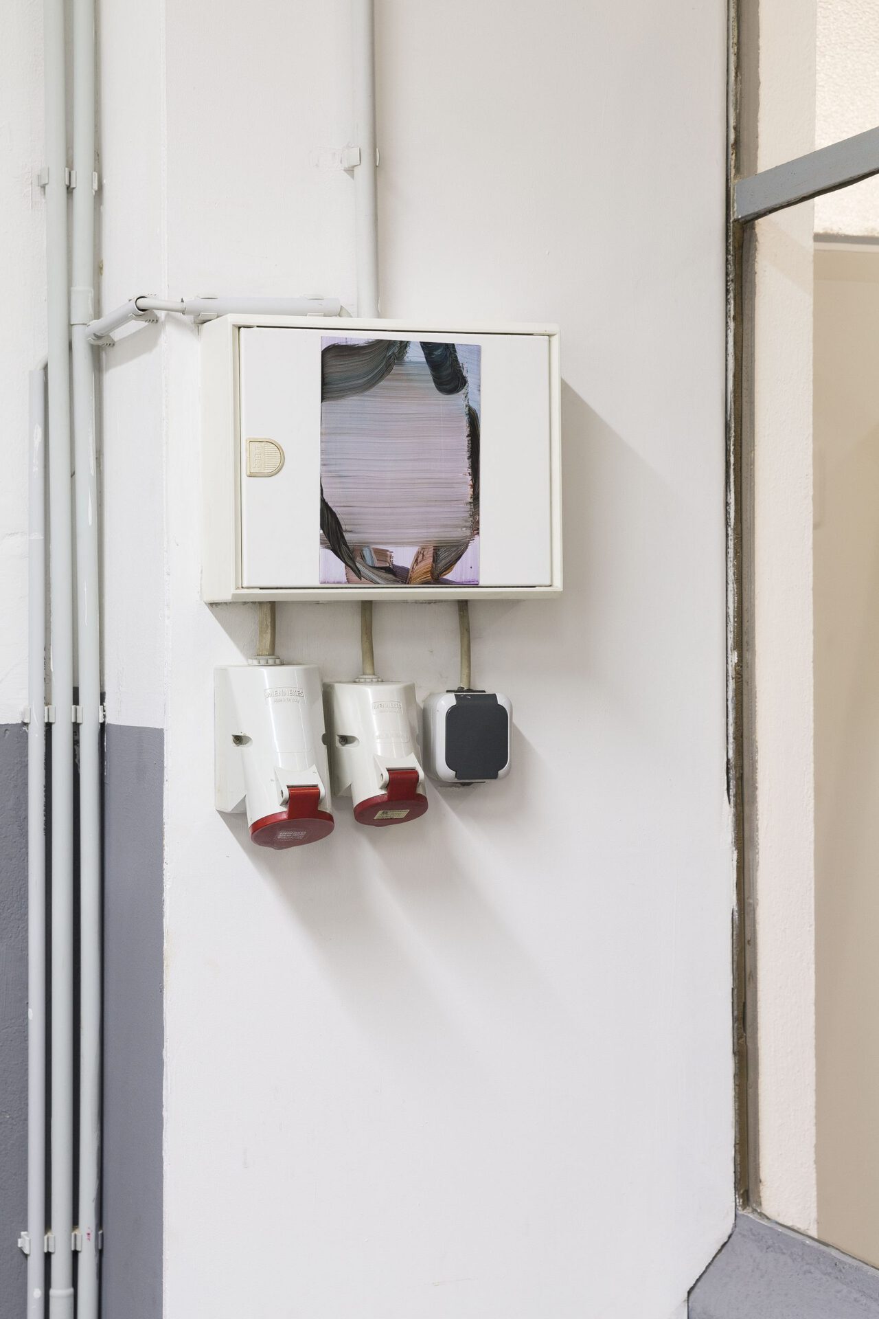 A notion of gestural “illusion” appears repeatedly throughout Markus’ work over the past five years. These motives were first introduced during his process (not necessarily intentionally) in a work made in 2016 and have ever since continued to fuse with distinct bodies of work made until today, thus reciting a common narrative that flows from one work to the next: connecting, binding. The form, which resembles the flicker of a wrist, or the trace of a painter’s gesture, charged with a grain of humor, sneaks into many works, and sits on top of coated brush strokes creating the visuality of a third space. For this show the artist worked on a larger scale work that features a selection of the flickered motive organized on a grid, hence nodding to knowledge-devices from the history of science, such as a periodic table or a species catalogue. In that sense these works are conceptual in their inception and manage to operate in a very critical way with their history. An engagement with their past and agency will slowly exit the plane of the painting and enter conceptual narratives. A distinct group of works is made with the use of store-bought magnets, which serve as a new support tethered to a different material character. The supporter of the image, a definitive notion of the Painterly, transitions to a new holding devise bearing the search for flatness that has ventured into the modality of the flatscreen.