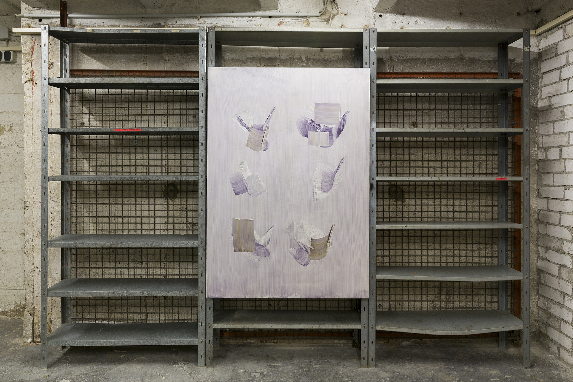 Eine bestimmte Auffassung der gestischen „Illusion“ zieht sich seit fünf Jahren wie ein roter Faden durch Markus’ Werk. Erstmals 2016 während des Arbeitsprozesses (nicht unbedingt bewusst) eingeführt, ziehen sich die entsprechenden Motive bis heute durch verschiedene Werkgruppen und rufen auf diese Weise ein gemeinsames Narrativ auf, das sich von einem Werk zum nächsten fortschreibt: verbindend, verbindlich. Eine Form, die der Spur eines Handgriffs oder einer malerischen Geste gleicht und mit einem Quäntchen Humor aufgeladen ist, taucht in vielen Arbeiten auf und setzt sich auf langgezogene Pinselstriche, wodurch der Anschein eines dritten Raums entsteht. Für diese Ausstellung hat der Künstler eine großformatige Arbeit entwickelt, bei der mehrere dieser Formen zu einem Raster angeordnet sind, das auf verschiedene Darstellungsinstrumente aus der Wissenschaftsgeschichte anspielt – etwa ein Periodensystem der Elemente oder ein taxonomisches Tableau. In diesem Sinne haben die Arbeiten in Mönchengladbach einen konzeptuellen Ausgangspunkt und beziehen sich auf eine kritische Weise auf ihre eigene Geschichtlichkeit. Die Auseinandersetzung mit ihrer Vergangenheit und Wirkung entfernt sich langsam von der malerischen Oberfläche hin zu konzeptuellen Erzählungen. Eine weitere Werkgruppe entsteht unter Verwendung von handelsüblicher Magnetfolie – einem neuen Trägermaterial, das über eine andersgeartete Stofflichkeit verfügt. Der Bildgrund, ein Inbegriff des Malerischen, wird zu einem neuen Träger für das Streben nach einer flatness, die sich in die Modalität des Flachbildschirms vorgewagt hat.