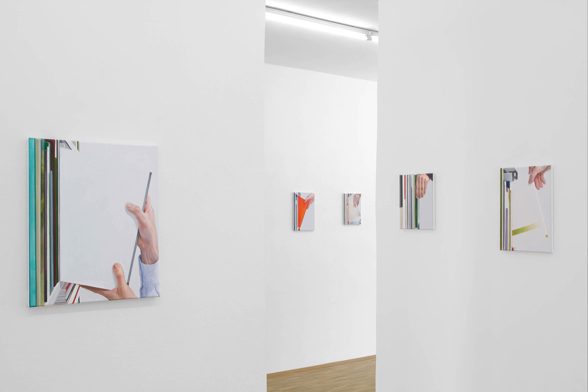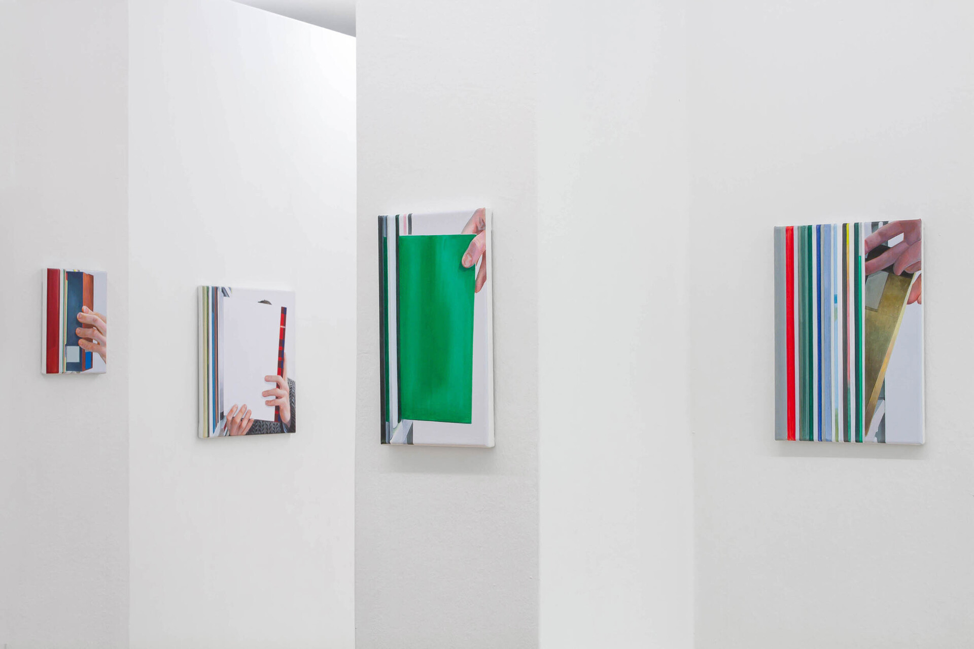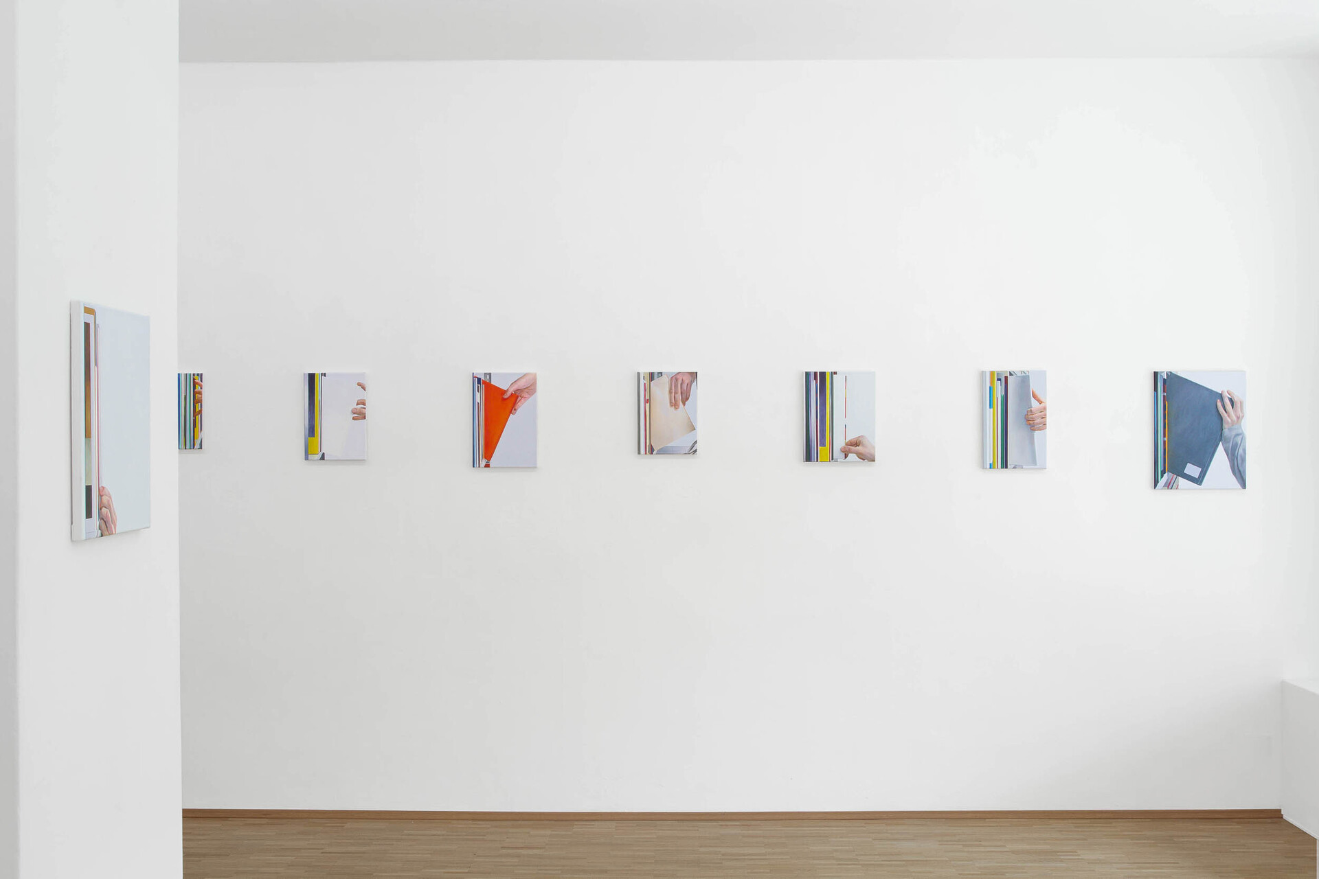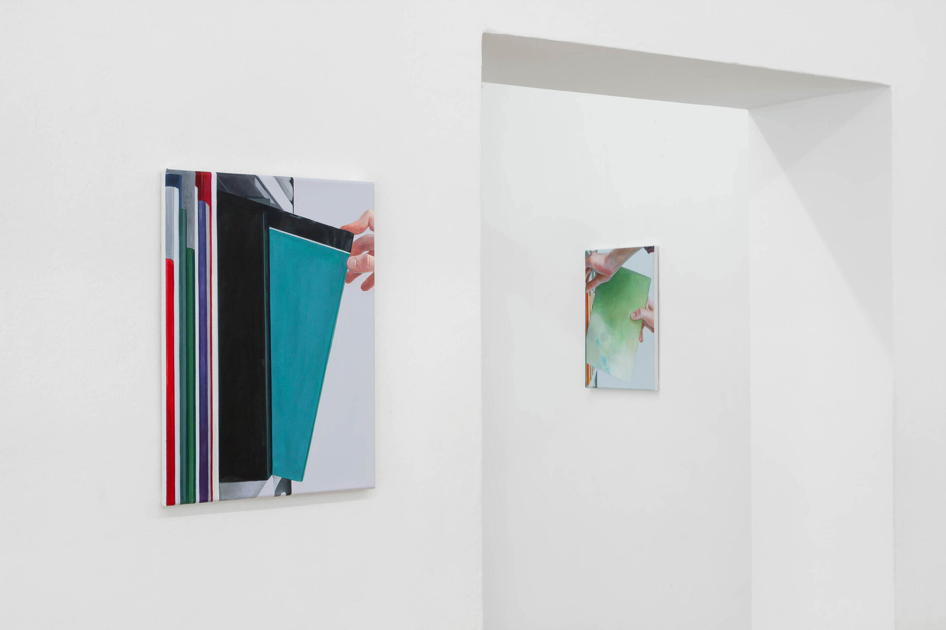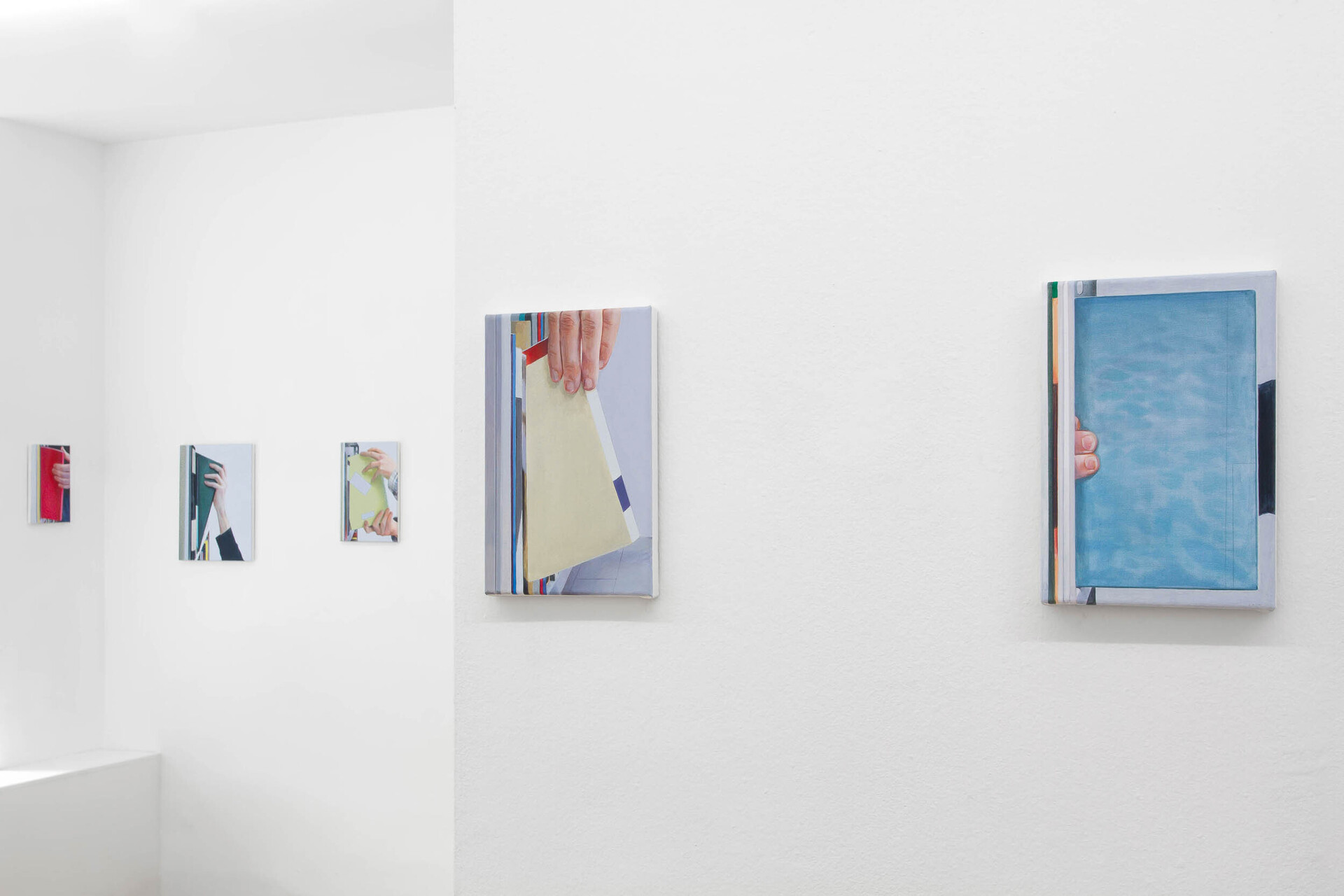 The body of work presented at the gallery depicts hands pulling books from, or putting them back onto shelves. The gestures of the respective painted hands are ambiguous. Though they are repetitive, the gestures are not identical. Each painting is unique in composition, size and color while the motif, a book pulled out / put back on a shelf by one or a pair of hands, stays the same.