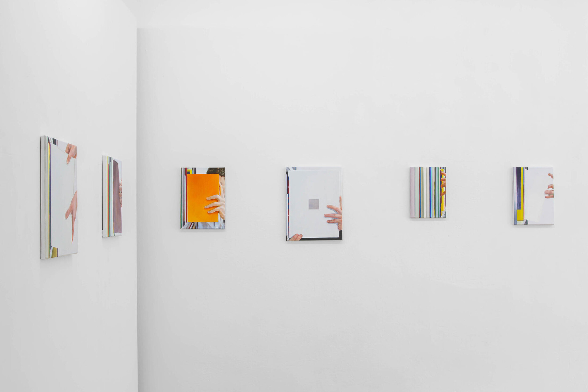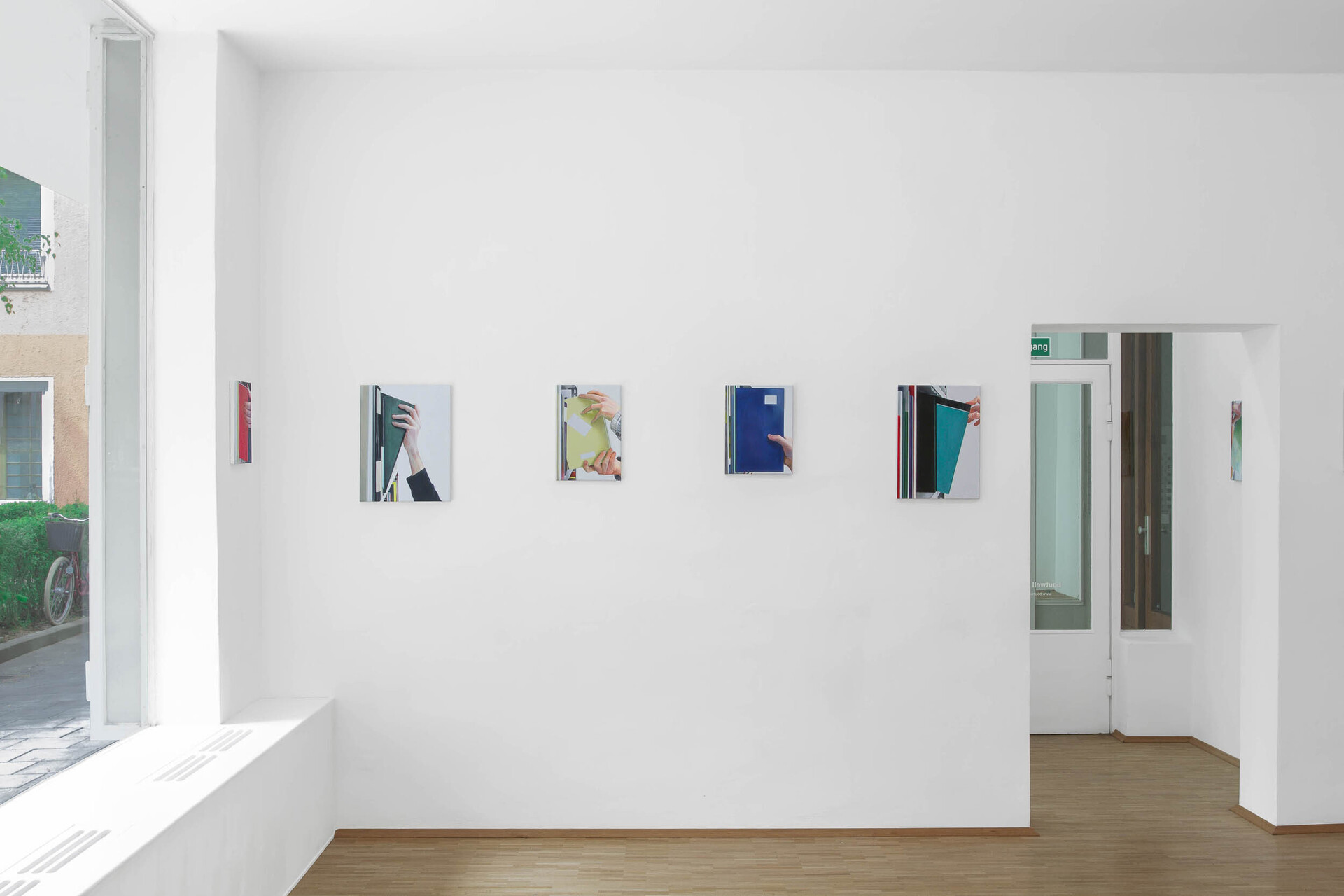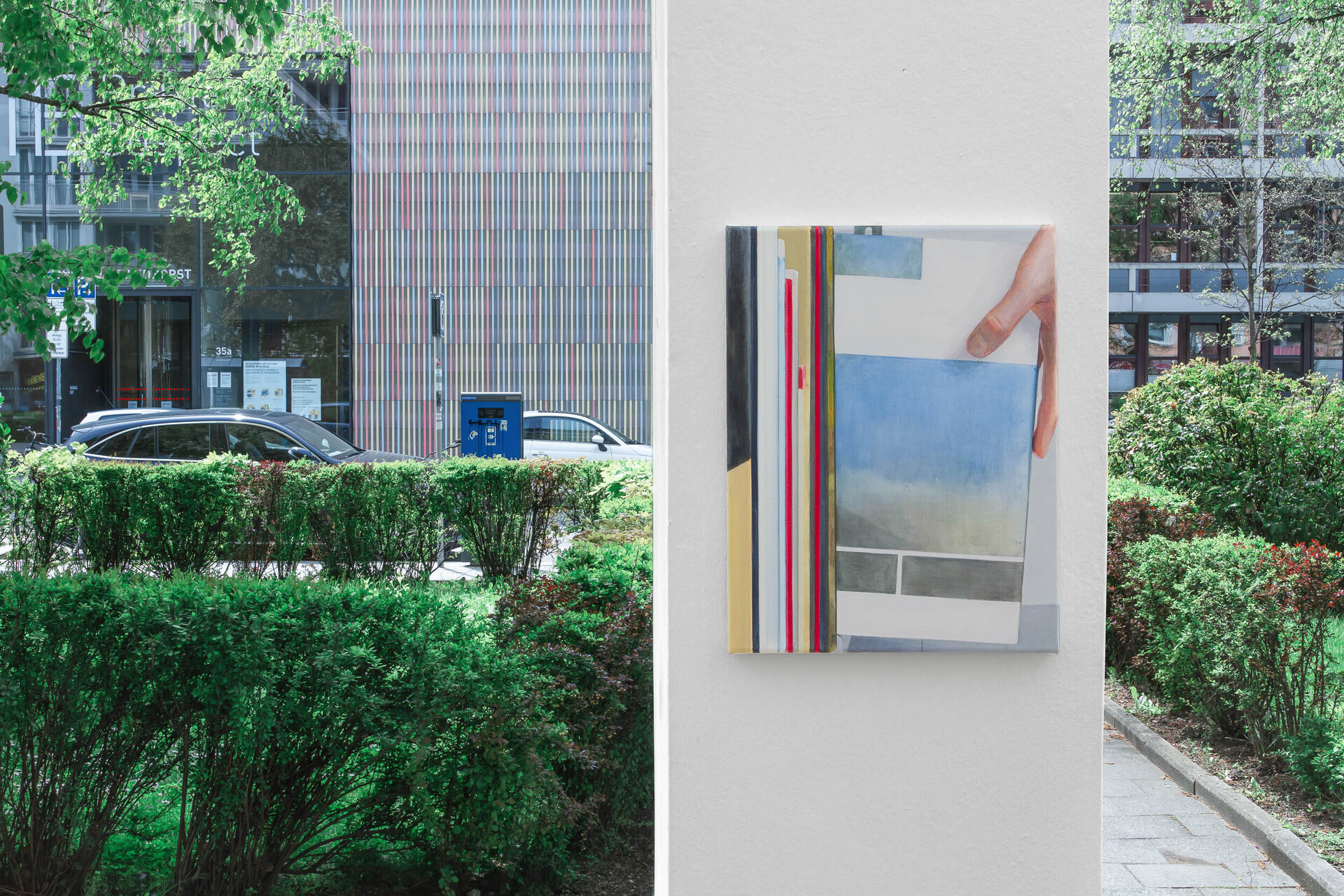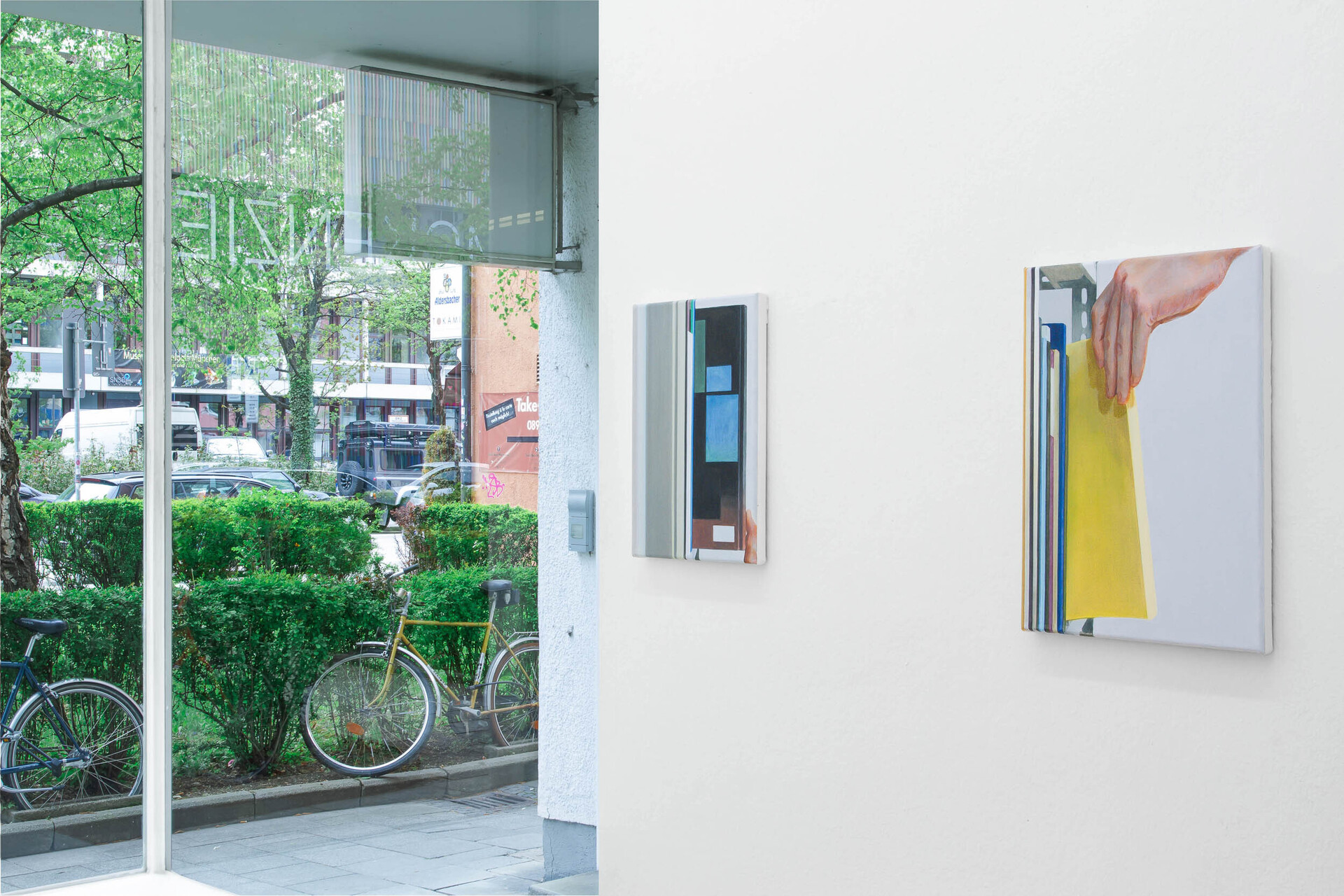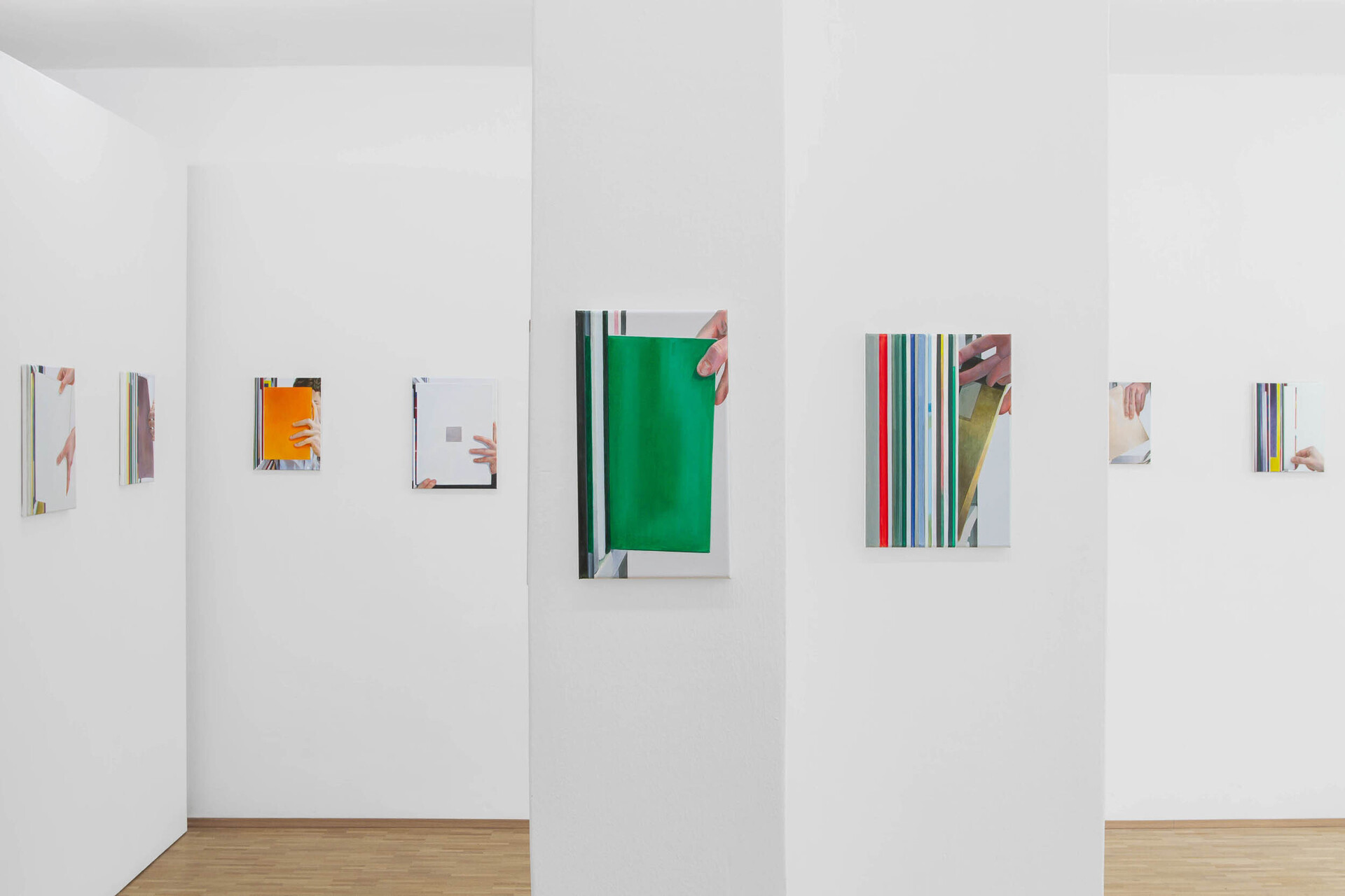 The body of work presented at the gallery depicts hands pulling books from, or putting them back onto shelves. The gestures of the respective painted hands are ambiguous. Though they are repetitive, the gestures are not identical. Each painting is unique in composition, size and color while the motif, a book pulled out / put back on a shelf by one or a pair of hands, stays the same.