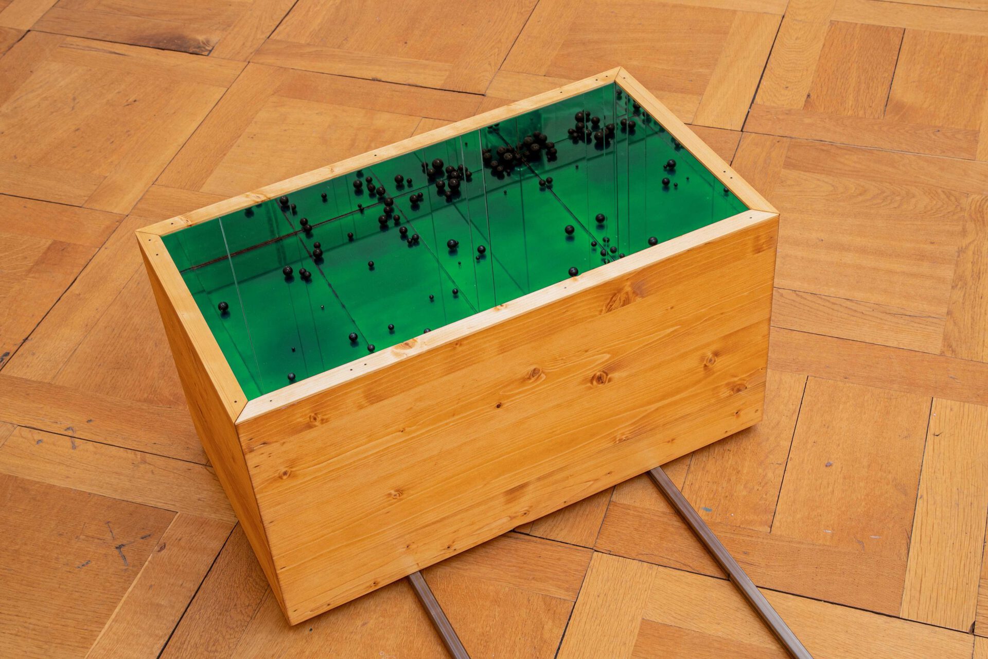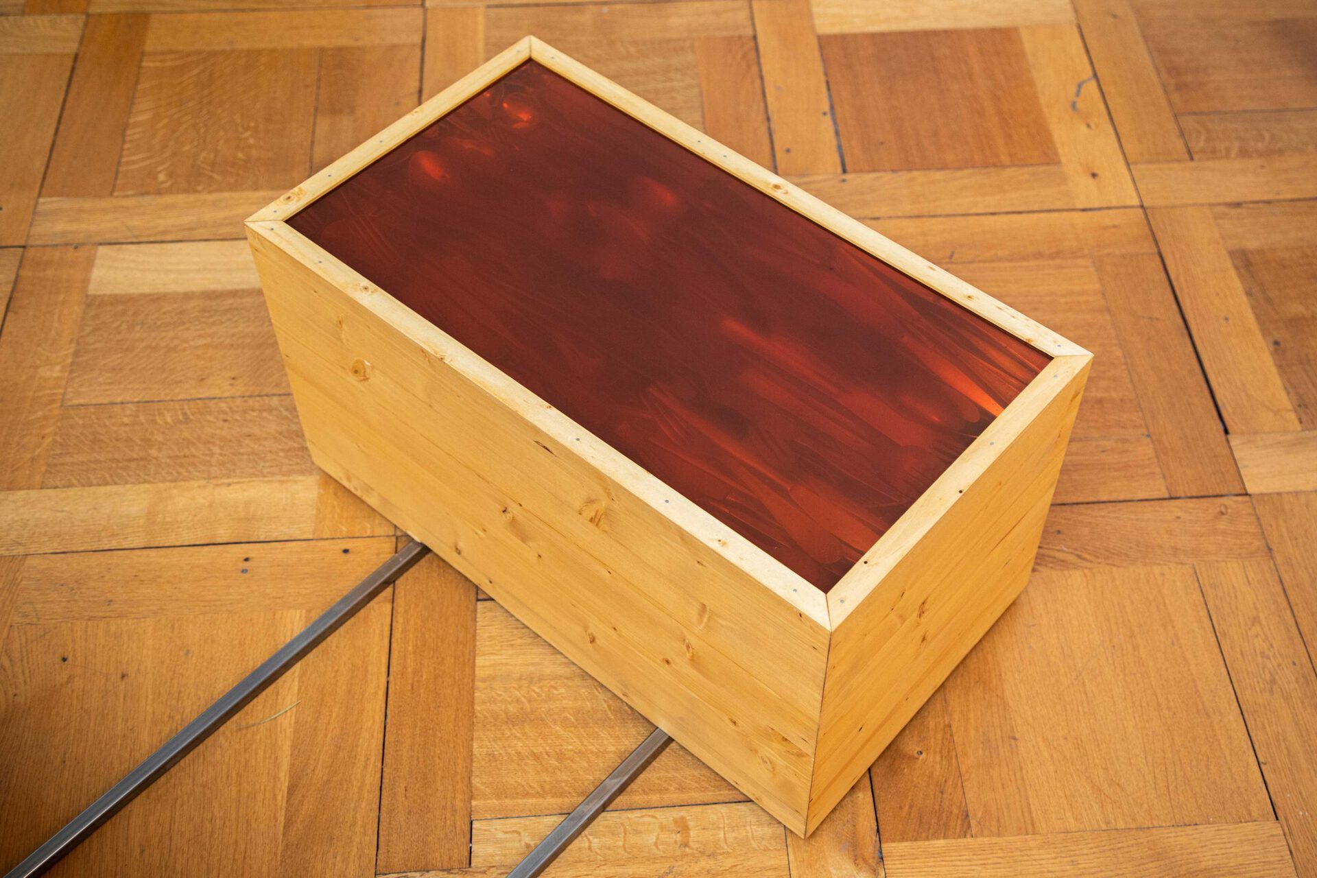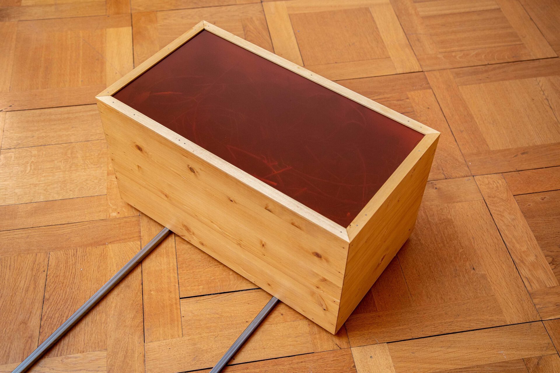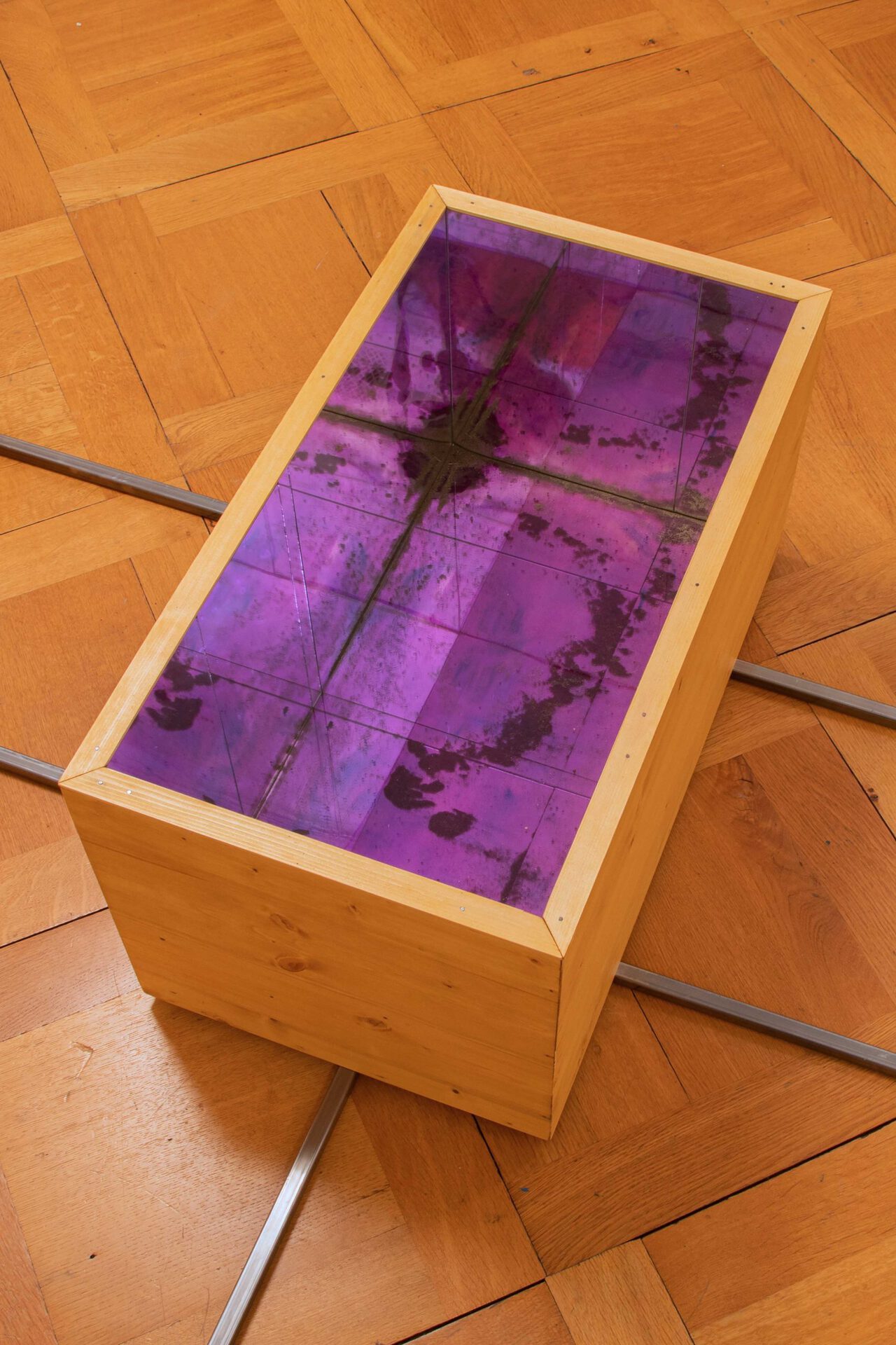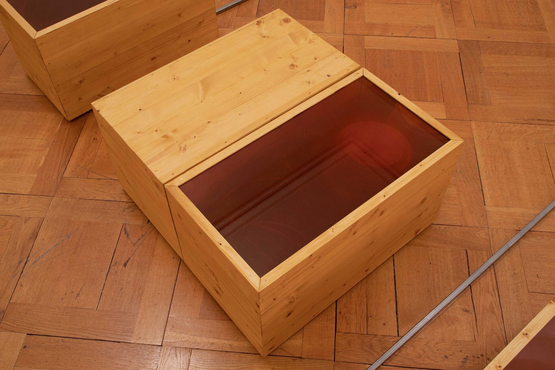 illusion, or a present moment that contains the past and is constantly destroyed, becoming the future. This notion of space-time seems to be swallowed by a singular box that stands out, a black box with mirrors on its inner walls that reflect a burnt, dark bottom. Maybe an error within this maze-like circuit, as a powerless memory box that is no longer capable of saving any data. Perhaps a consequence and