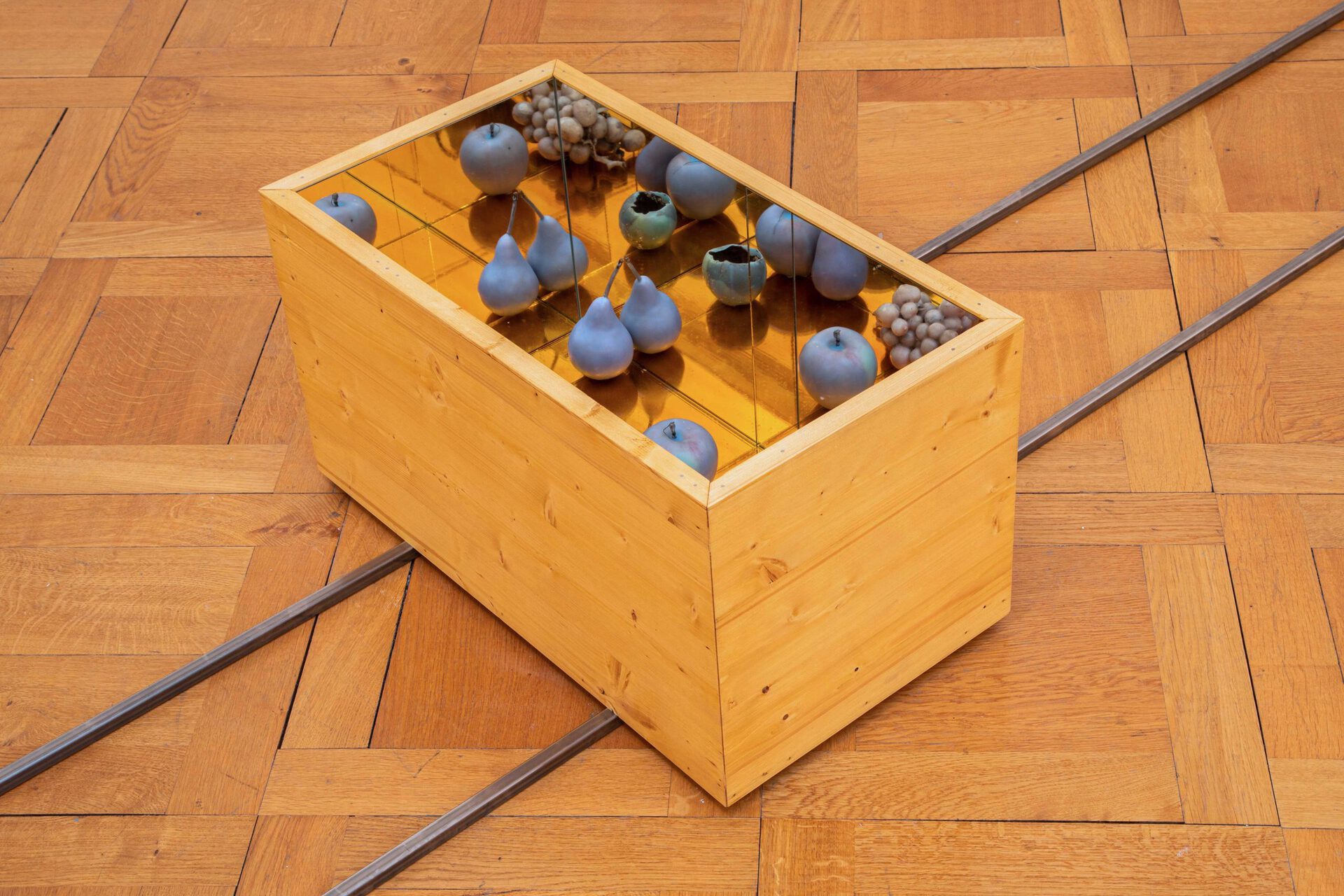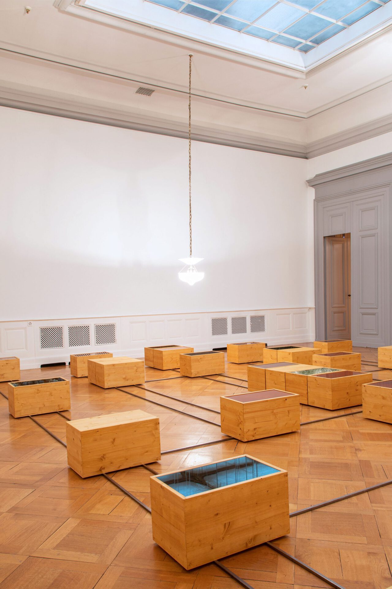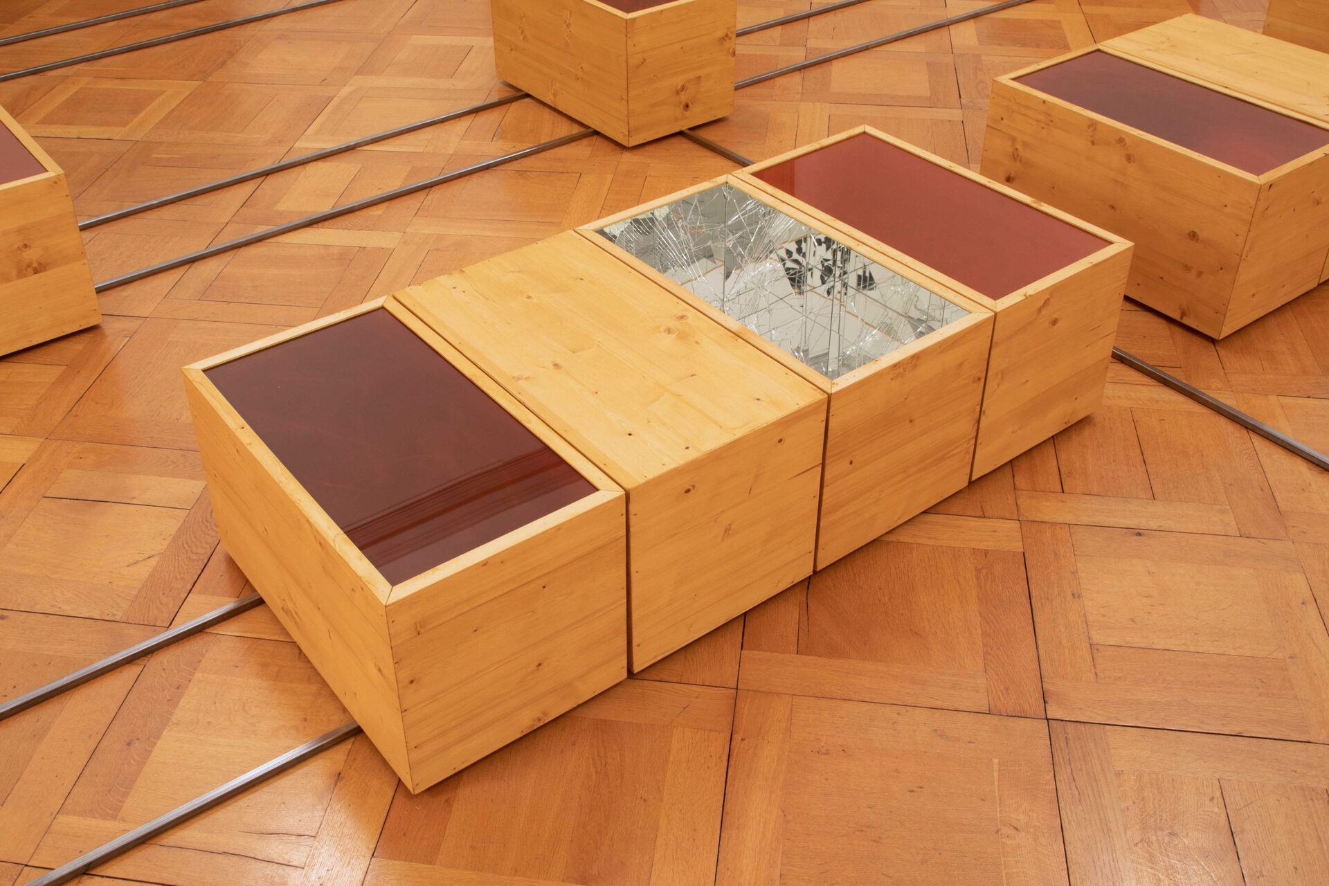 The visual effect of virtuality is created by the open sculptures, due to a game of mirrors lining the boxes from the inside that creates labyrinthine lines as they reflect themselves. The mirror allows fruition to occur between times, by managing to be utopia and heterotopia at the same time. A place without any place – the unreal, the virtual space – but that exists physically in geography, as a connection to the