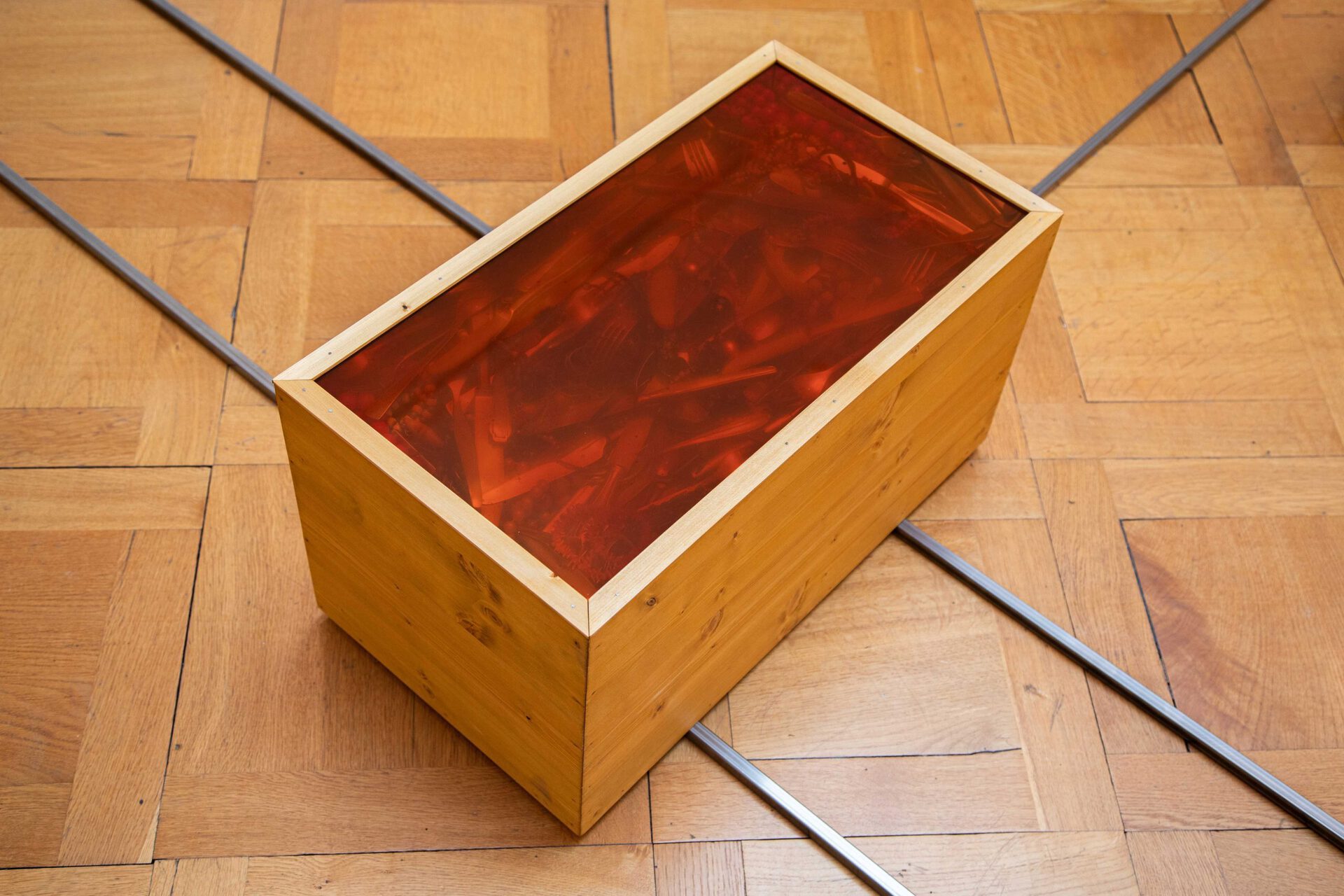 box. On it, each of them is the size of a moving box, the ones used to carry belongings from one place to another. Some are open, others are closed by translucent coloured glass, and yet others are upside down. The translucent coloured glasses protect a profusion of household objects, once part of a communion that may have nourished bodies – old china plates, glasses, and cutlery – organized, grouped, or piled, sometimes into broken pieces. Organic matter collected from empty lots, like weeds and climbing plants, surrounds these memories, simultaneously involving and invading.
