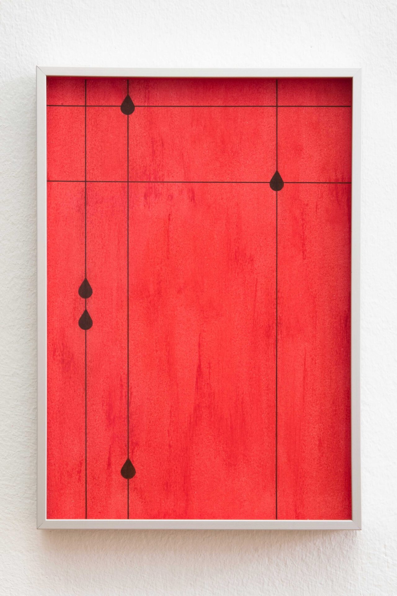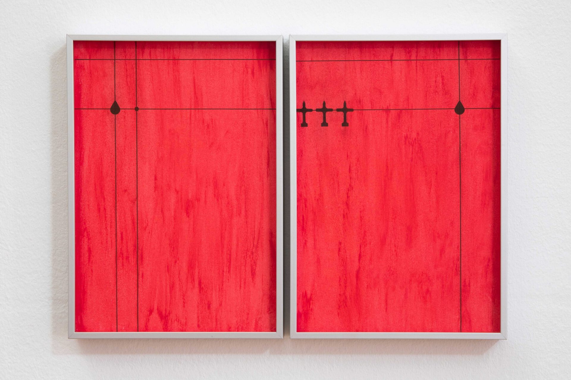 and vertical black lines build a symmetrical structure that are base for four symbols, some geometric forms, and some of an uncertain nature, such as a plane that can be a crucifix, or a teardrop that can be a pendant. The figures are strategically positioned throughout the boards, either aligned or at their intersections. Two upper horizontal lines, present on all the drawings, indicate a connection between them, perhaps of an undefined land map or parts of a board game with no start nor end, or even a music score that is written with dissonant notes.