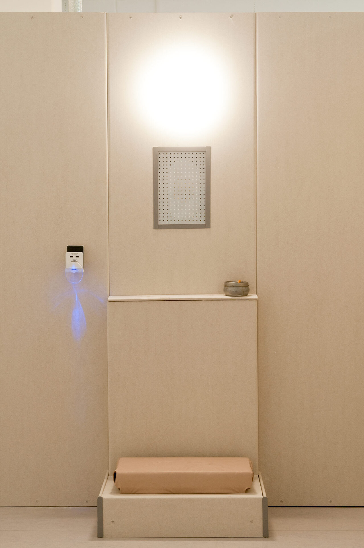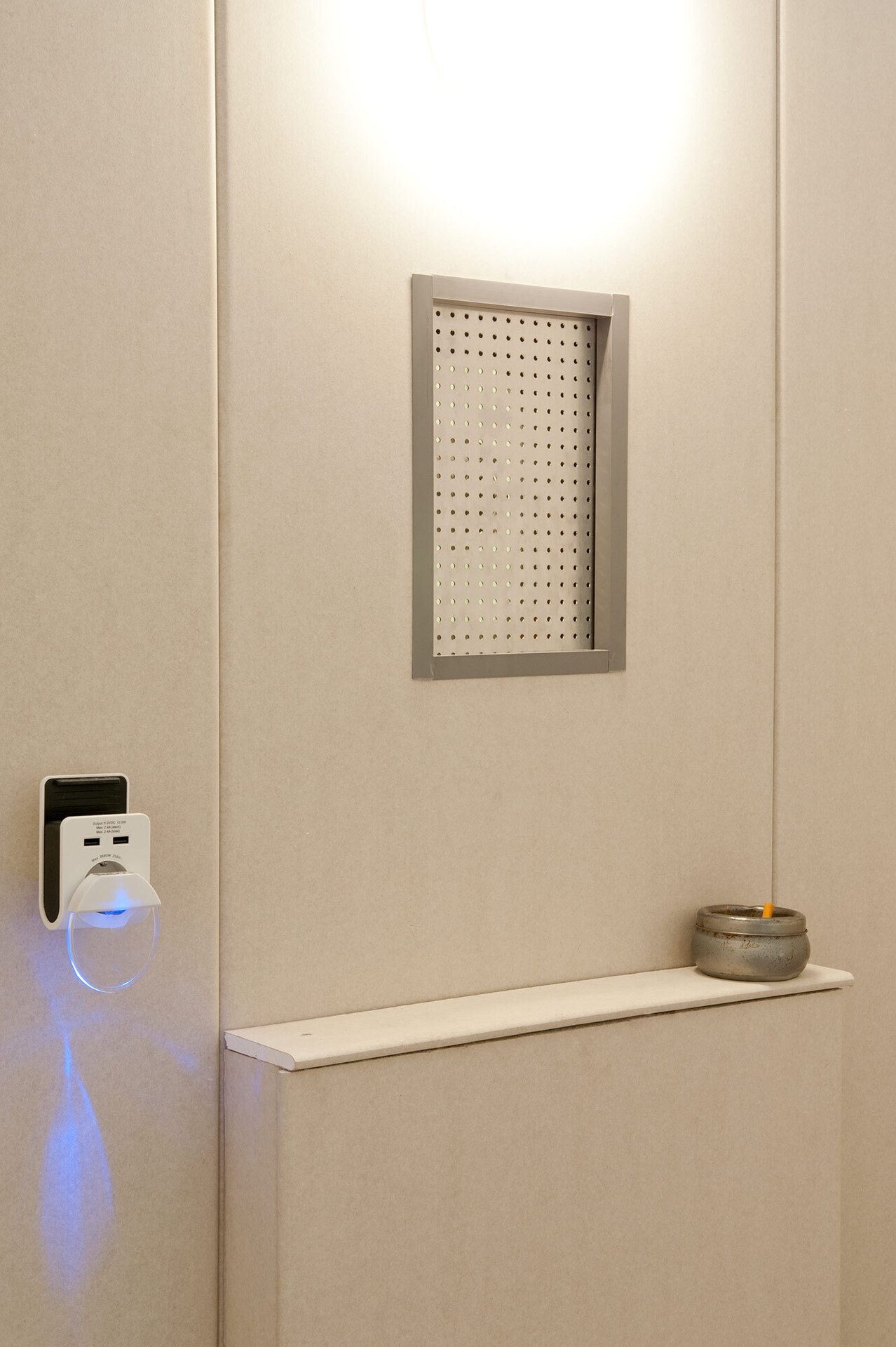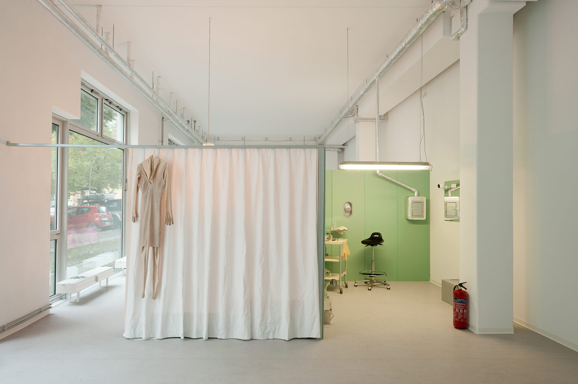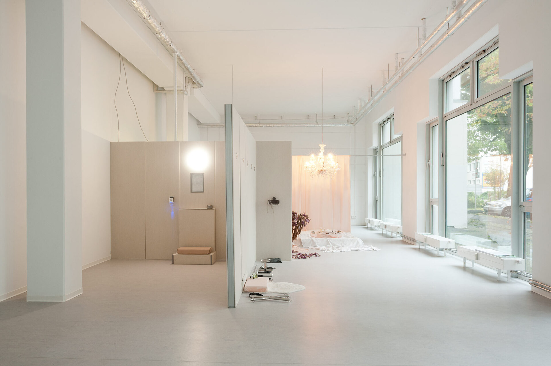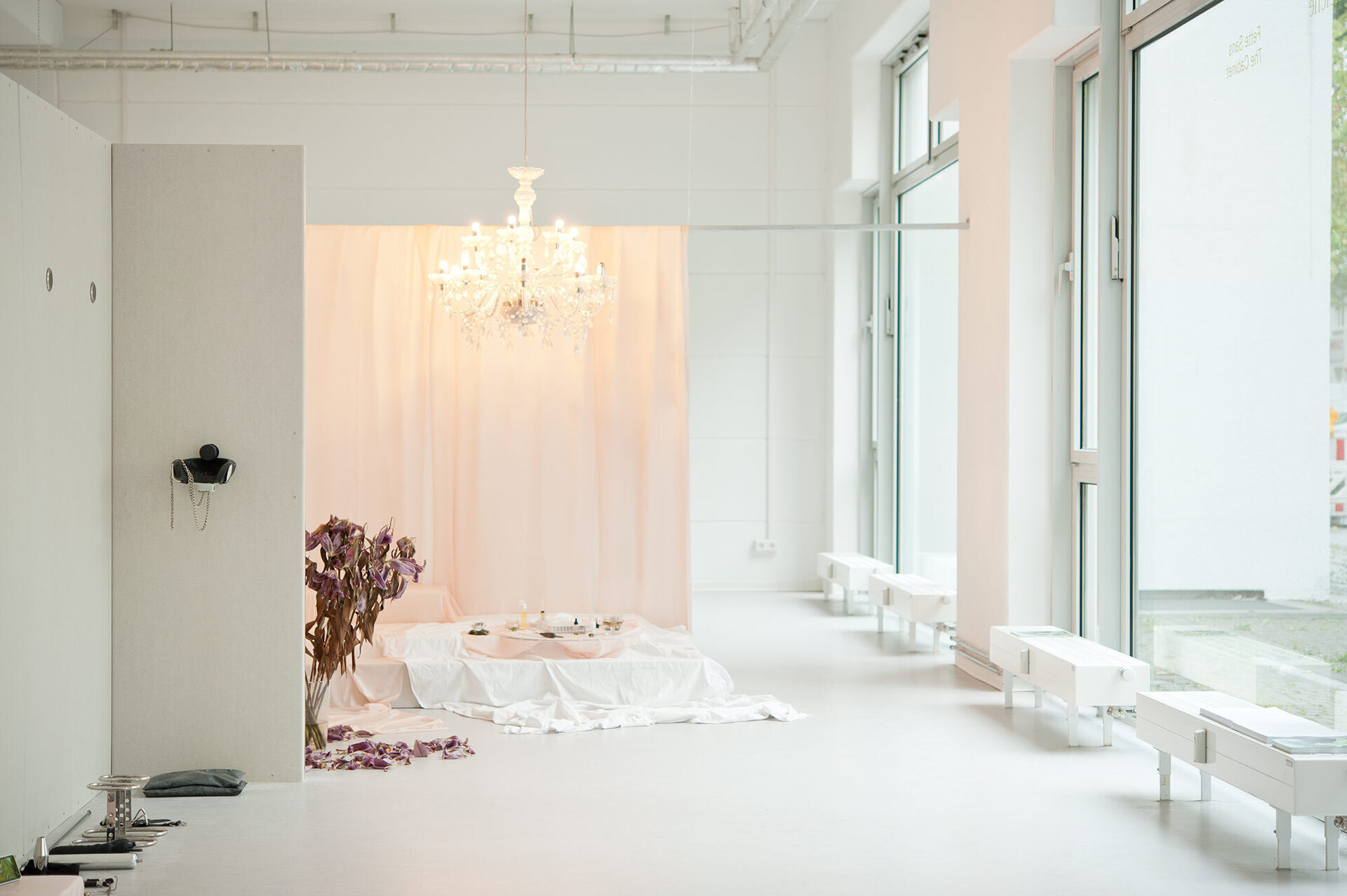 With her solo exhibition The Cabinet Fette Sans opens the program of the 2021 newly founded project space Neun Kelche in Berlin-Weißensee. In her installations Fette Sans orchestrates new realities and animates them with speculative narratives through her performances. With these framed rituals, Fette Sans repeatedly explores the boundary between closeness and distance. In the past, audiences have watched the artist inhabit a hotel room for five months, perform in a glass display in a subway underpass, and in a quarantine-room-like setting behind the now-ubiquitous plastic screen.The audience always remains physically at a distance, while simultaneously observing intimate monologues and private ceremonies.