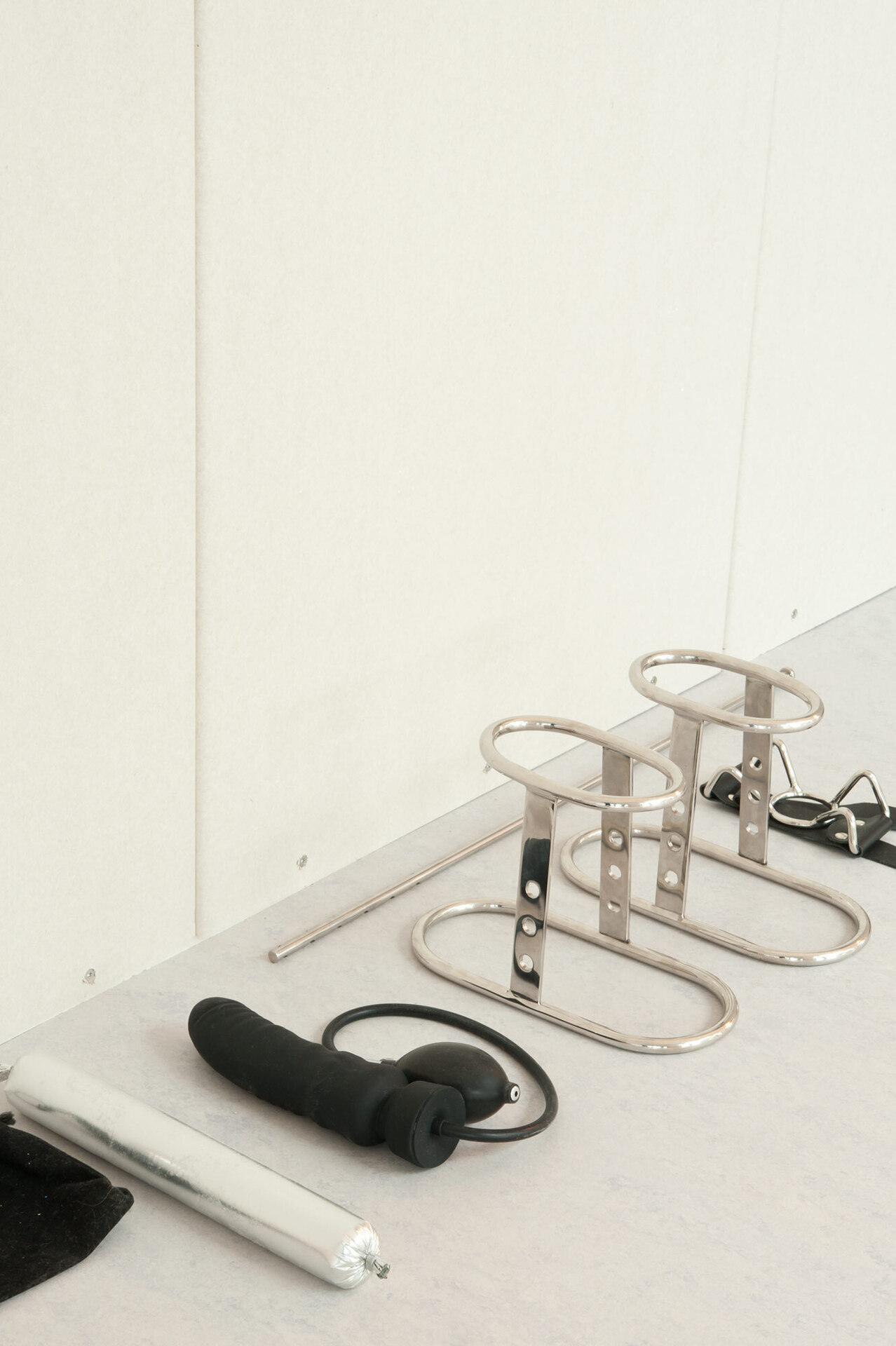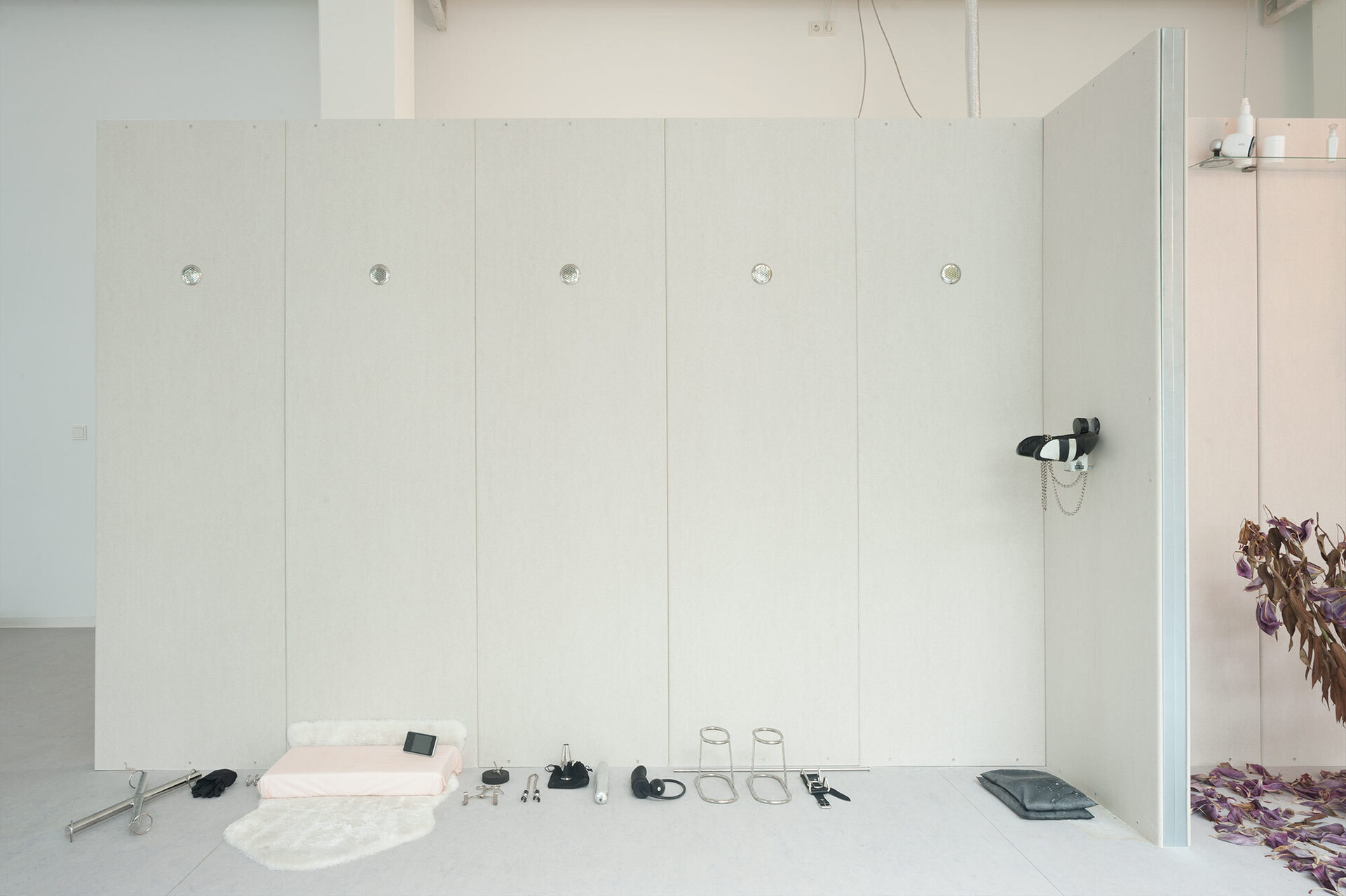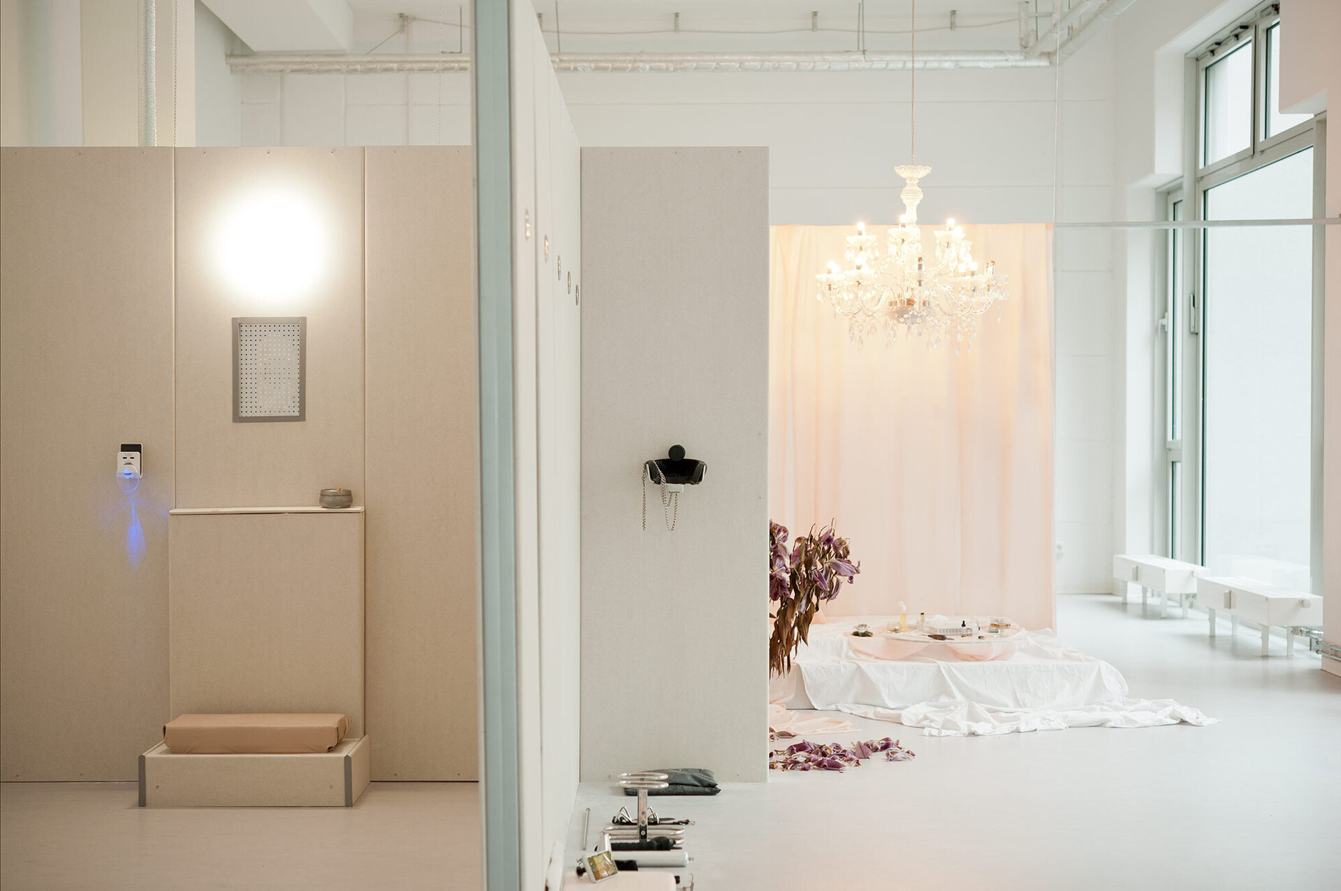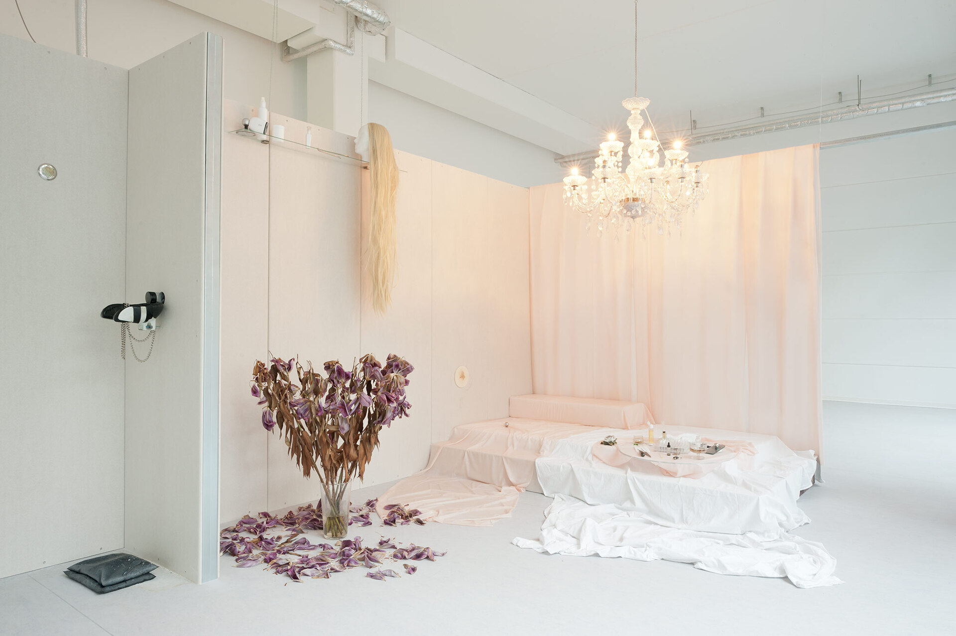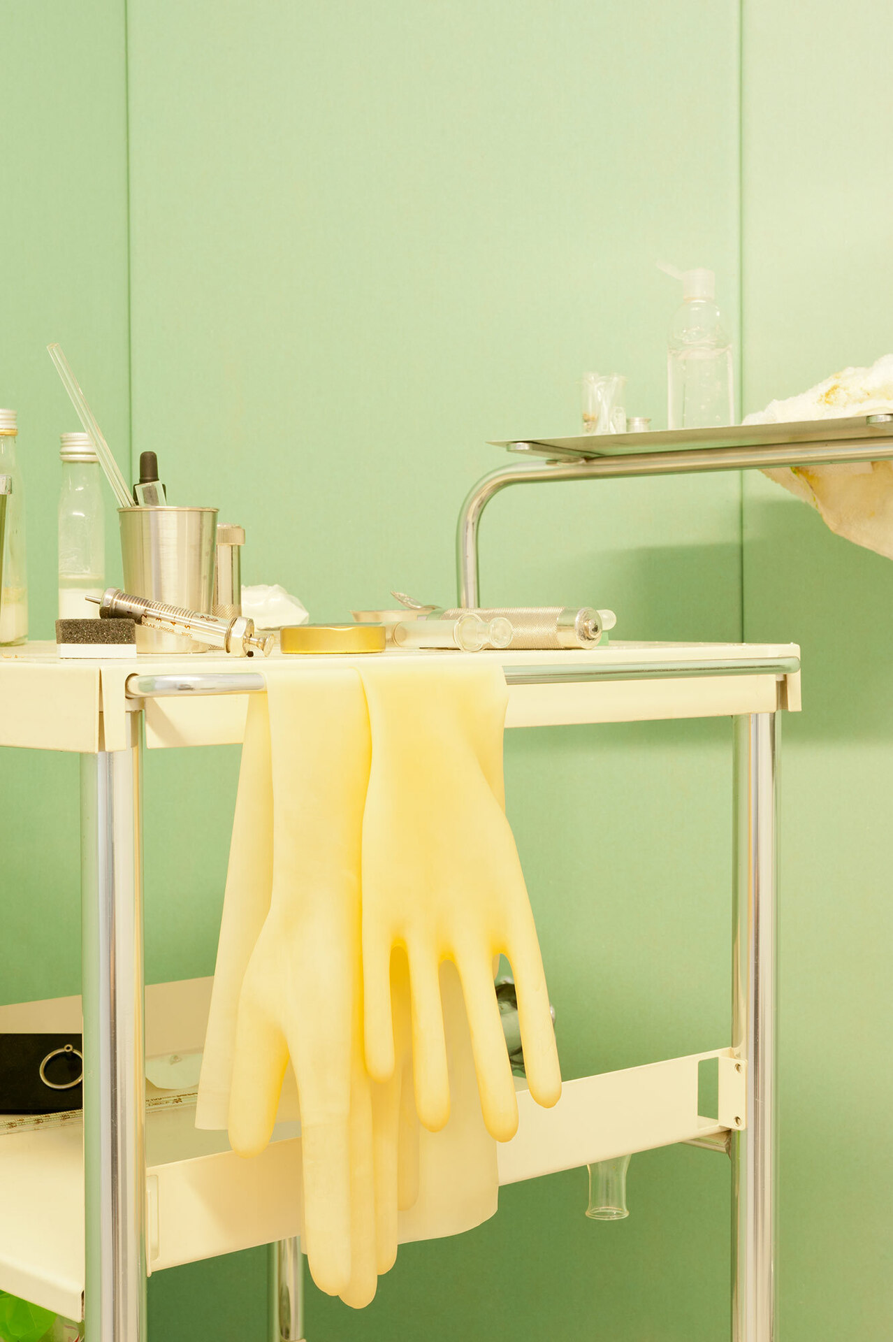 In her new work The Cabinet the artist shifts the perspective: not directly on herself, but through the visitors entering the bizarre constructed scenery, finding themselves caught in an ambivalent disposition — between repulsion and lure. The installation consists of three rooms: a laboratory, a boudoir and a confessional. Their previous use is still traceable in the form of stains, used utensils or untidy sheets. Tablets and drug-like substances become the protagonists of the deserted scene. What might have happened in this mixture of a secret back room and an alluring cabinet of curiosities can hardly be guessed. The objects remaining in the room promise intimacy, excess, or even violence. They tell stories of private moments, and despite the lack of activity, a voyeuristic, transgressive feeling gradually transpires. Absence thus becomes the theme of the installation.