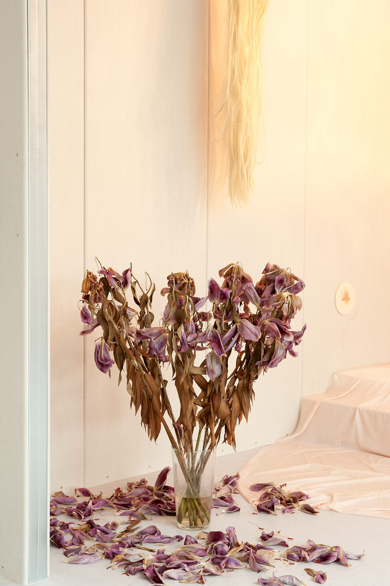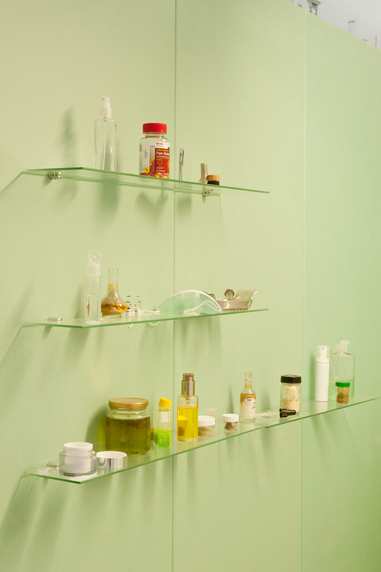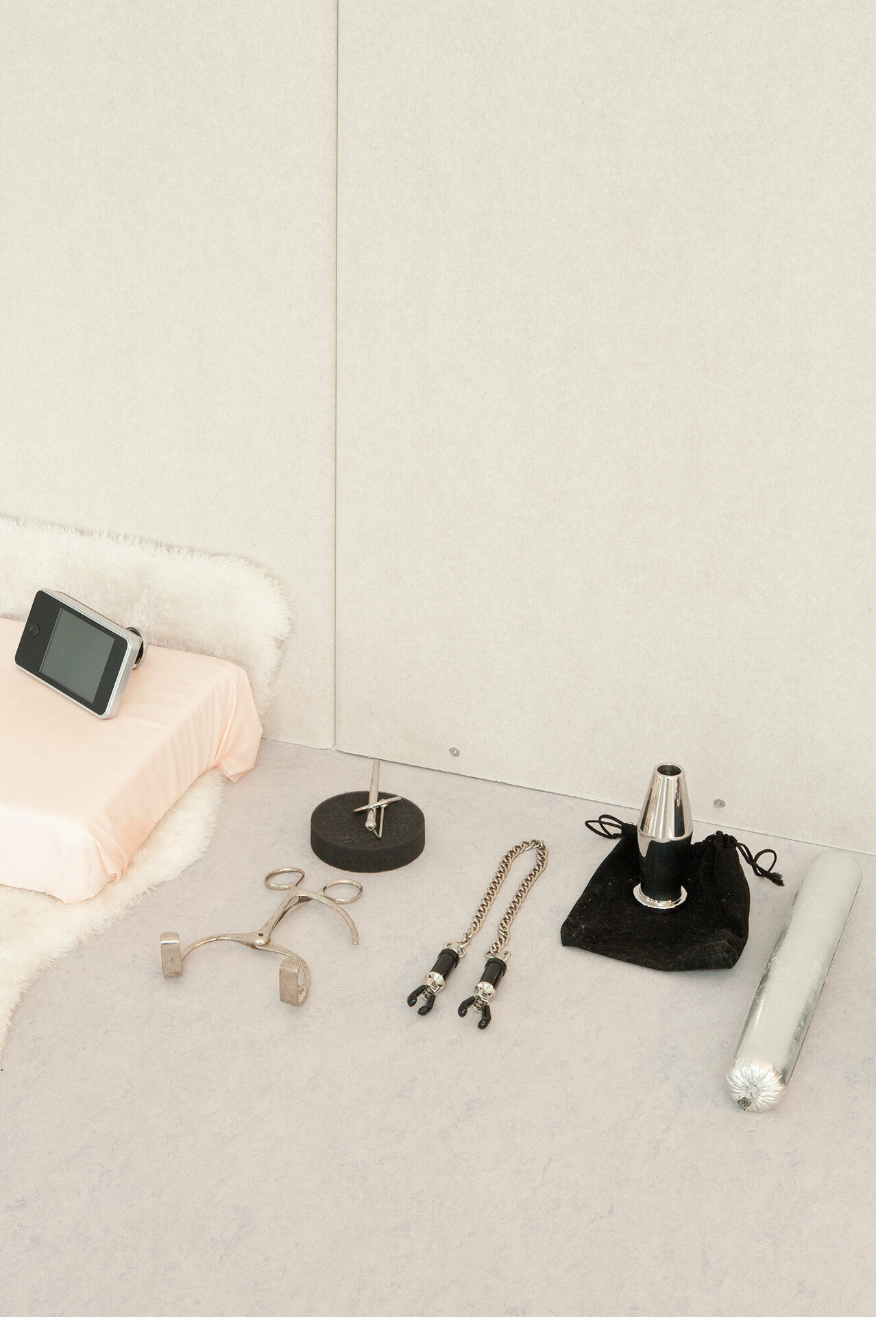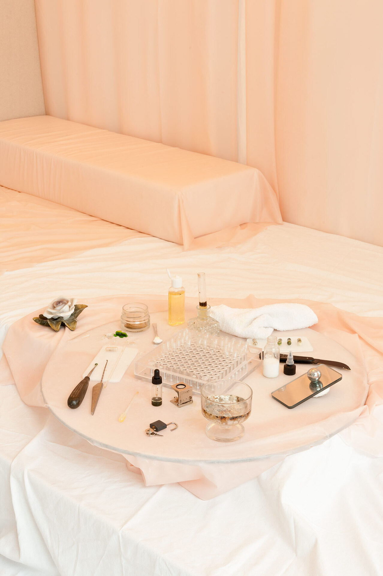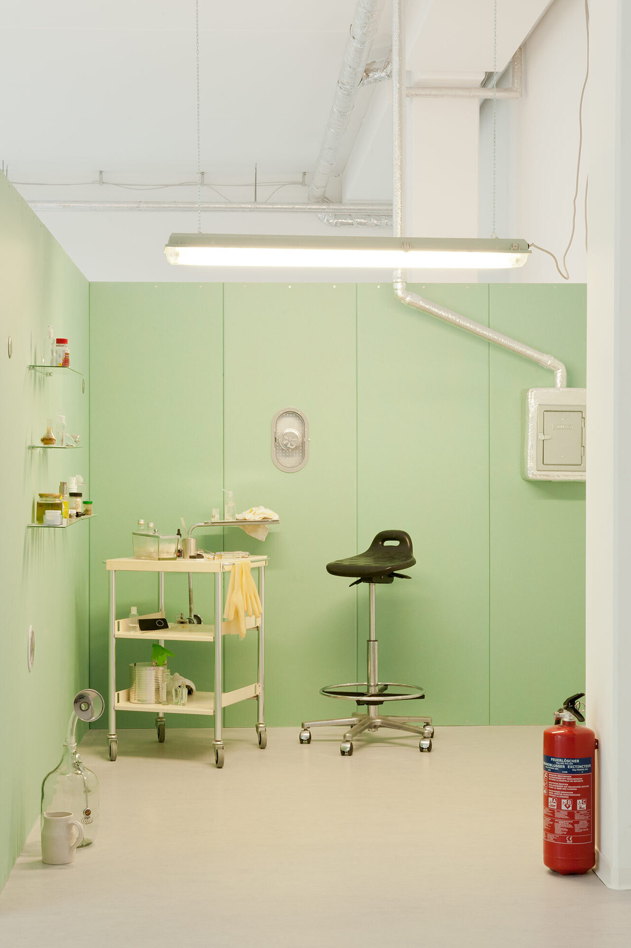 In her new work The Cabinet the artist shifts the perspective: not directly on herself, but through the visitors entering the bizarre constructed scenery, finding themselves caught in an ambivalent disposition — between repulsion and lure. The installation consists of three rooms: a laboratory, a boudoir and a confessional. Their previous use is still traceable in the form of stains, used utensils or untidy sheets. Tablets and drug-like substances become the protagonists of the deserted scene. What might have happened in this mixture of a secret back room and an alluring cabinet of curiosities can hardly be guessed. The objects remaining in the room promise intimacy, excess, or even violence. They tell stories of private moments, and despite the lack of activity, a voyeuristic, transgressive feeling gradually transpires. Absence thus becomes the theme of the installation.