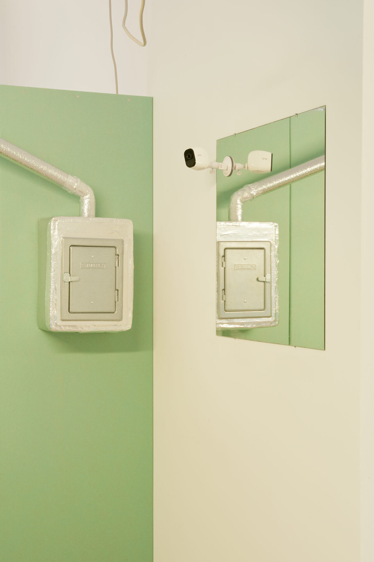 Over the weeks preceding the exhibition, Fette Sans shot the video work AGIRLICA in the cabinet presented here. The artist herself lives and works in Weißensee, and this exhibition invokes the district's cinematic past as "Little Hollywood." The film classic Das Cabinet des Dr. Caligari became the direct inspiration for the site-specific work. The expressionist silent film was shot in a small studio in Berlin-Weißensee and is known for its uncanny shift between reality and fiction, madness and sanity. Through the figure of Dr. Caligari, the artist takes up the staging of ambivalences, leaving the cabinet as the site of the action. The installation becomes a silent film set.