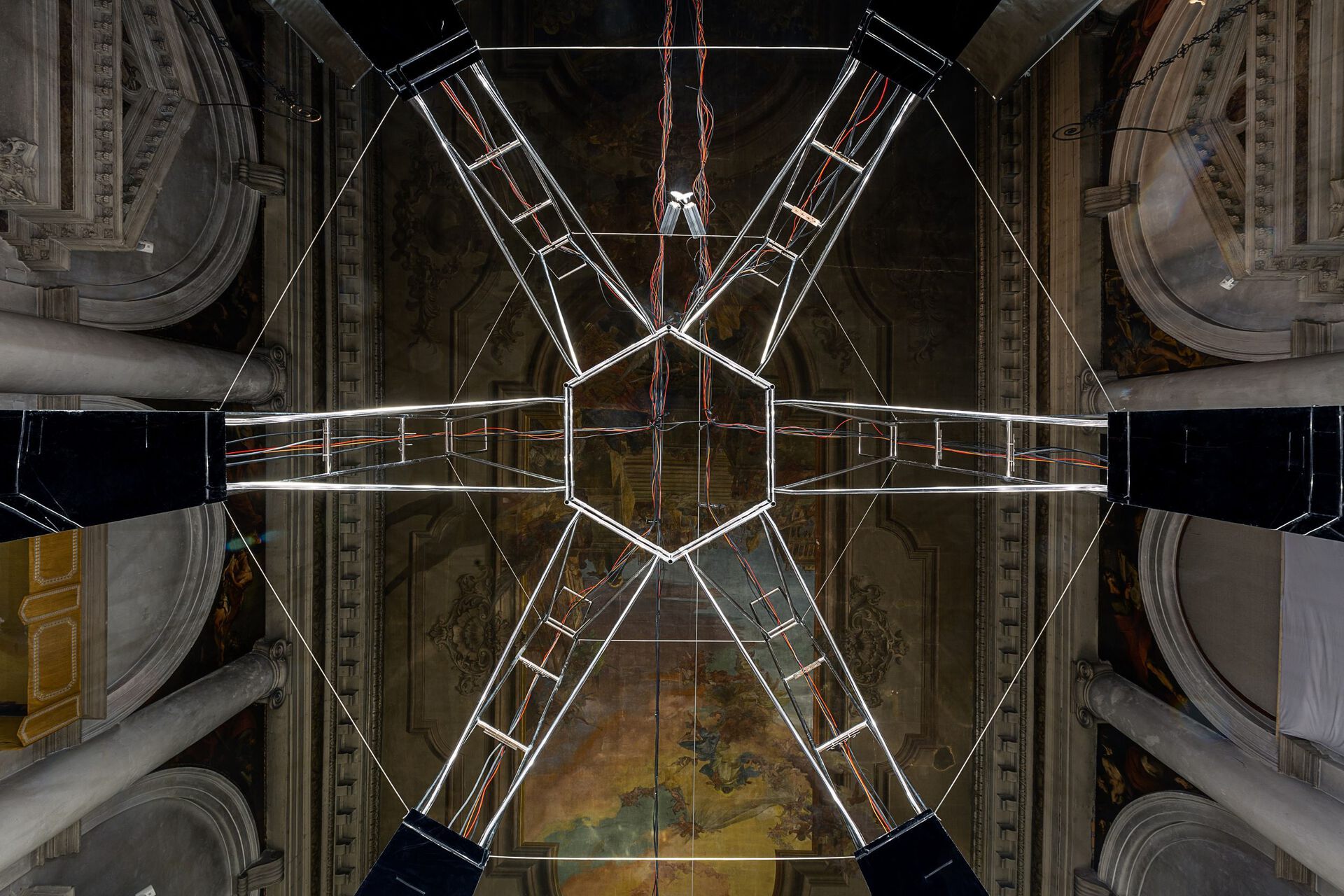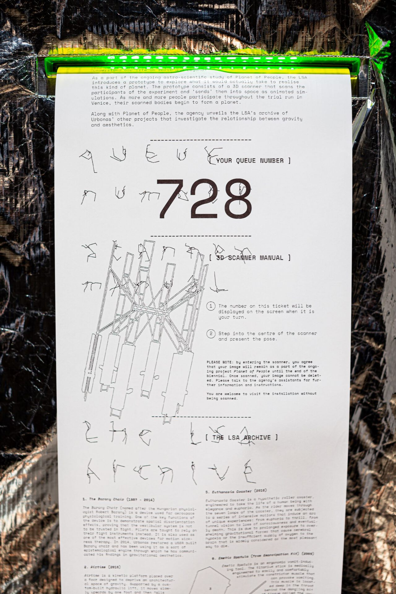 The Lithuanian Pavilion transformed the interior of the Renaissance-style church of Santa Maria dei Derelitti into the Lithuanian Space Agency’s (LSA) laboratory. In this laboratory, Julijonas Urbonas (the LSA’s founder, artist and researcher) presents his most recent project Planet of People. The LSA explores what it would actually take to realise the architectural fiction of Planet of People, raising questions about its sociopolitical implications. In addition, the project explores current aesthetic, ethical and political issues concerning space prevalent in existing national and commercial programmes such as cosmic culture and imagination, space colonialism and pollution, policies governing the activities of space exploration and the privatisation of outer space. Presented by the Lithuanian Council for Culture and organised by Rupert, Centre for Art and Education in Vilnius, the LSA exhibition is commissioned by Rupert’s director Julija Reklaitė and curated by Jan Boelen, artistic director of Atelier LUMA in France, rector of Karlsruhe University of Art & Design (HfG) in Germany and the founder and former artistic director of Z33 – House for Contemporary Art, Design & Architecture in Belgium.Text