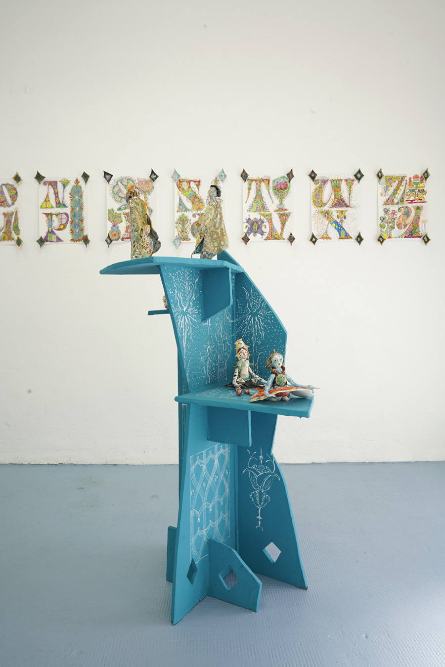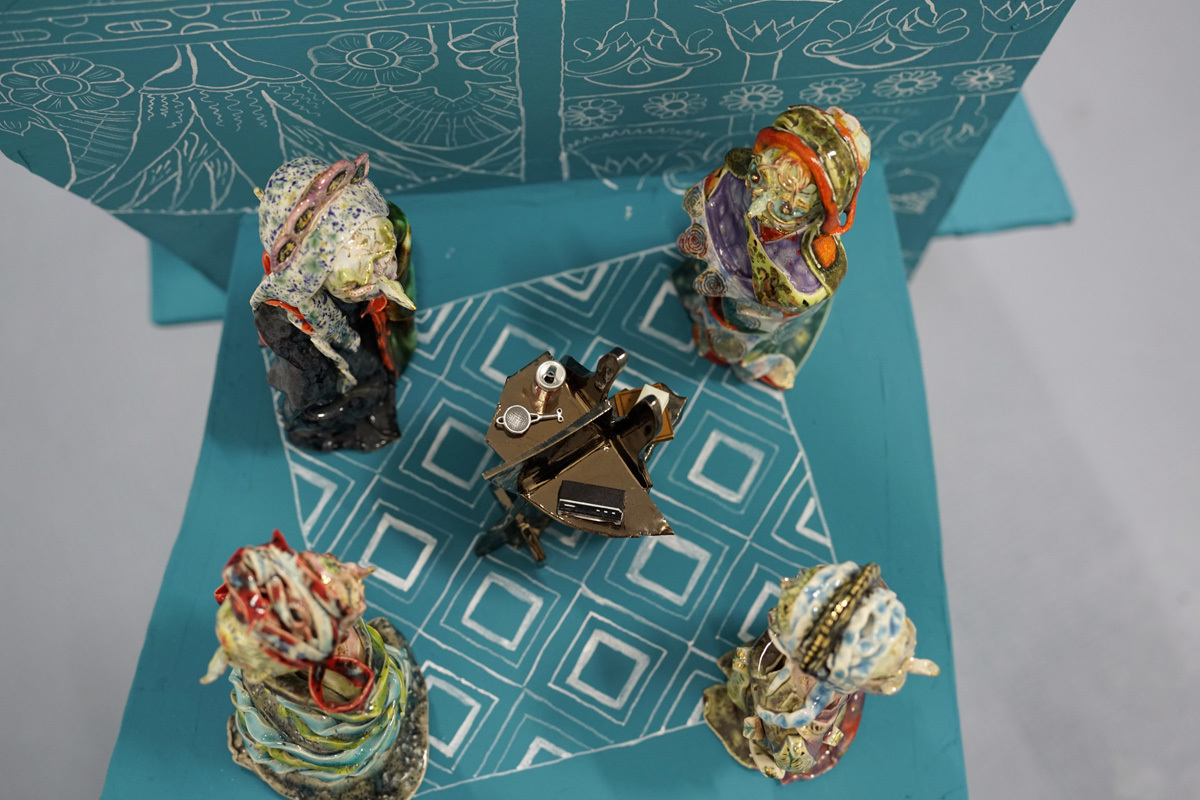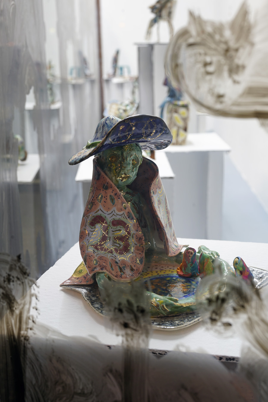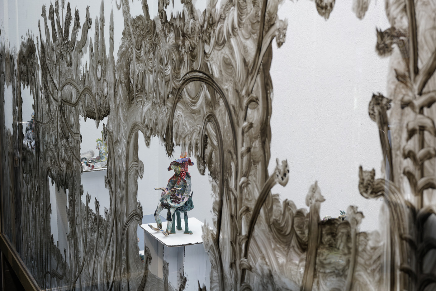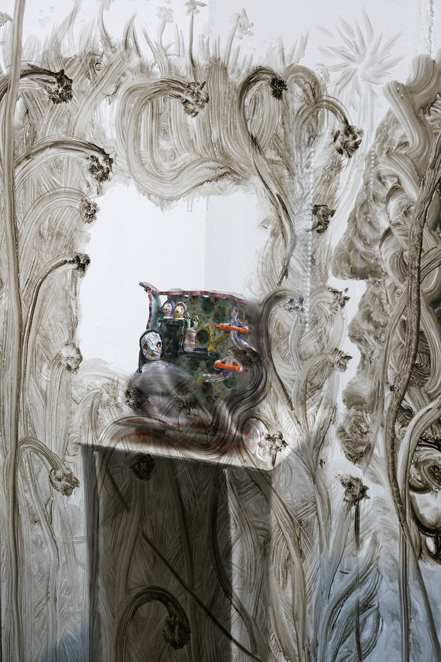According to “high strangeness” scholar Erik Davis, it was Freud who linked the uncanny “double character” (dolls and wax figurines, for example) to animist psychology, in which all things, animated or otherwise, have spiritual life. However, as Davis emphasises, this perspective is also a feature of mystical consciousness, and is perhaps only deflated and rejected by a “modern subjectivity” in which the “liveliness of the world fails to register." Through his analysis, Davis notes that these double characters (the doll-like ballerina in The Red Shoes, McKenna’s DMT elves, Hunt’s figurines) can be located within “an eerie animation.” It is within this framework that Hunt’s constructed, fantastical world is well-placed. All her dualisms are at home here: the micro and macro; the human and nonhuman; fiction and science fiction; real-life and animation; love and LUV. This world, but also the artist’s creative process, can be understood via Jung’s Sandplay therapy: here, two trays are filled with sand – one dry, one damp – and the patient can place a variety of miniatures in the sandboxes to create a three-dimensional scene or image. The idea is that by allowing the imagination to freely associate, the patient can process real and often traumatic experiences through a playful method that bypasses the analytical brain in order to access the unconscious. In turn, the sandbox becomes a safe space for the psyche to express itself. But what happens in the sandpit, what energy builds there, when your cute-looking miniatures come from complex places? What happens when play is both joyous and addictive, like dancing when you don’t quite know how to stop? Hunt’s exhibition The Machine Elves’ Shoes builds a world in which childlike bliss and dark forces revel together. Where doors keep opening to new experiences of psychedelic consciousness. Where the trash stratum sparkles and elves dance on at an endless rave party.