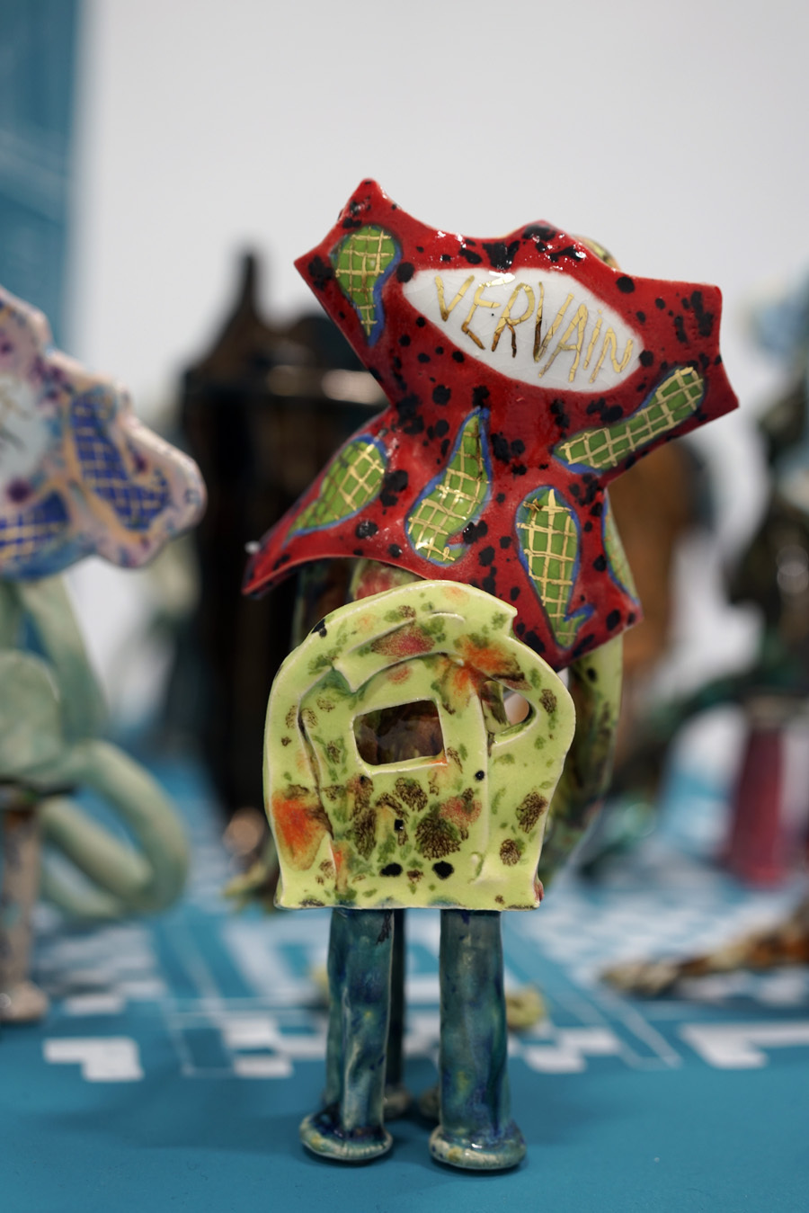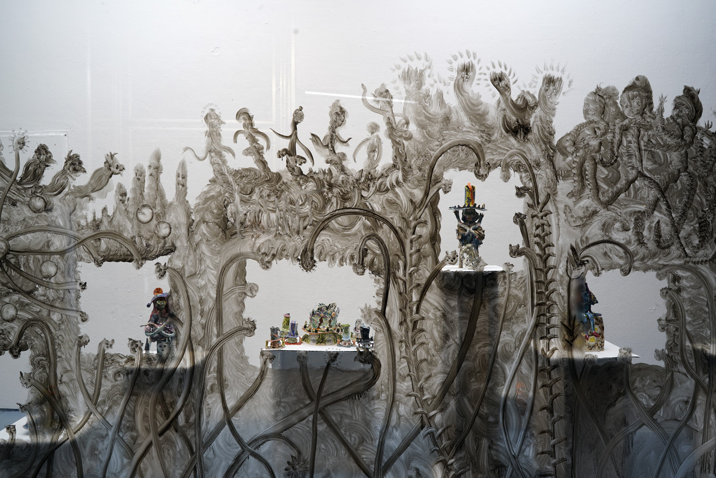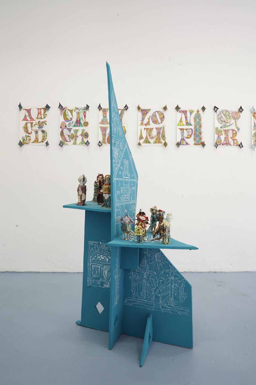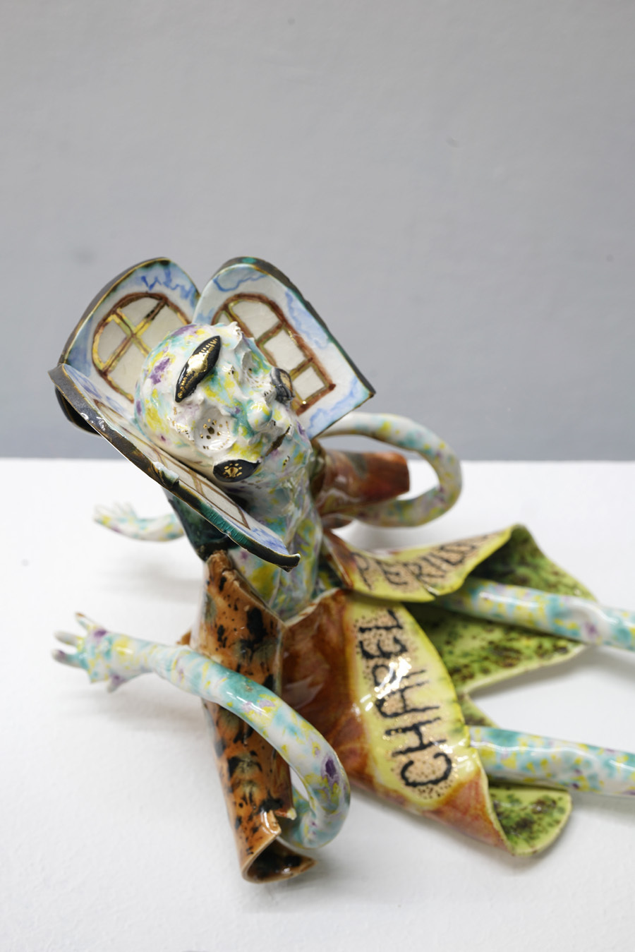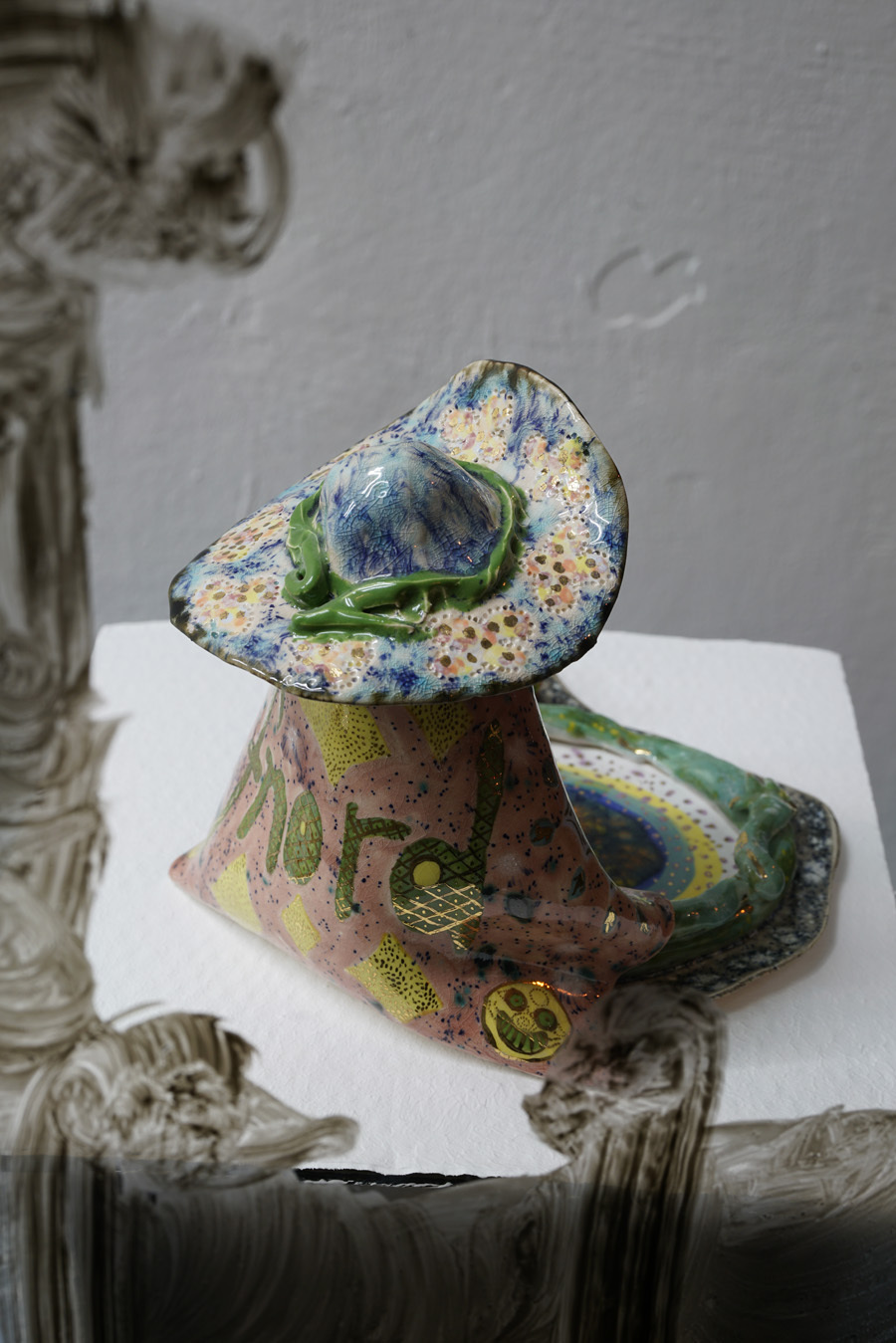 According to “high strangeness” scholar Erik Davis, it was Freud who linked the uncanny “double character” (dolls and wax figurines, for example) to animist psychology, in which all things, animated or otherwise, have spiritual life. However, as Davis emphasises, this perspective is also a feature of mystical consciousness, and is perhaps only deflated and rejected by a “modern subjectivity” in which the “liveliness of the world fails to register." Through his analysis, Davis notes that these double characters (the doll-like ballerina in The Red Shoes, McKenna’s DMT elves, Hunt’s figurines) can be located within “an eerie animation.” It is within this framework that Hunt’s constructed, fantastical world is well-placed. All her dualisms are at home here: the micro and macro; the human and nonhuman; fiction and science fiction; real-life and animation; love and LUV. This world, but also the artist’s creative process, can be understood via Jung’s Sandplay therapy: here, two trays are filled with sand – one dry, one damp – and the patient can place a variety of miniatures in the sandboxes to create a three-dimensional scene or image. The idea is that by allowing the imagination to freely associate, the patient can process real and often traumatic experiences through a playful method that bypasses the analytical brain in order to access the unconscious. In turn, the sandbox becomes a safe space for the psyche to express itself. But what happens in the sandpit, what energy builds there, when your cute-looking miniatures come from complex places? What happens when play is both joyous and addictive, like dancing when you don’t quite know how to stop? Hunt’s exhibition The Machine Elves’ Shoes builds a world in which childlike bliss and dark forces revel together. Where doors keep opening to new experiences of psychedelic consciousness. Where the trash stratum sparkles and elves dance on at an endless rave party.
