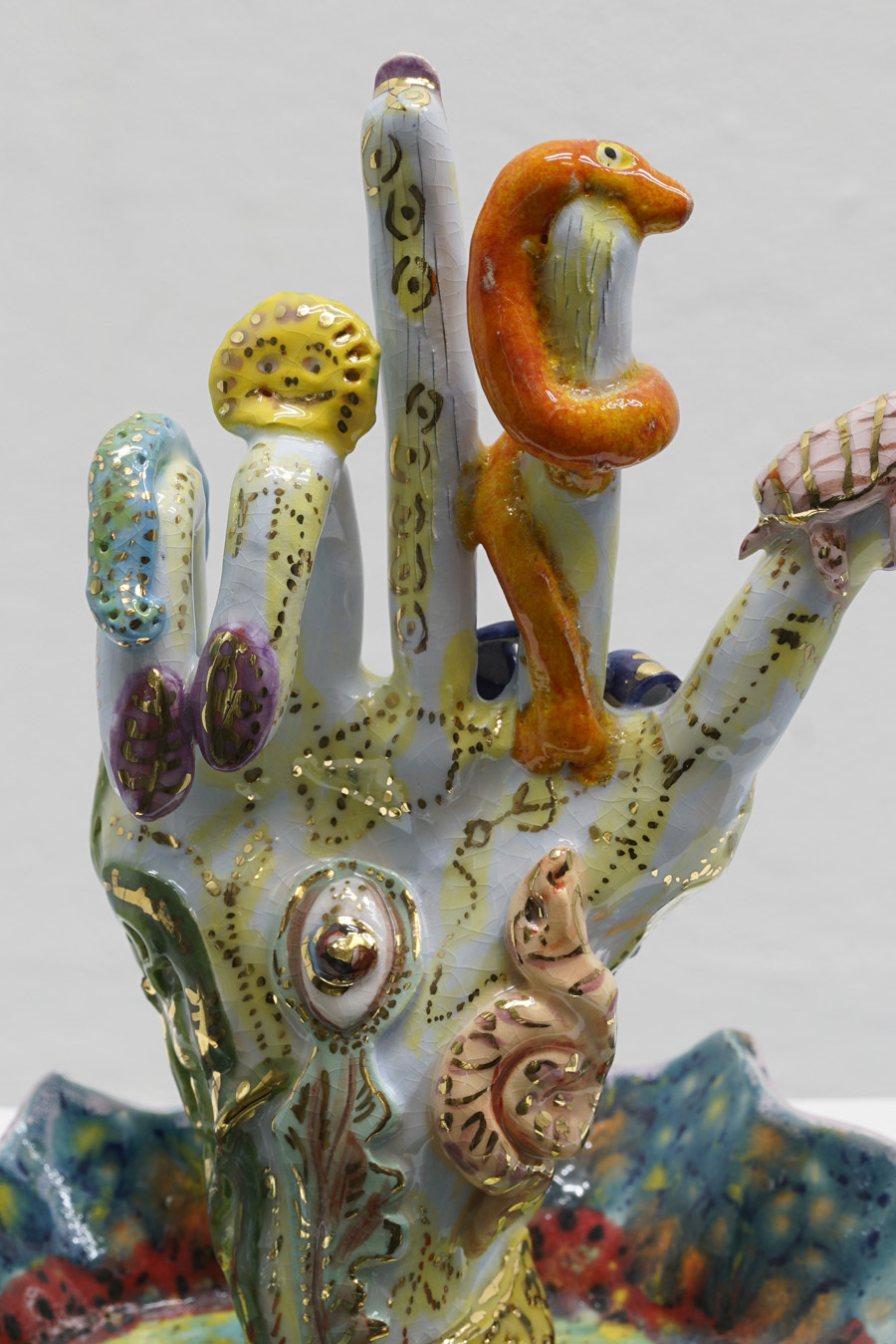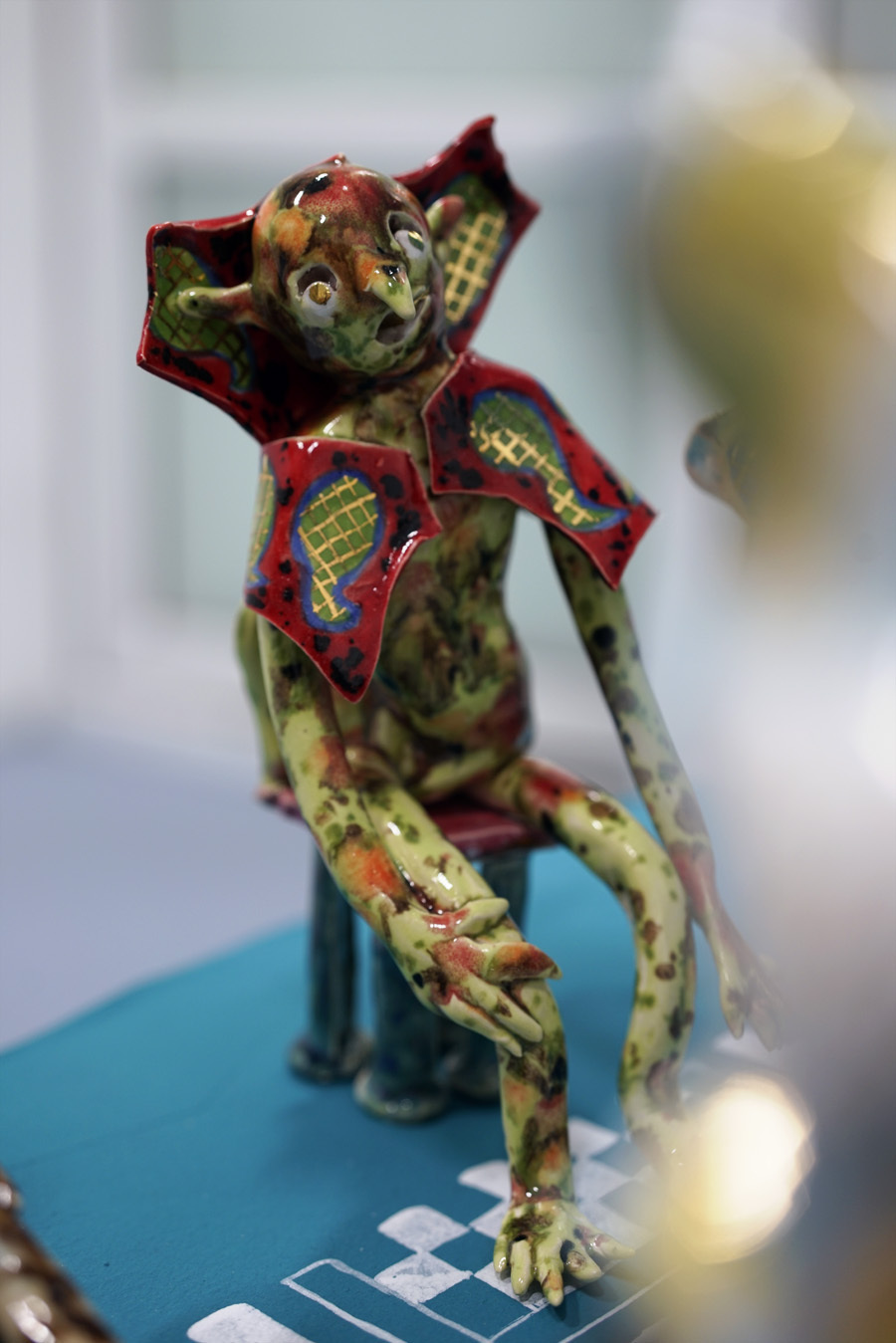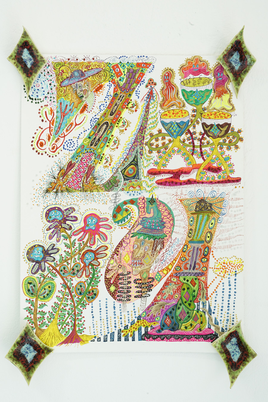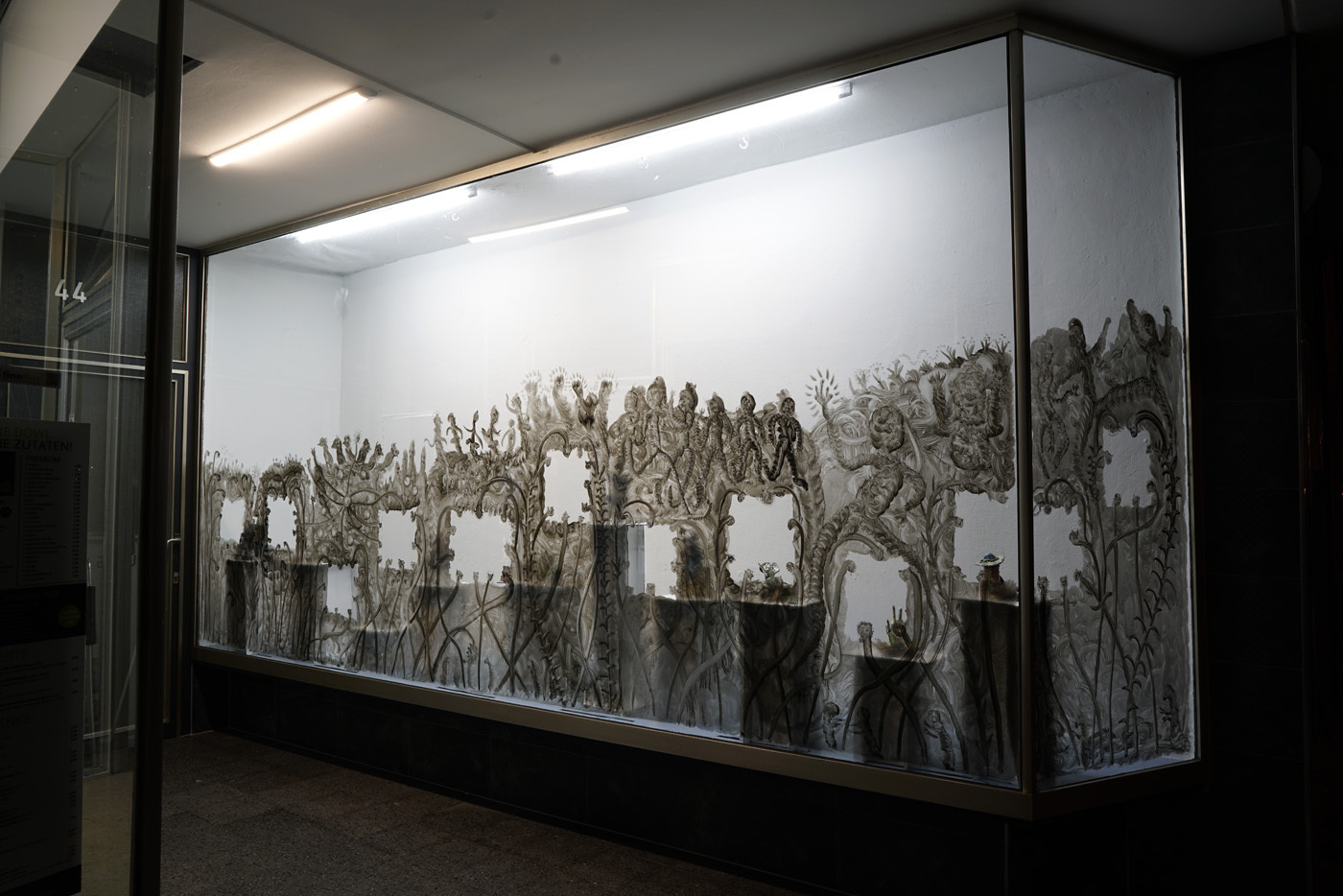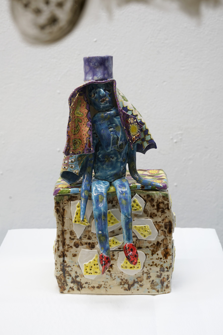According to “high strangeness” scholar Erik Davis, it was Freud who linked the uncanny “double character” (dolls and wax figurines, for example) to animist psychology, in which all things, animated or otherwise, have spiritual life. However, as Davis emphasises, this perspective is also a feature of mystical consciousness, and is perhaps only deflated and rejected by a “modern subjectivity” in which the “liveliness of the world fails to register." Through his analysis, Davis notes that these double characters (the doll-like ballerina in The Red Shoes, McKenna’s DMT elves, Hunt’s figurines) can be located within “an eerie animation.” It is within this framework that Hunt’s constructed, fantastical world is well-placed. All her dualisms are at home here: the micro and macro; the human and nonhuman; fiction and science fiction; real-life and animation; love and LUV. This world, but also the artist’s creative process, can be understood via Jung’s Sandplay therapy: here, two trays are filled with sand – one dry, one damp – and the patient can place a variety of miniatures in the sandboxes to create a three-dimensional scene or image. The idea is that by allowing the imagination to freely associate, the patient can process real and often traumatic experiences through a playful method that bypasses the analytical brain in order to access the unconscious. In turn, the sandbox becomes a safe space for the psyche to express itself. But what happens in the sandpit, what energy builds there, when your cute-looking miniatures come from complex places? What happens when play is both joyous and addictive, like dancing when you don’t quite know how to stop? Hunt’s exhibition The Machine Elves’ Shoes builds a world in which childlike bliss and dark forces revel together. Where doors keep opening to new experiences of psychedelic consciousness. Where the trash stratum sparkles and elves dance on at an endless rave party.