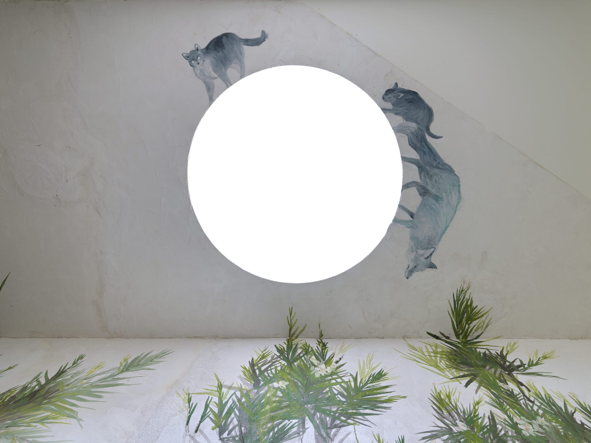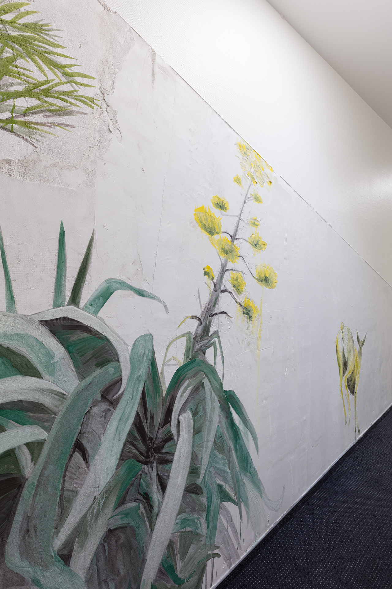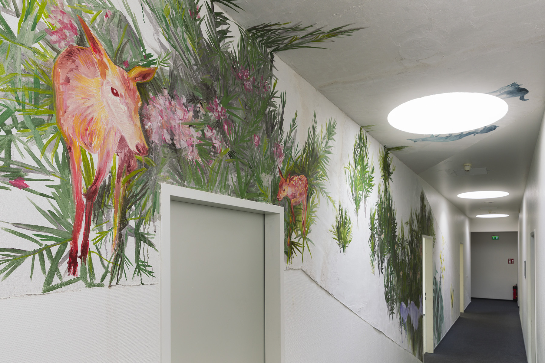 Im Vergleich dazu lässt Agnese Galiotto das Publikum immersiv in ein Fresko eintauchen, das den grauen Flur in einen farbenfrohen, mediterranen Wald verwandelt. In Foris (forest, outside) (2021) streifen bunte Rehe auf Augenhöhe durch pink und gelb blühende Oleanderbüsche und Agavengewächse. Füchse und Katzen scheinen aus einem runden Deckenfenster Ausflucht zu suchen. Die Tierdarstellungen beziehen sich auf Fotografien, die die Künstlerin mit einer Wildkamera in den Dolomiten aufgenommen hat. In den dortigen Wäldern sind die gemalten Pflanzen eigentlich fremd: Oleander etwa wächst in den trockenen Regionen Südeuropas, Agaven in (sub)tropischen Klimaten. In Galiottos Werk sind die gewohnten Realitäten wortwörtlich auf den Kopf gestellt und auch das künstlerische Medium verhält sich gegenüber seiner Umgebung widersprüchlich: Fresken überdauern Jahrzehnte, gar Jahrhunderte – doch die hiesigen Räume werden bald abgerissen. Wie die Blüten der Agave zeigt sich das Werk vor seinem Ableben nur ein einziges Mal.