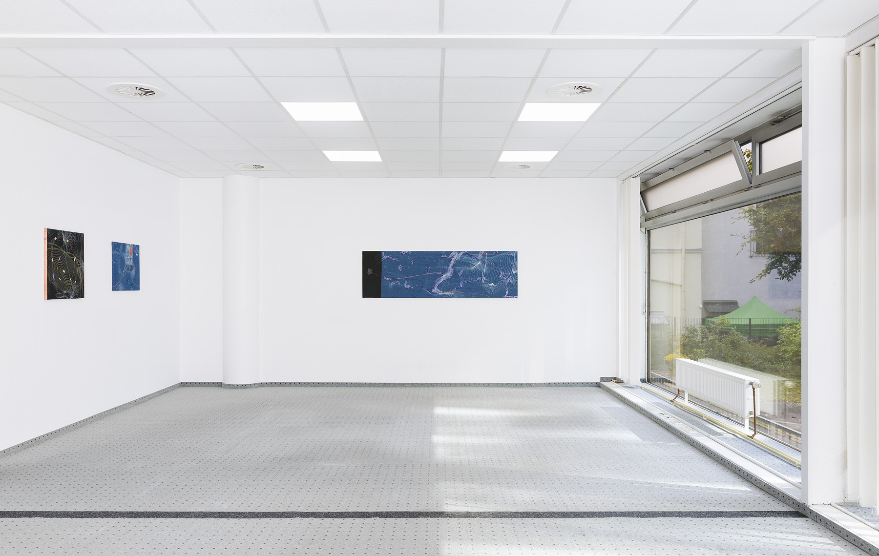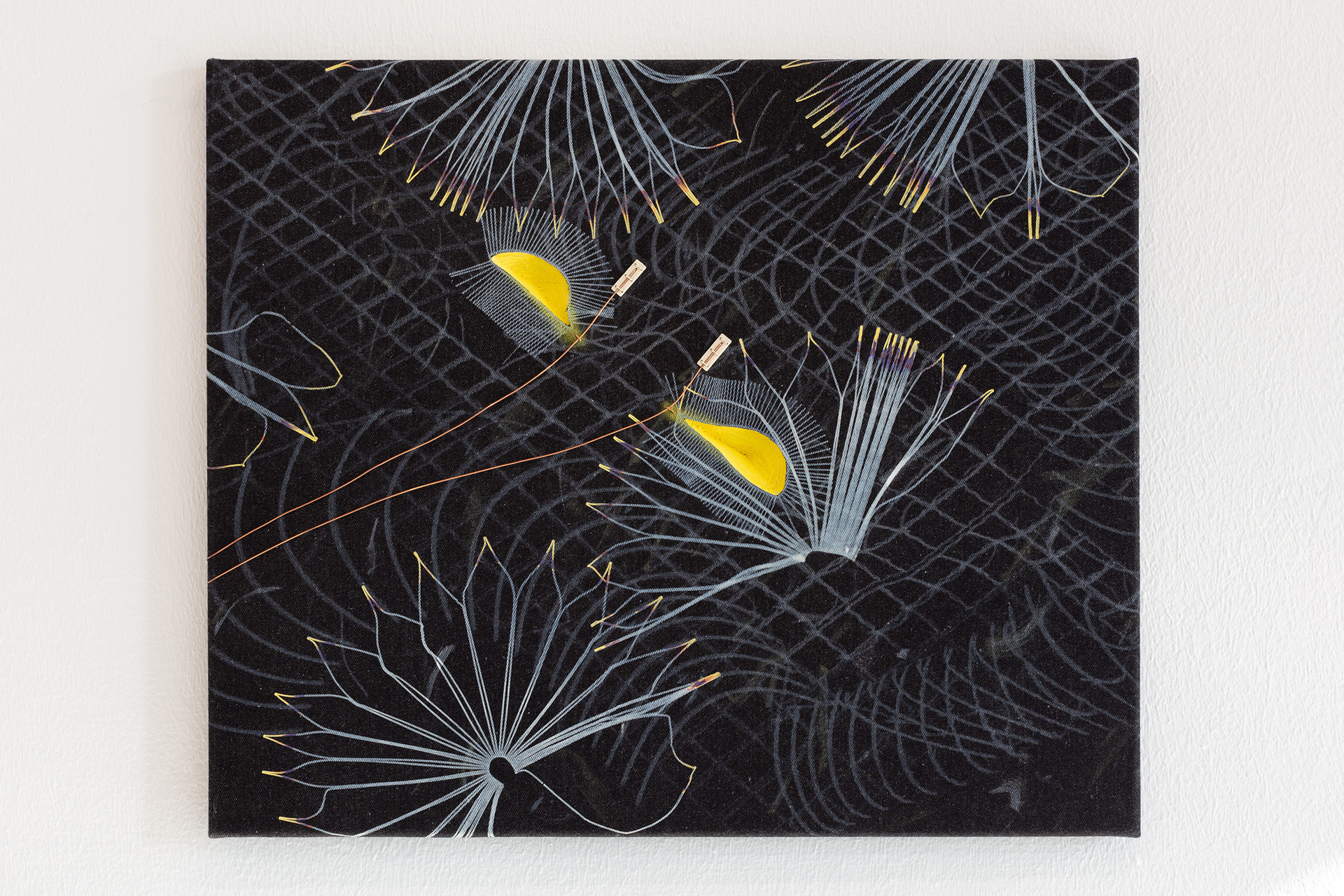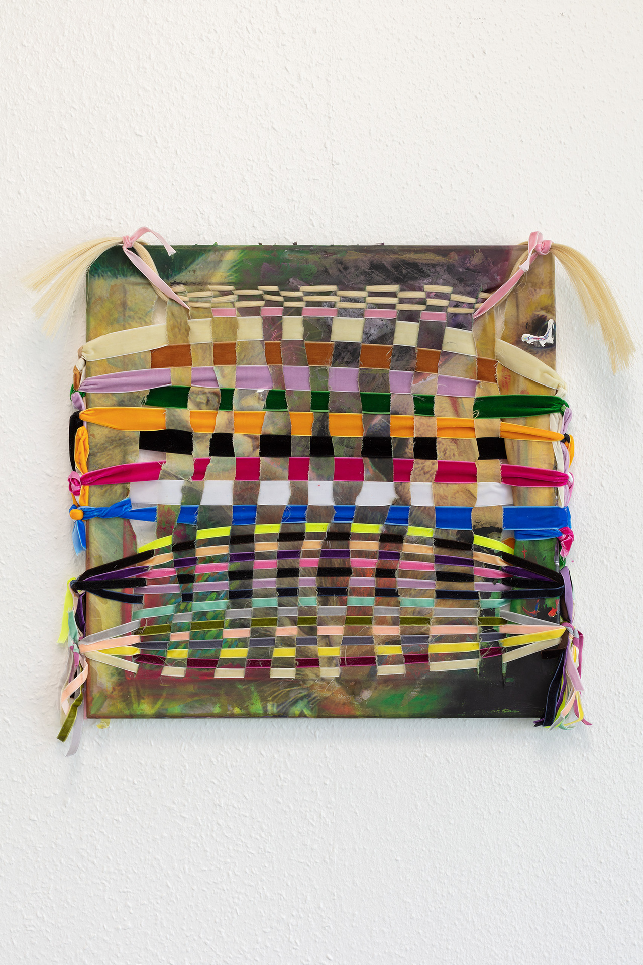 In besonders hoher Anzahl sind Malereien vorzufinden. Liegt es daran, dass die Werkstätten der Städelschule zuletzt nur eingeschränkt nutzbar waren? Stellt die flache Leinwand im Vergleich zu raumgreifenden Formaten vielleicht ein pandemie-taugliches Medium bei der Kunstproduktion dar? Miran Yang und Sara Rossi malen jedenfalls schon lange, und zwar mit Öl auf Leinwand. Ihre abstrakten Bildwelten unterscheiden sich grundlegend: In Miran Yangs Großformaten überlagern sich die pastosen Farbschichten und erzeugen ein Gefühl von Tiefe. Himmelsphänomene wie Regenbögen bieten der Künstlerin Ansatzpunkte für ihre Gemälde, die sie als psychologische Bekenntnisse versteht. Sarah Rossi begreift den malerischen Raum im Kontrast zum geometrisch erfassbaren als eine erweiterbare und interpretationsoffene Dimension. Mit vereinfachten Formen und grafischen Verzerrungen fordert sie das rationale Verständnis heraus und verleiht ihren Werken durch goldene Flächen eine transzendentale Sphäre. Besonders experimentell sind Conrads Mixed-Media-Arbeiten, die Jeansstoff, Kupferdraht und 3D-gedruckte Objekte auf der Leinwand zusammenführen. Durch Nähen, Kleben, Stecken und Schmelzen entstehen dynamische Beziehungen zwischen den applizierten Materialien, die Dichotomien aufheben: Mensch und Maschine, Natur und Technik stellen keine Gegensätze mehr dar. Die Werke laden zur Detailansicht ein, halten als geschlossene Objekte aber an der Distanz zu den Betrachter:innen fest.