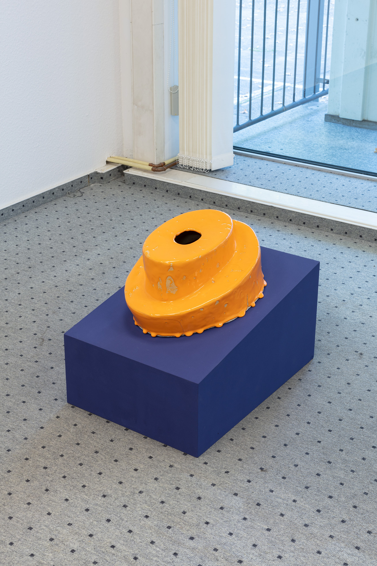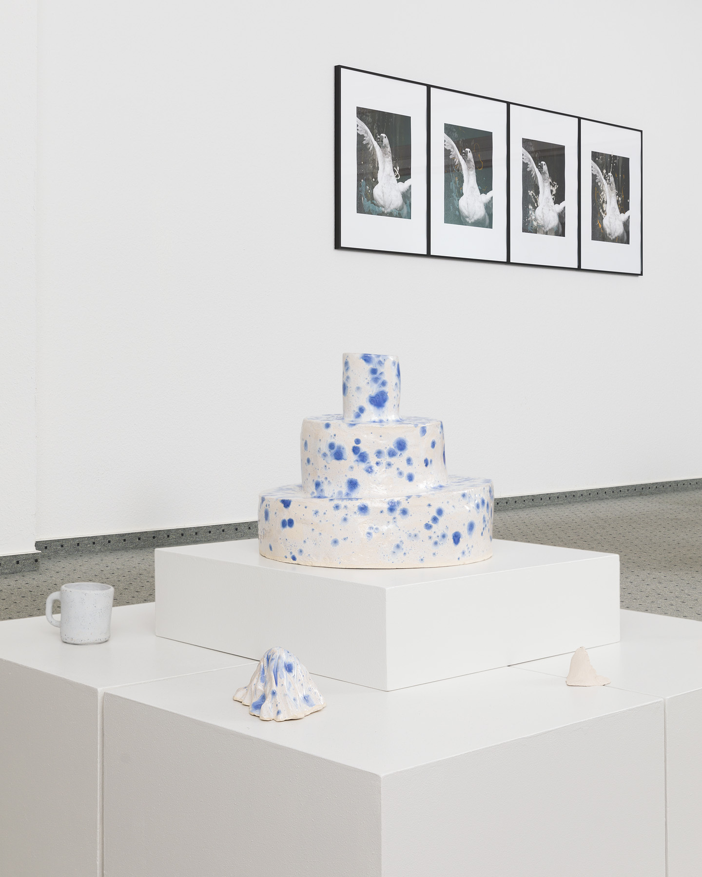 Anita Esfandiaris Tonskulpturen, die sie auf Podesten im Raum arrangiert, umkreisen die Absenz von Wasser. Töne gluckern aus den Fountains (2021), plätscherndes Wasser und eine Frauenstimme sind zu hören. Die mehrstöckigen Objekte sind teilweise bemalt, weiß-blau und orange; an anderer Stelle ist der gebrannte Ton trocken und erdig sichtbar. Die Zeichnung Waterfall (2016) und die Siebdrucke Goose Running on Water (2020) ergänzen die raumfüllende Anordnung. Die Künstlerin bezieht sich auf traditionelle iranische Brunnenbauten, die sie als Orte sozialer Zusammenkunft beschreibt. Früher wurde dort geredet, gespielt und gemeinsam verweilt, heute gibt es sie nur noch selten in dieser Form. Sie wurden weitgehend ersetzt durch moderne, platzsparende Varianten, die weniger einladend wirken. Esfandiaris Werke beherbergen nicht länger Wasser. Stattdessen kreiert ihr Beisammensein eine intime Atmosphäre, deren Fragilität zur Umsicht mahnt: gegenüber der Spezifität sozialer Kontexte, ihrer nährenden Bedeutung sowie der flüssigen Ressource, ohne die auch die Tonarbeiten nicht zu ihrer Form finden würden.