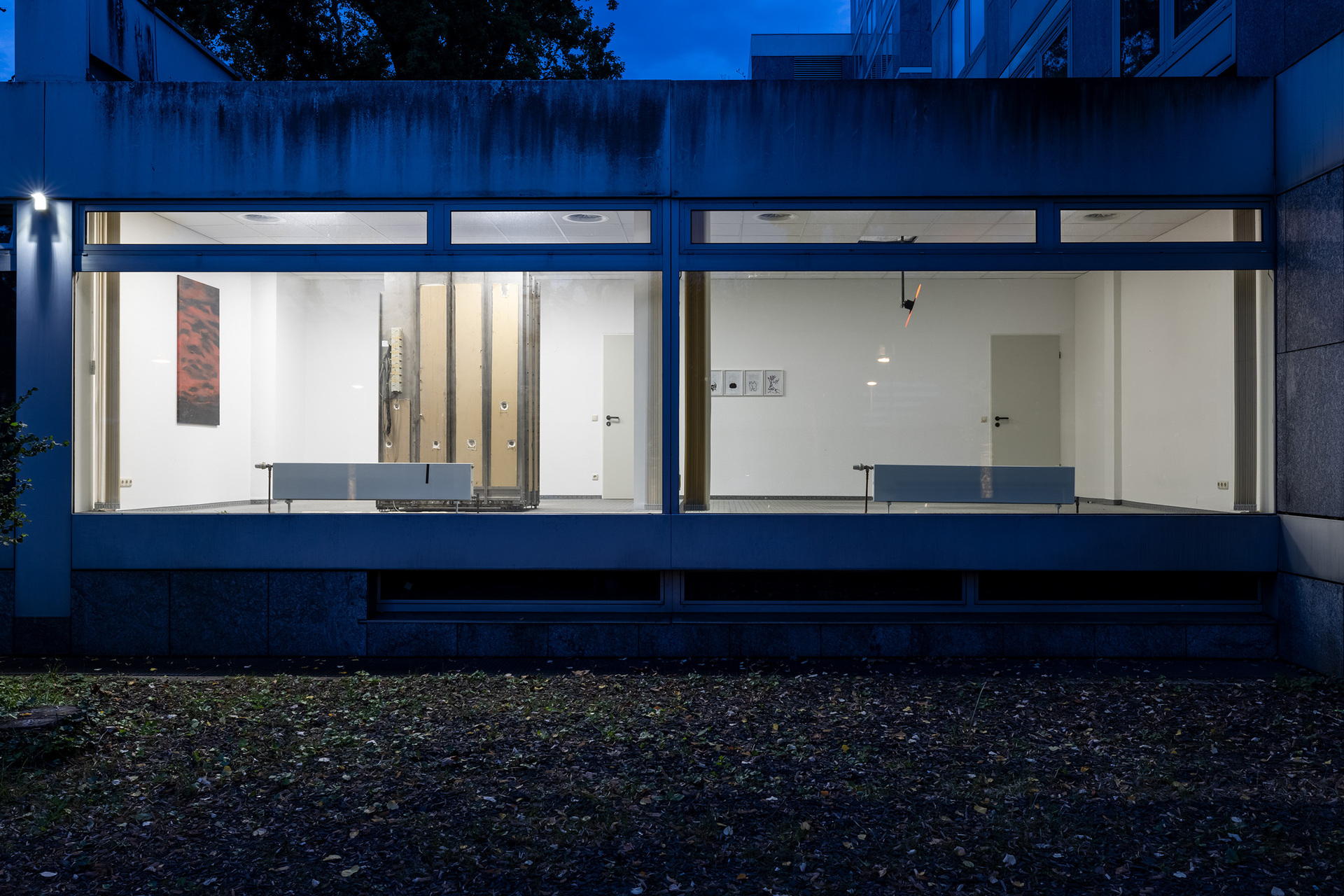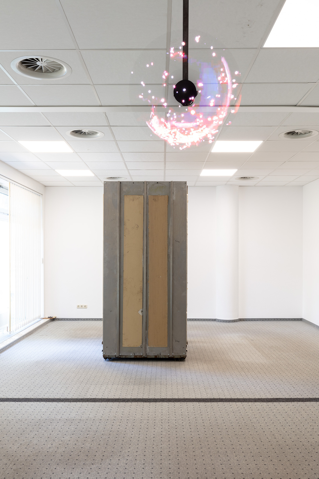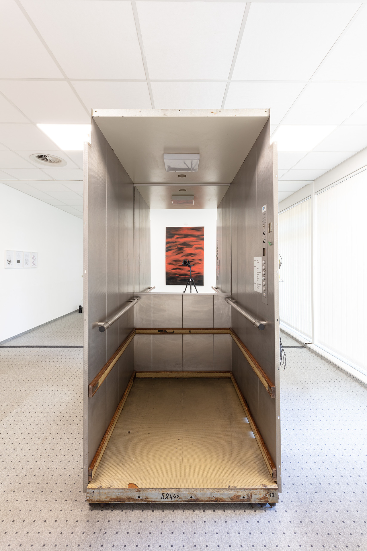 Ein massiver Fahrstuhl steht wie eine Ruine im Raum. Aus seinem Schacht entnommen, lässt er sich in seiner zur Schau gestellten Dysfunktionalität allansichtig betrachten. Wer einsteigt, wird die Etage nicht wechseln. Stattdessen begegnet uns das eigene Spiegelbild, umgeben von einer Malerei, die an höllische Flammen erinnert. Mit der Anordnung der Werke Untitled (2020) und Untitled (2021) konfrontiert Alex Chalmers die Betrachtenden auf beklemmende Weise mit sich selbst. Ein Blick aus dem Fenster genügt, um seine Werke vor dem Hintergrund der Frankfurter Skyline im Kontext von Macht, Geld und Gier zu lesen: Zwischen Aufstieg und Fall verfrachtet ein Lift in die obersten Chefetagen der Hochhäuser – und damit vielleicht ein Stück weit in die Hölle? Daneben befindet sich ein holographisches LED-Display, das aus der aufgebrochenen Kassettendecke herunterhängt und wie ein Helikopter vor dem Abflug abzuheben droht. In der endlosen Rotation leuchten Funken wie ein Feuerwerk auf. Was auch immer in Shooting stars (2021) gefertigt wird, schneidet auf gefährliche Weise in die Luft.