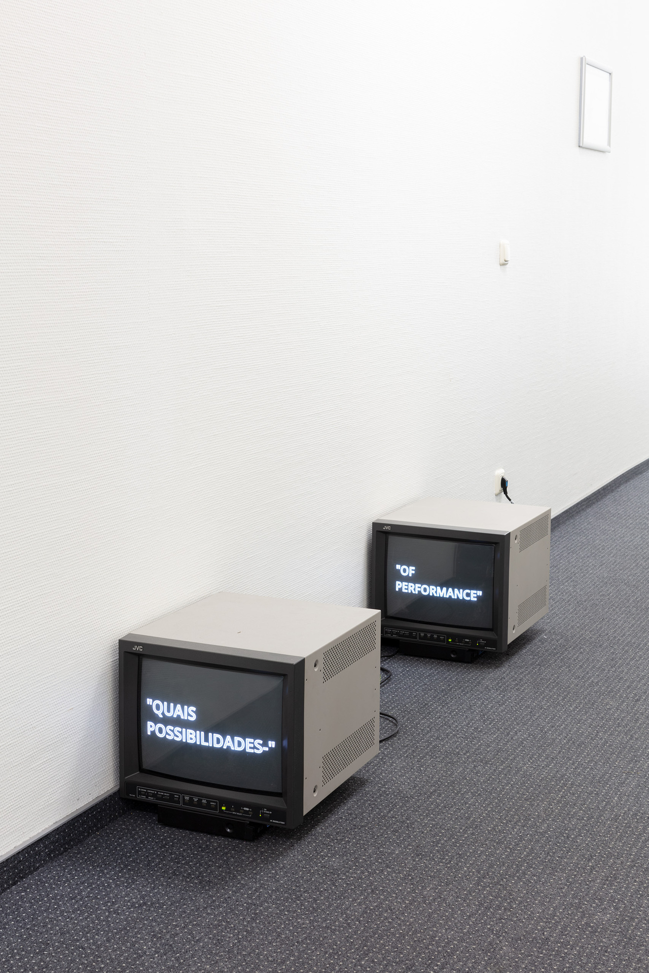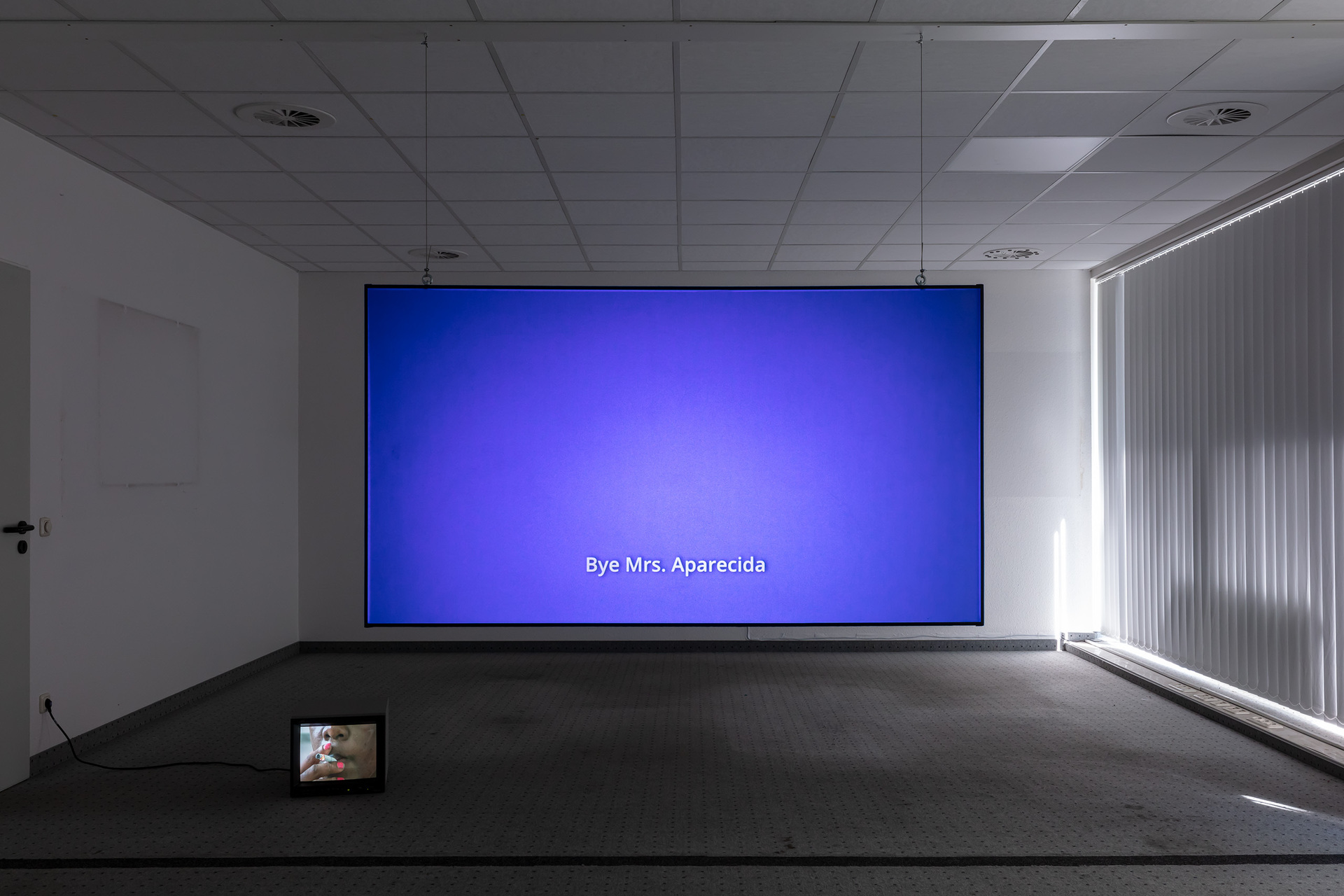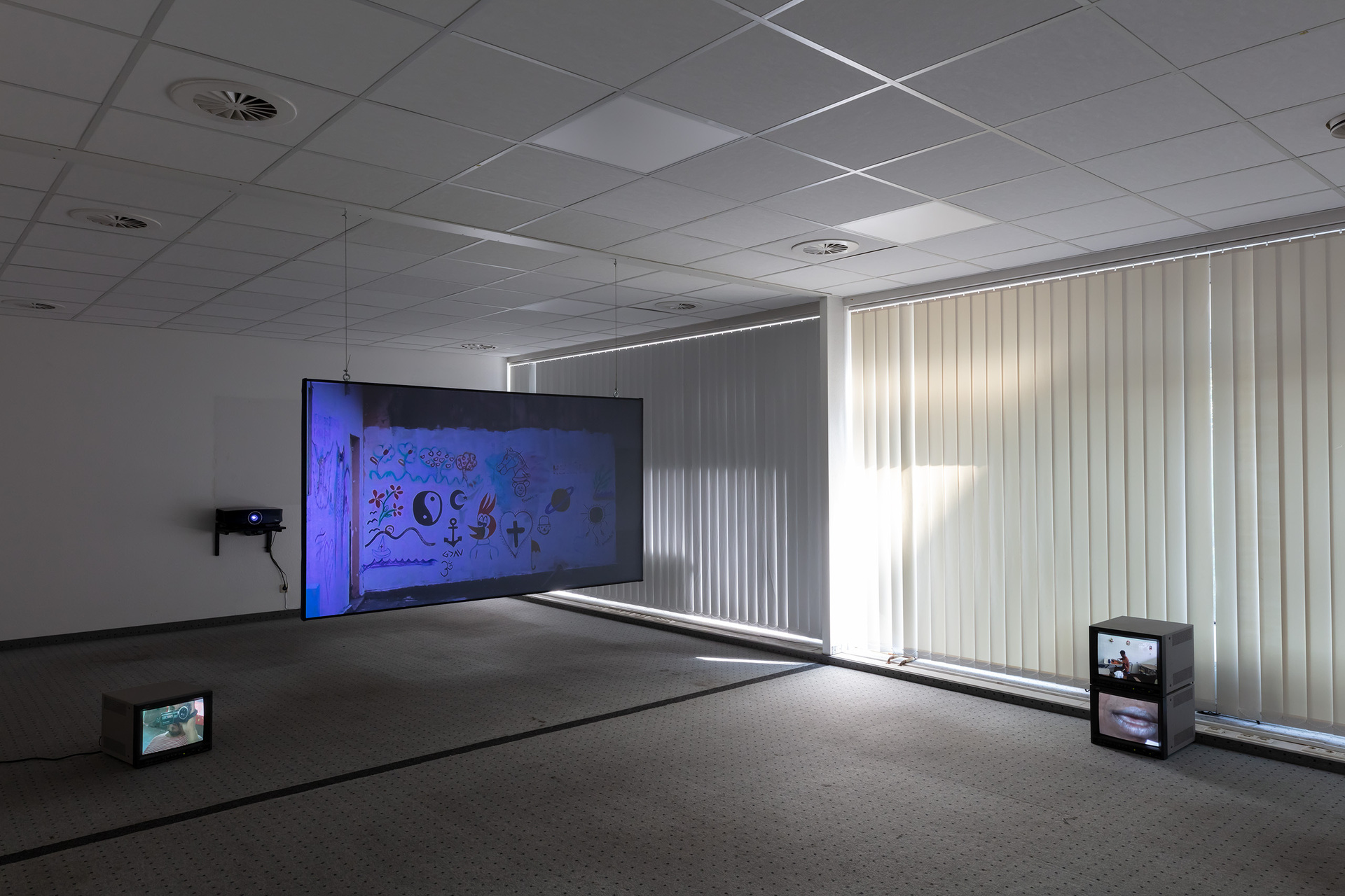 Hantarex-Monitore im Flur leiten zu Dudu Quintanilhas mehrkanaliger Videoarbeit INCAPAZ (The Incompetent) (2021). Eine Projektion inmitten des Raums führt durch ummauerte Innenhöfe mit bemalten Wänden und leere Zimmer, in denen beizeiten der Künstler zu sehen ist. Weitere Bildschirme zeigen Körperfragmente, die die gefilmten Personen nur andeuten. Das Bildmaterial ist in einer psychiatrischen Klinik nahe Rio de Janeiro entstanden. In den Wochen, die Quintanilha gemeinsam mit den Patient:innen im Rahmen einer Residency verbrachte, gab er ihnen seine Kamera in die Hand. Immer wieder zoomt diese so nah an Objekte heran, bis sie sich in kleinsten Pixeln auflösen. Zwei Stimmen sprechen stellvertretend für die persönlichen Narrative, die im Film zusammenfließen. Sie schildern auf anonyme Weise den Alltag vor Ort, berichten von den immer gleichen Abläufen, den langen Wartezeiten, vielen Zigaretten und der unausweichlichen Medikation. Sensibel illustriert die Arbeit die Ausweglosigkeit der Bewohner:innen. Die Einweisung in eine psychiatrische Institution bedeutet nicht unbedingt Heilung, sondern raubt vor allem die Entscheidungsgewalt, die Quintanilha ihnen ein Stück weit zurückgibt.