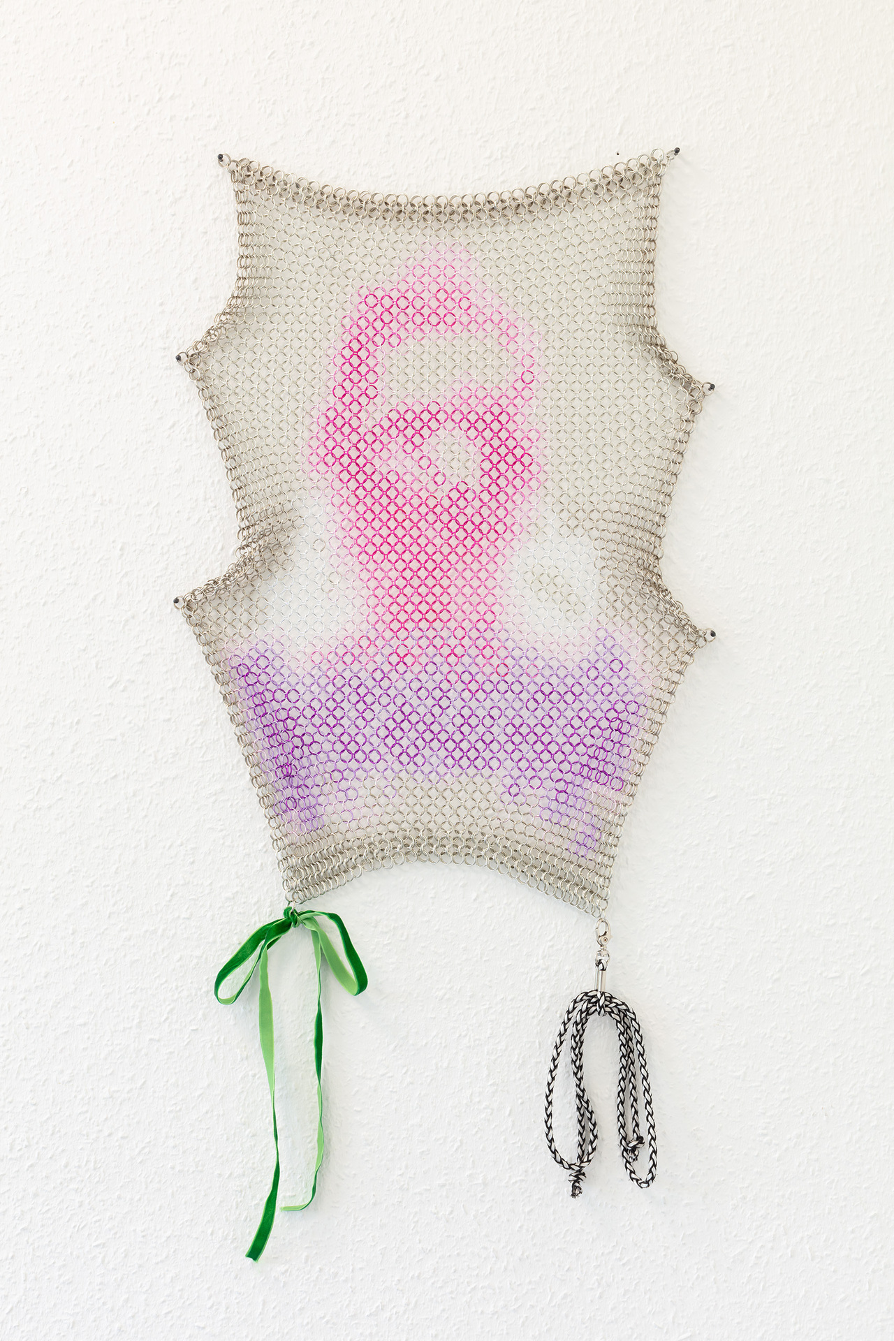 Jordan/Martin Hell hingegen ersetzt Traurigkeit durch Knall und Pop, Plastik und Neon. In spielerischer Hängung erinnern seine bunten Werke vor der Raufasertapete fast an ein Kinderzimmer. Die vielen Arbeiten kommunizieren mit Ikonen der Kunstgeschichte, erneuern etwa eine Komposition Wassily Kandinskys oder übertragen Hilma af Klints Portrait auf ein Kettennetz. Ganz friedlich geht es hier nicht zu: Säbel schwingen durch den Raum, Schnüre strangulieren Leinwände. Kleine Objekte, etwa die Handyhülle einer Domina und ein mehrköpfiger Drache, sind wie im Museum auf Sockeln präsentiert und mit Hinweisen versehen: “DON’T TOUCH” oder “TOUCH” lauten die Optionen. Die elektrisierenden Werke sind der Novelle CONSTANT VIOLINS I & II erwachsen, die hier ebenfalls ausliegt. Jordan/Martin Hell entwirft darin eine Fiktion über das Leben von Künstler:innen, voller apokalyptischer Szenarien. Gespickt mit unzähligen Verweisen auf (sozio-)kulturelle Theorien, geht es um Liebe, den Kampf um Sichtbarkeit und das Einnehmen neuer Perspektiven.