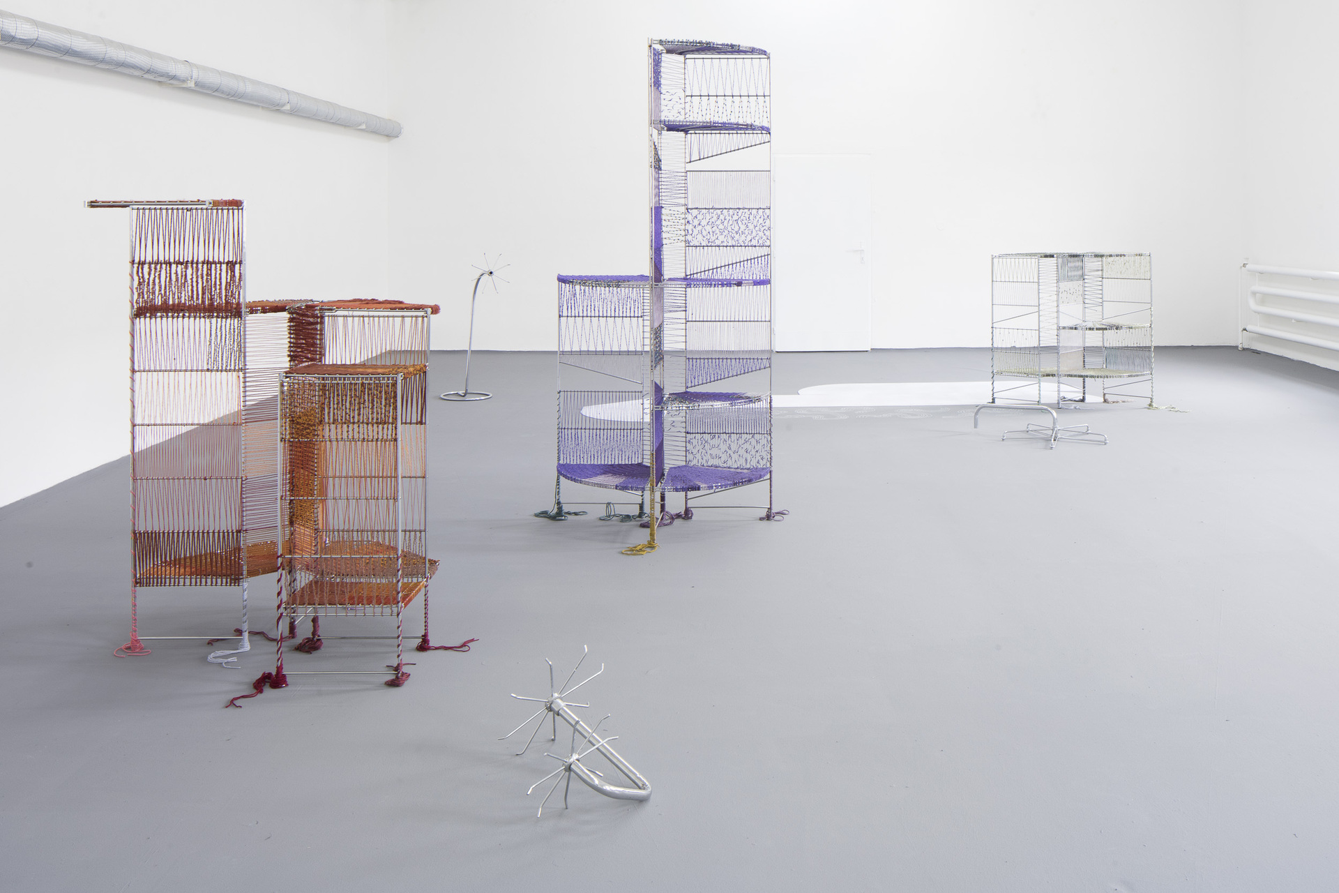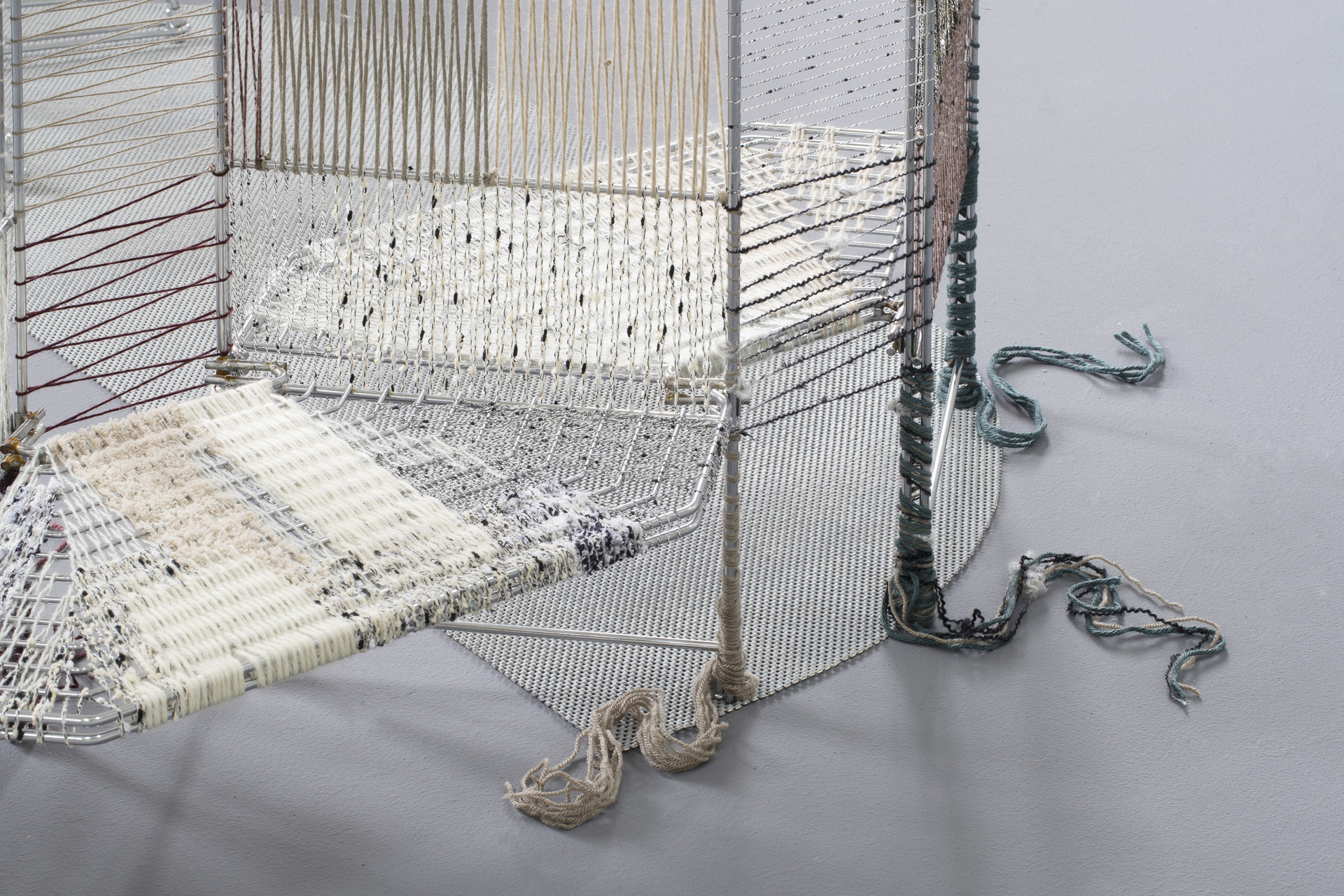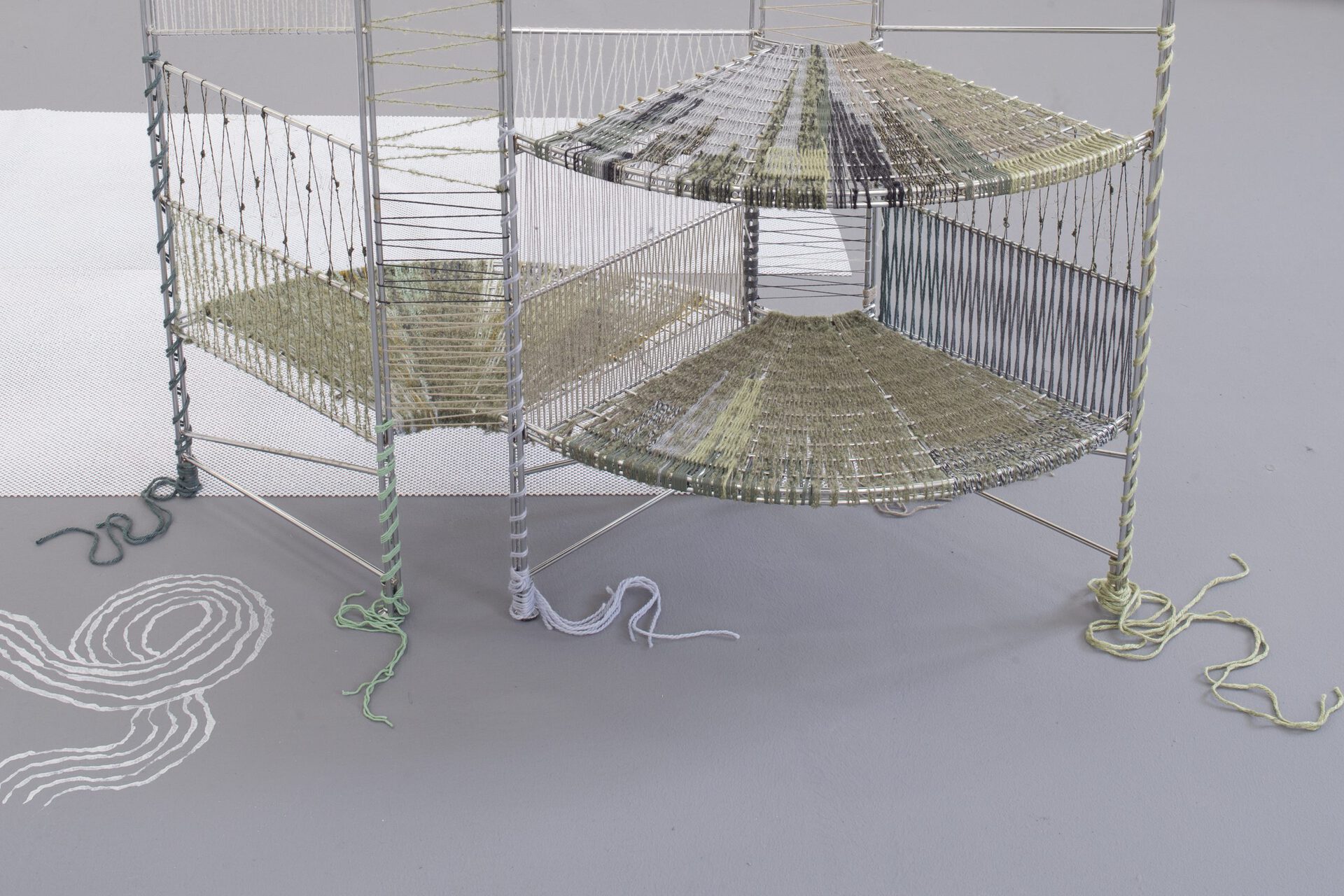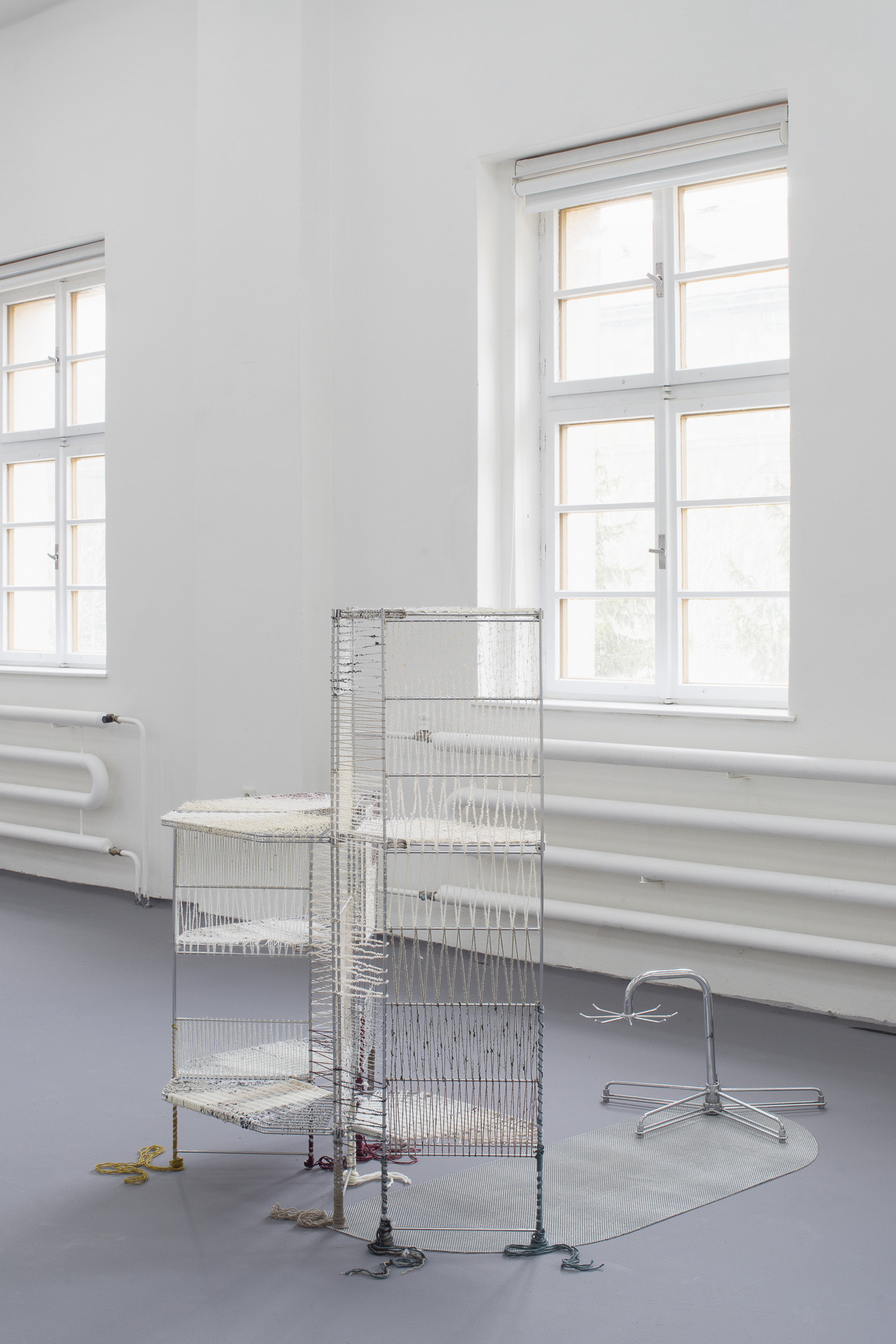 Their current exhibition Tiredness Quotes elaborates on the same topic and follows up to Ostrava’s project Potential Causes of Afternoon Tiredness which the couple set into one of the abandoned buildings in the city center, between the rusting hangers and dingy movables. For their installation in Karlin Studios the artists borrowed a tiny part of furniture from the bankrupt shop and added some new weaved objects. Zentková & Gryboś will let musicians play the motive of the song Dancing in the Dark among the objects to document the way the song gets asymmetrically deformed as a result of fatigue. The exhibition is an admitted citation of Bruce Springsteen’s song from 1984, in which he was venting out his frustration, creative block following a successful record, concerns about not being able to build on it further, and anxiety of the pressures of his record label. During the four-hour-long performance, the hired musicians are going to constantly come back to the song while abandoning it at the same time. Nonetheless, the message is not only in the melodies and tones: it dwells in the drops of sweat on the musicians’ faces, as well as in the guitarist’s sore fingers and in the broken guitar strings and in the pussyfooting of the audience.
