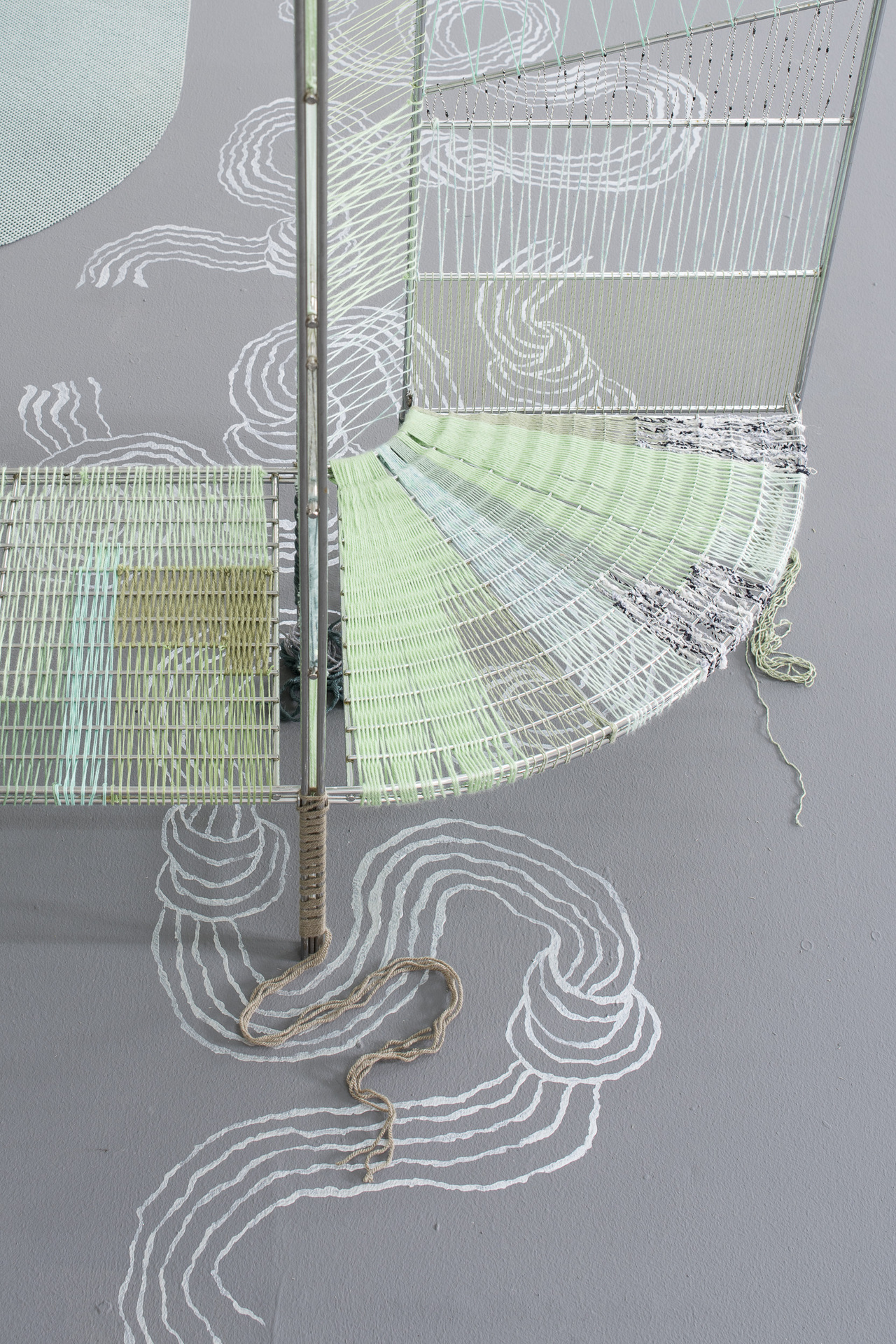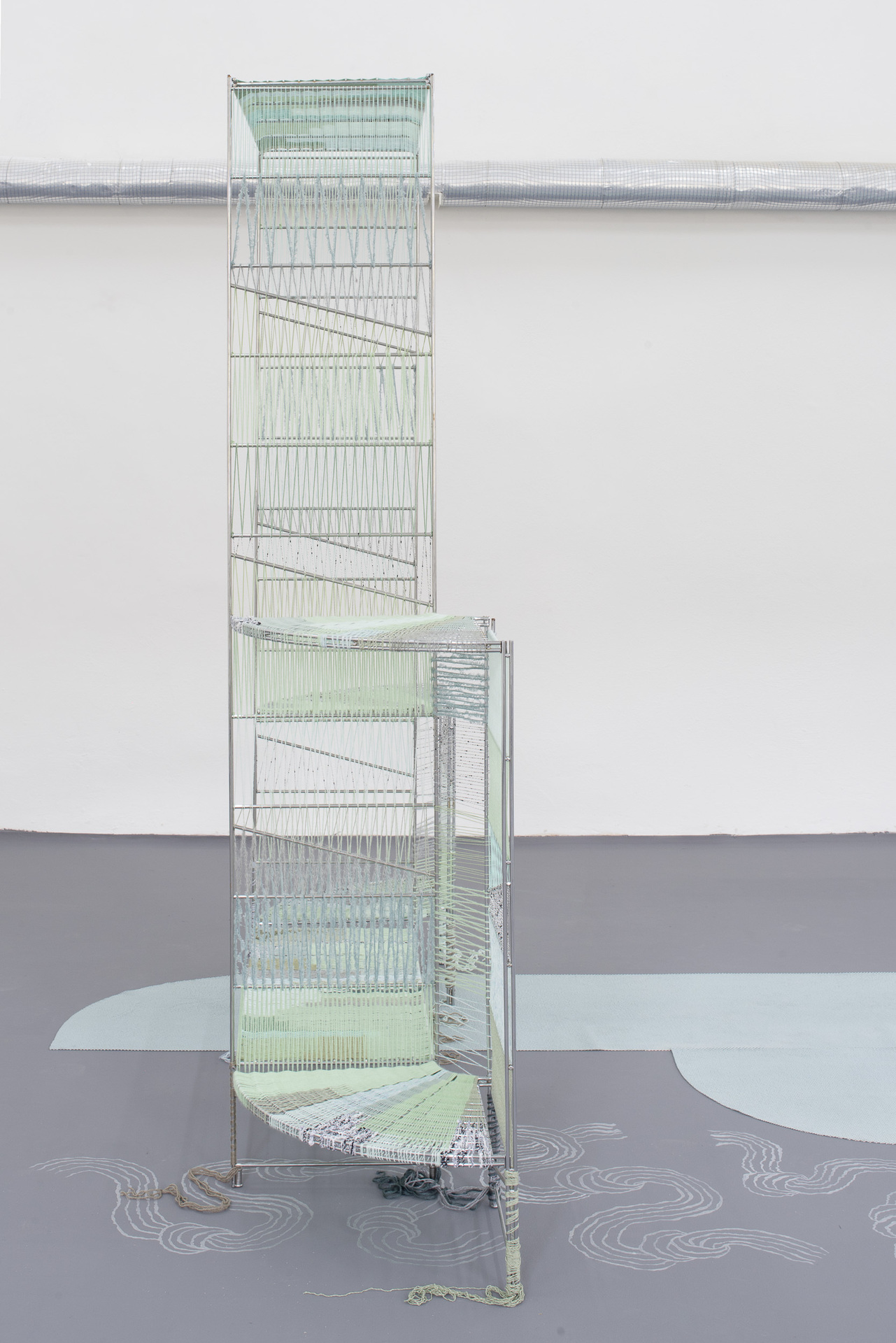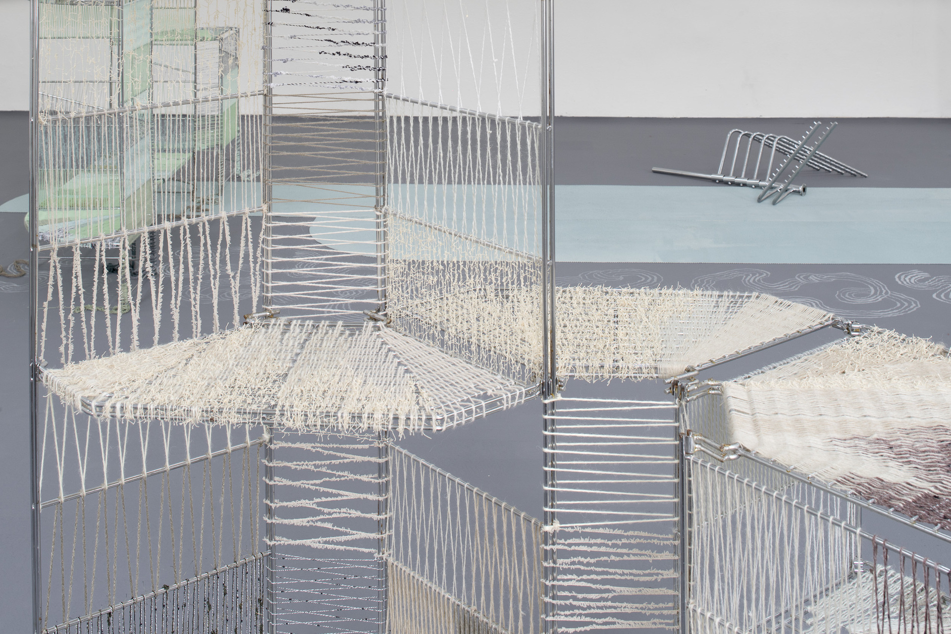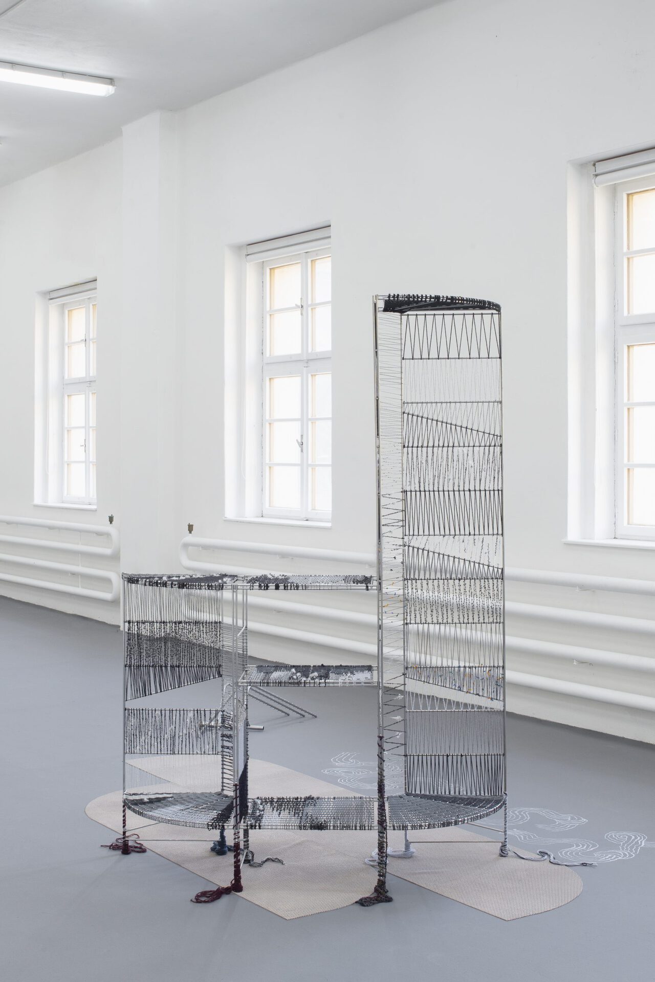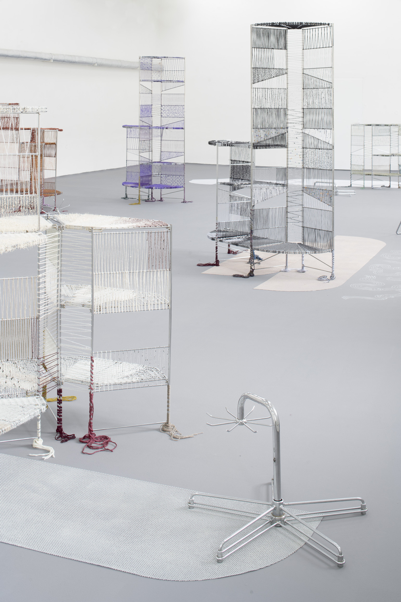 Their current exhibition Tiredness Quotes elaborates on the same topic and follows up to Ostrava’s project Potential Causes of Afternoon Tiredness which the couple set into one of the abandoned buildings in the city center, between the rusting hangers and dingy movables. For their installation in Karlin Studios the artists borrowed a tiny part of furniture from the bankrupt shop and added some new weaved objects. Zentková & Gryboś will let musicians play the motive of the song Dancing in the Dark among the objects to document the way the song gets asymmetrically deformed as a result of fatigue. The exhibition is an admitted citation of Bruce Springsteen’s song from 1984, in which he was venting out his frustration, creative block following a successful record, concerns about not being able to build on it further, and anxiety of the pressures of his record label. During the four-hour-long performance, the hired musicians are going to constantly come back to the song while abandoning it at the same time. Nonetheless, the message is not only in the melodies and tones: it dwells in the drops of sweat on the musicians’ faces, as well as in the guitarist’s sore fingers and in the broken guitar strings and in the pussyfooting of the audience.