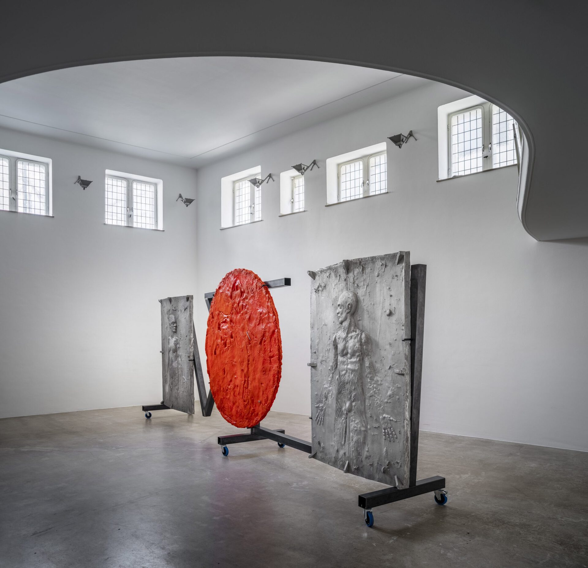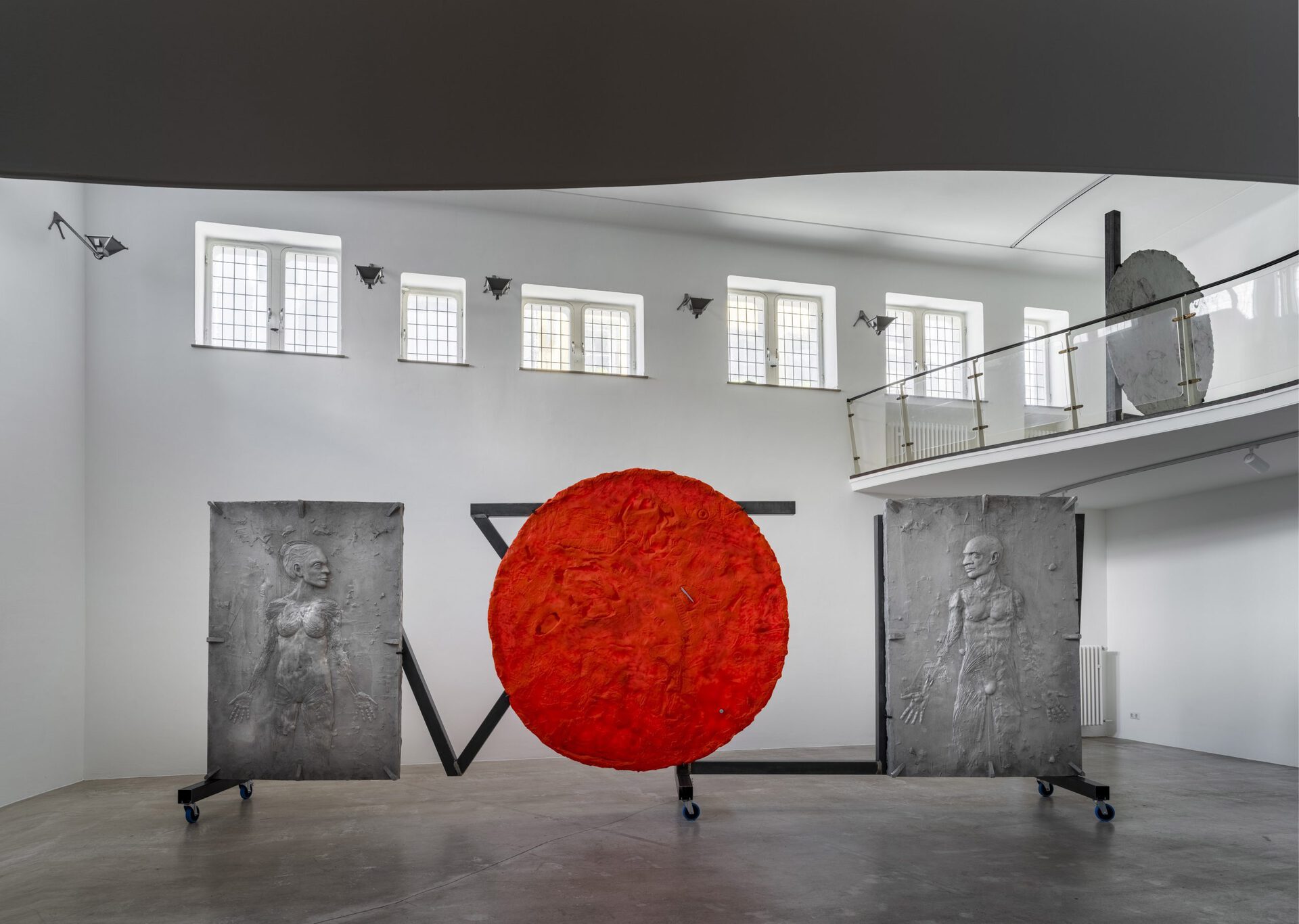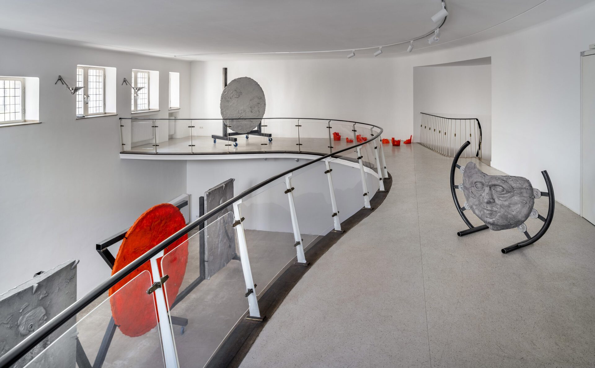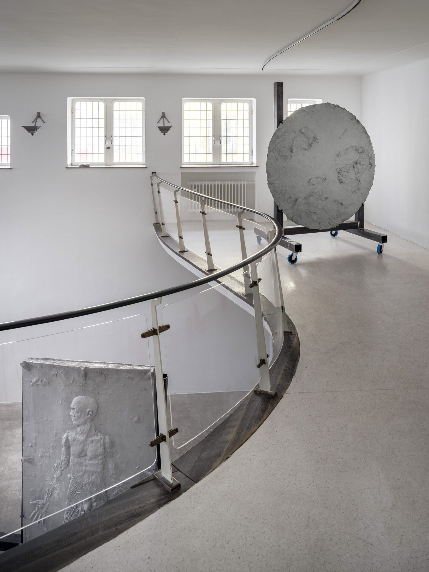 A co-production of Alfons Knogl and Lukas Schmenger, “ULTRA” showcases aluminium and epoxy- resin reliefs presented in a unique display in the centre of the exhibition space. Their circular and rectangular oversized plaques address the classical form of expression between sculpture and architecture with reference to topical questions about figure and object. In contrast to conventional positioning with only one visible show-side and obscured rear side, this installation type reveals insights into both front- and rear views. It also allows a closer examination of the shaping and volume that materialized according to the creation of the front side. They comprise the reductive, abstract counterpart to figurative and objective artworks.