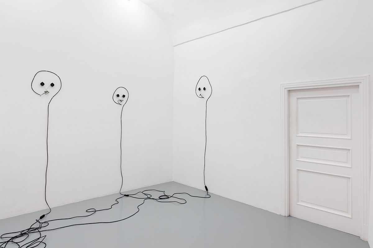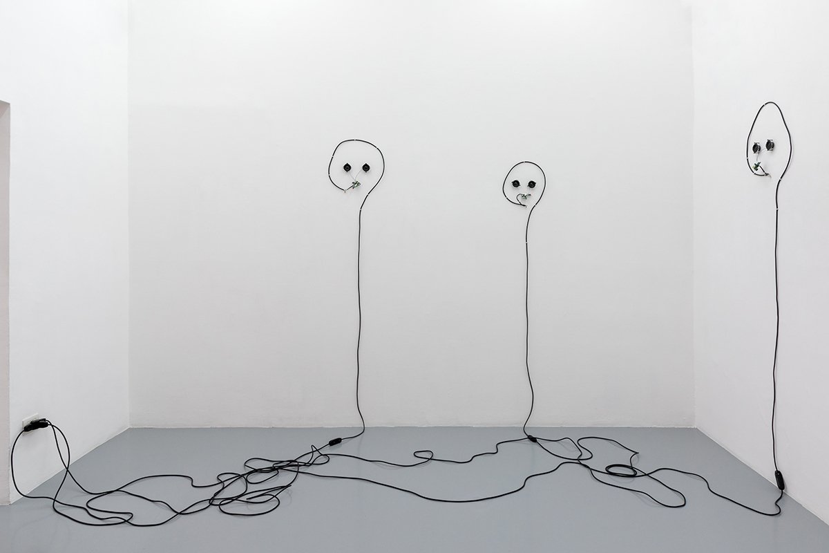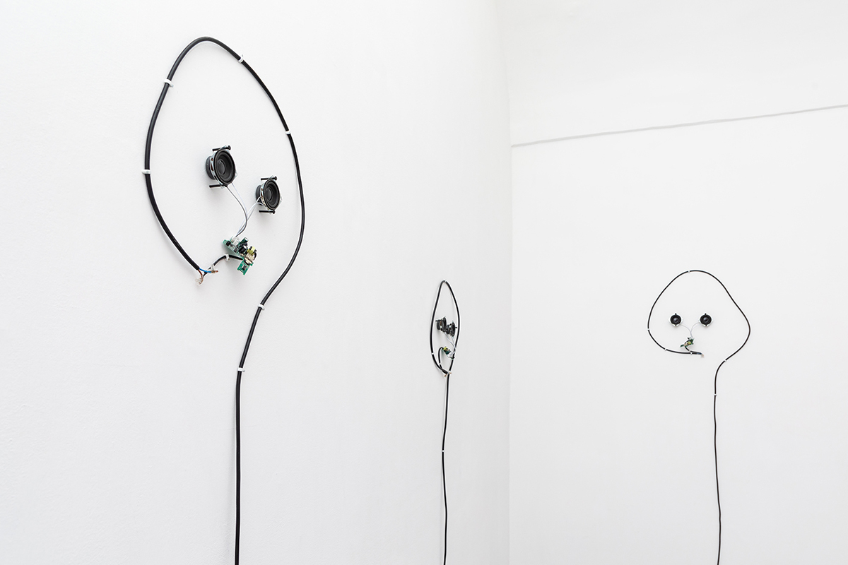 Faces, heads, unicellular algae formations synthesize together into forms and lines, giving life to new “beings.” To make the eyes two speakers are brought in to diffuse sound and their faces take their final form in an electric board and a memory card that continuously loops a single file. The machines pulse red with two small LED lights accompanied by voices that recite shrill and unattainable verses, hypnotical and blurred hums, deaf and unripe crackling.