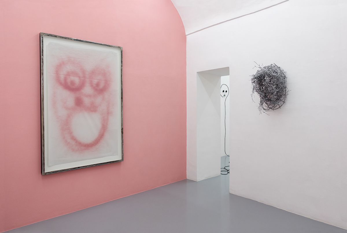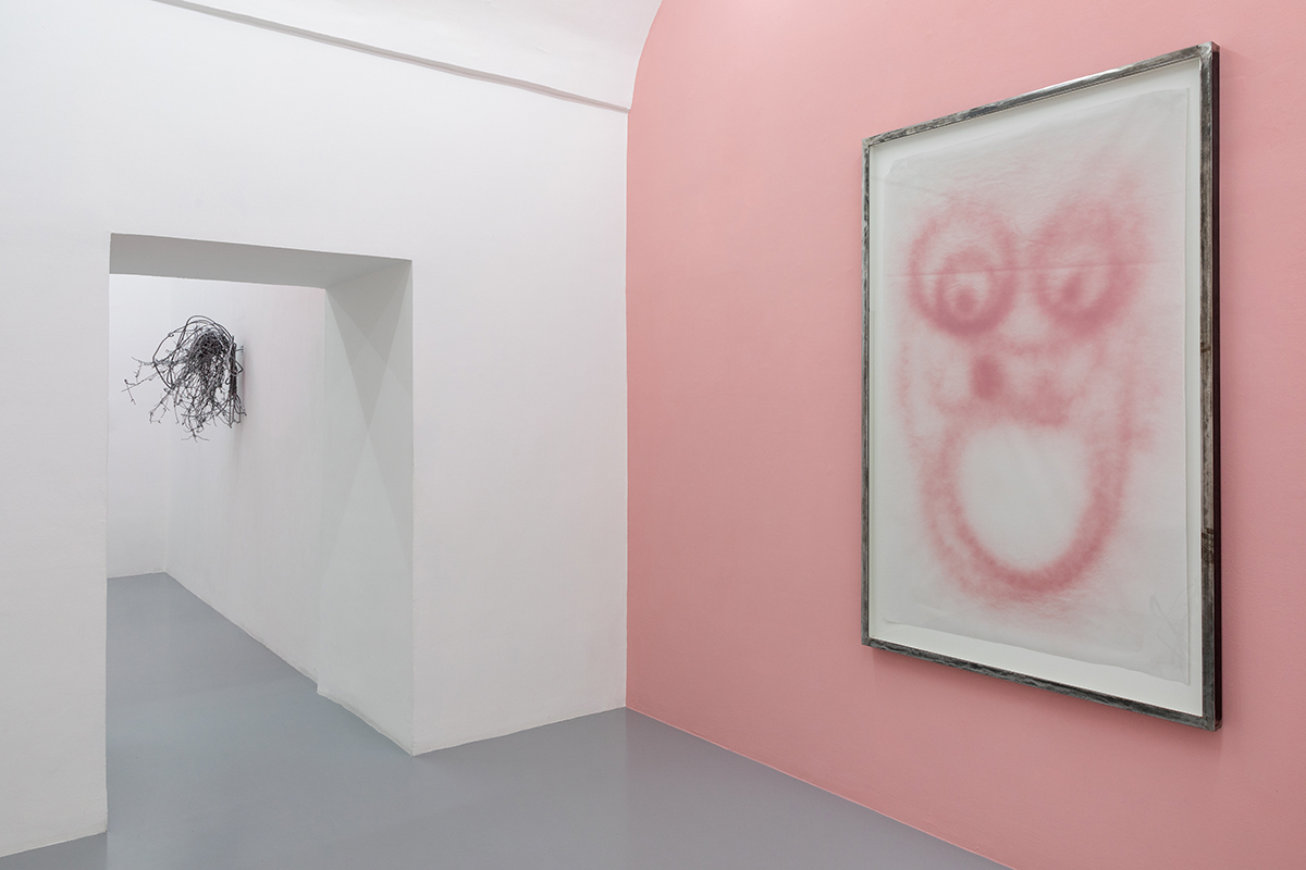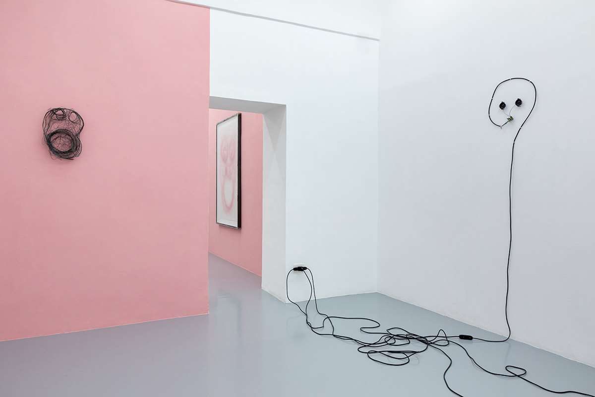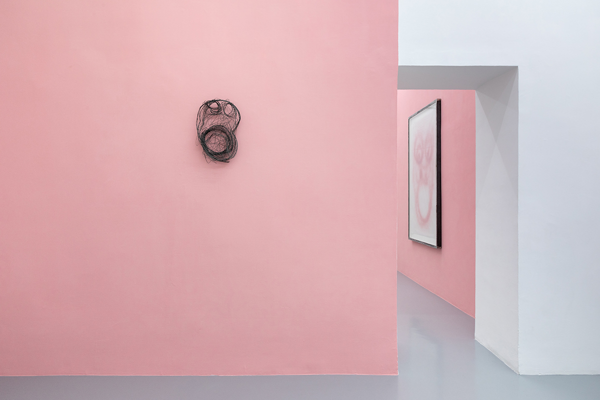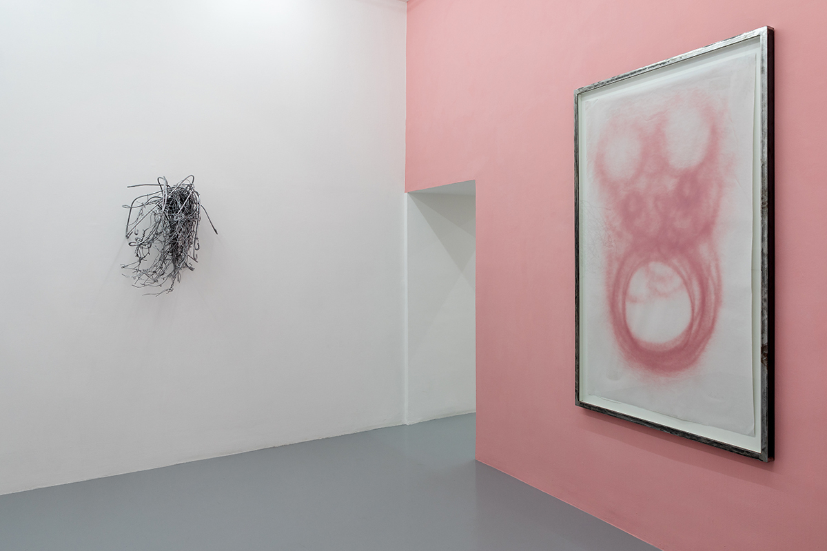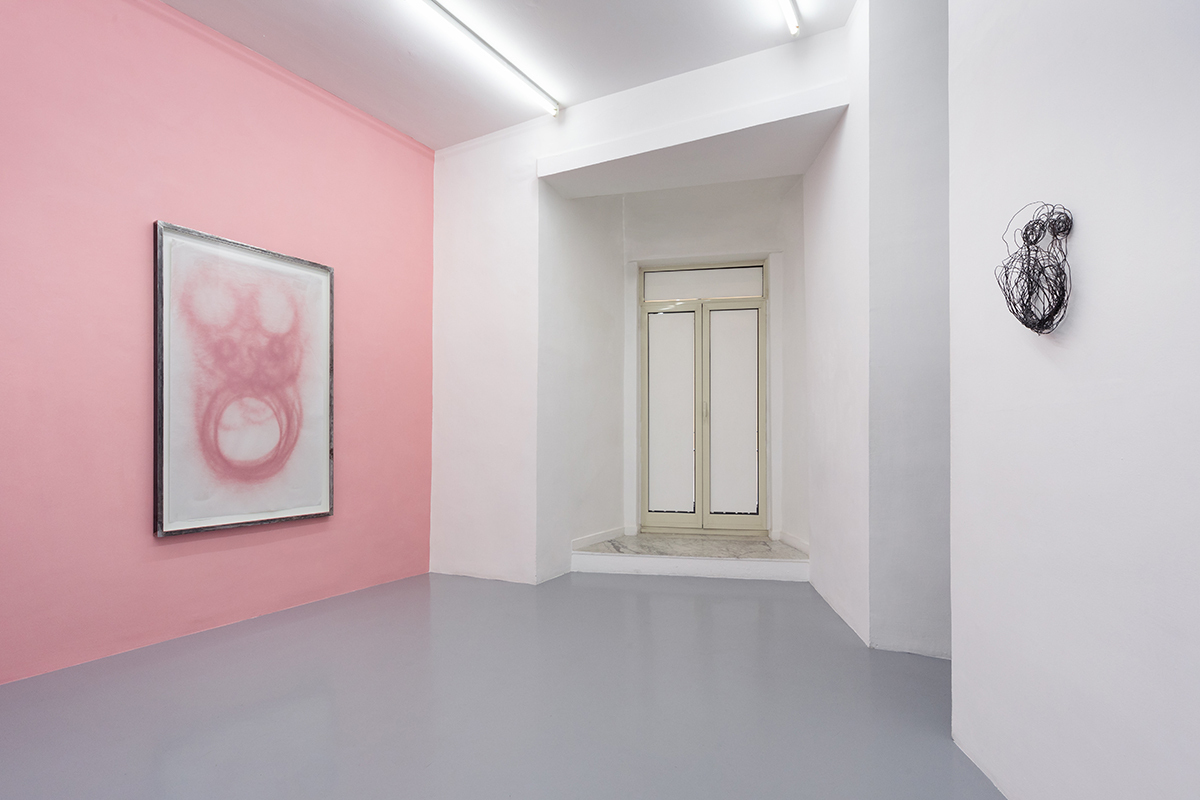 Elements such as the traces of a pink, dusty spray give shape to an instinctual gesture performed above the senses, following a pattern through an indefinite space and time. There’s an overlap of basic shapes that mark paper, extending and compressing on themselves like an algae which, through mitosis, reproduces and quickly takes over the environment, marking its territory irremediably.