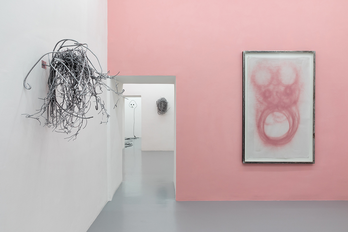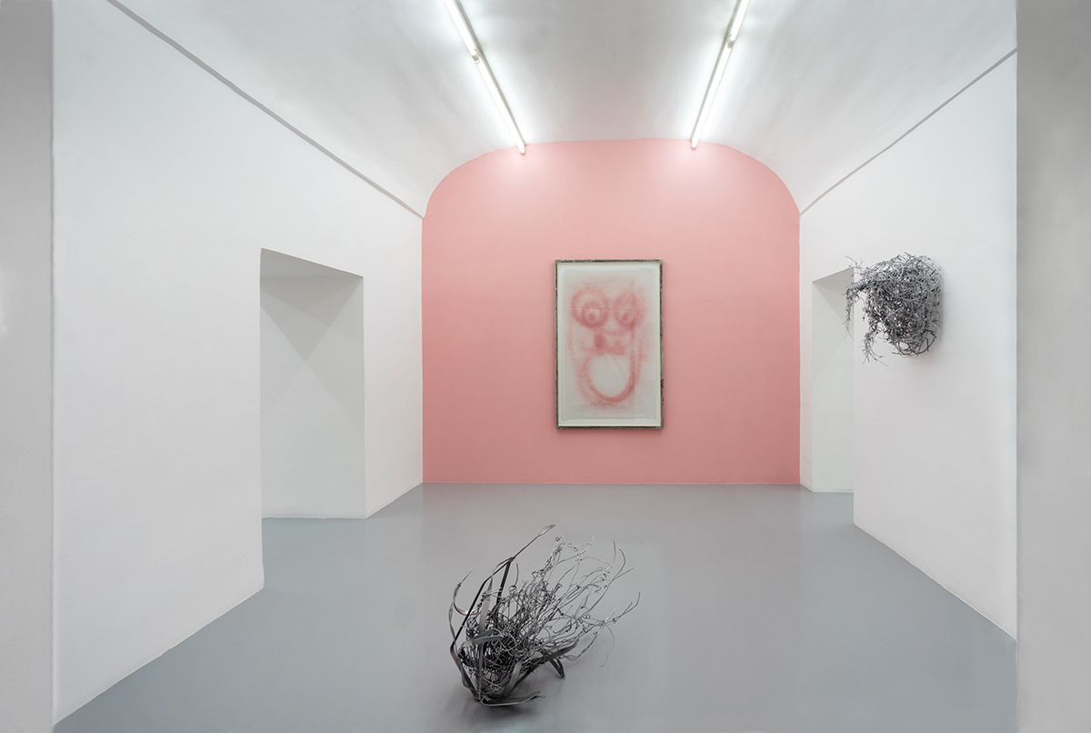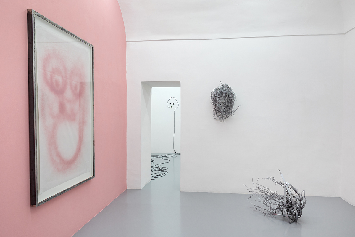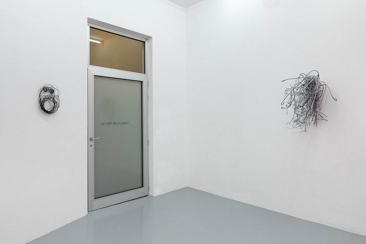 In the same manner new life forms develop in this aseptic space, such as the hollow heads composed of an infinity of iron-like threads that appear on the walls like spontaneous growths of vegetation. Similar to the tasks performed by some stone formations, these veins seem to imitate the articulate bends and folds of roots and branches of trees. There’s a tactile and visible power that catches and holds the eye.