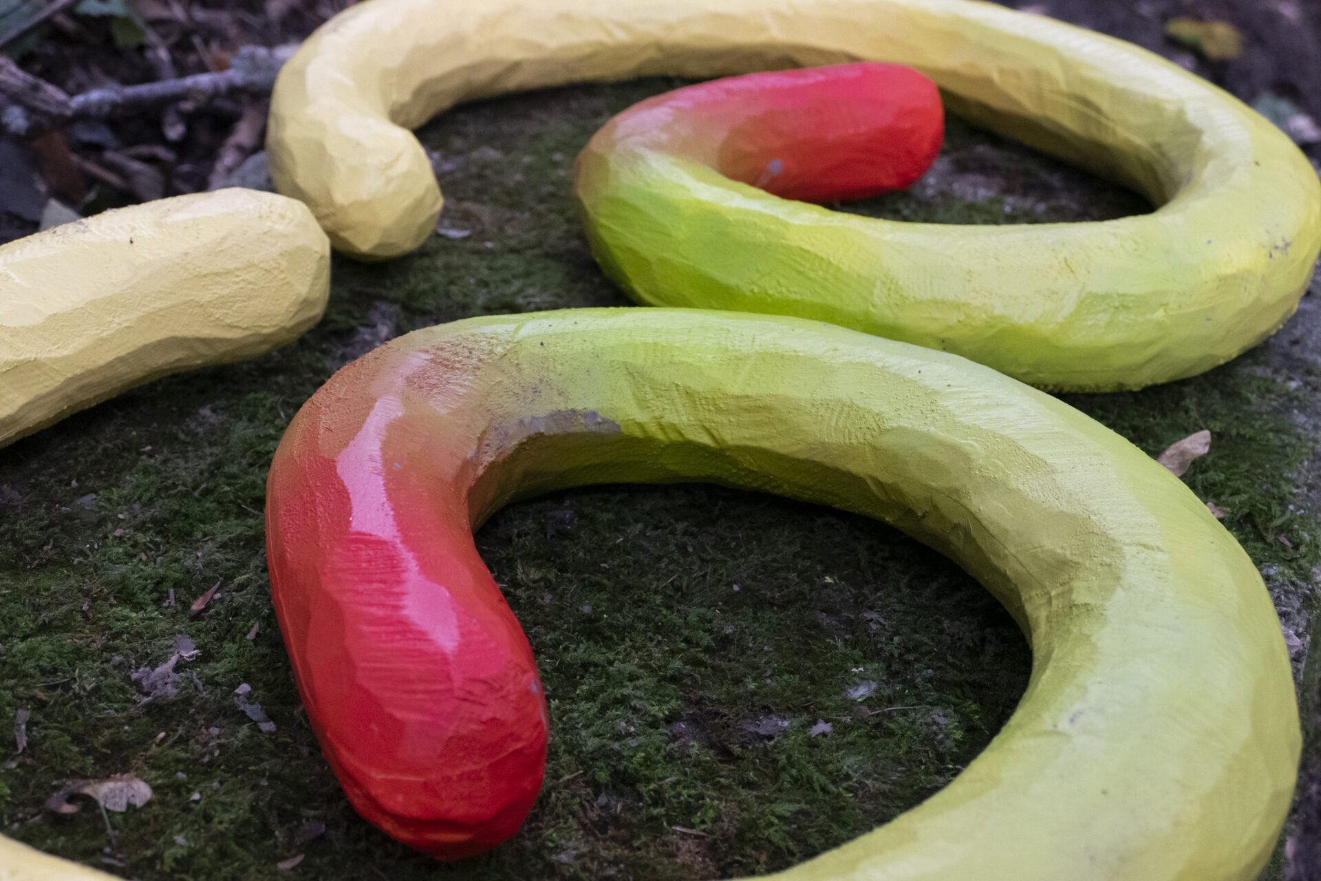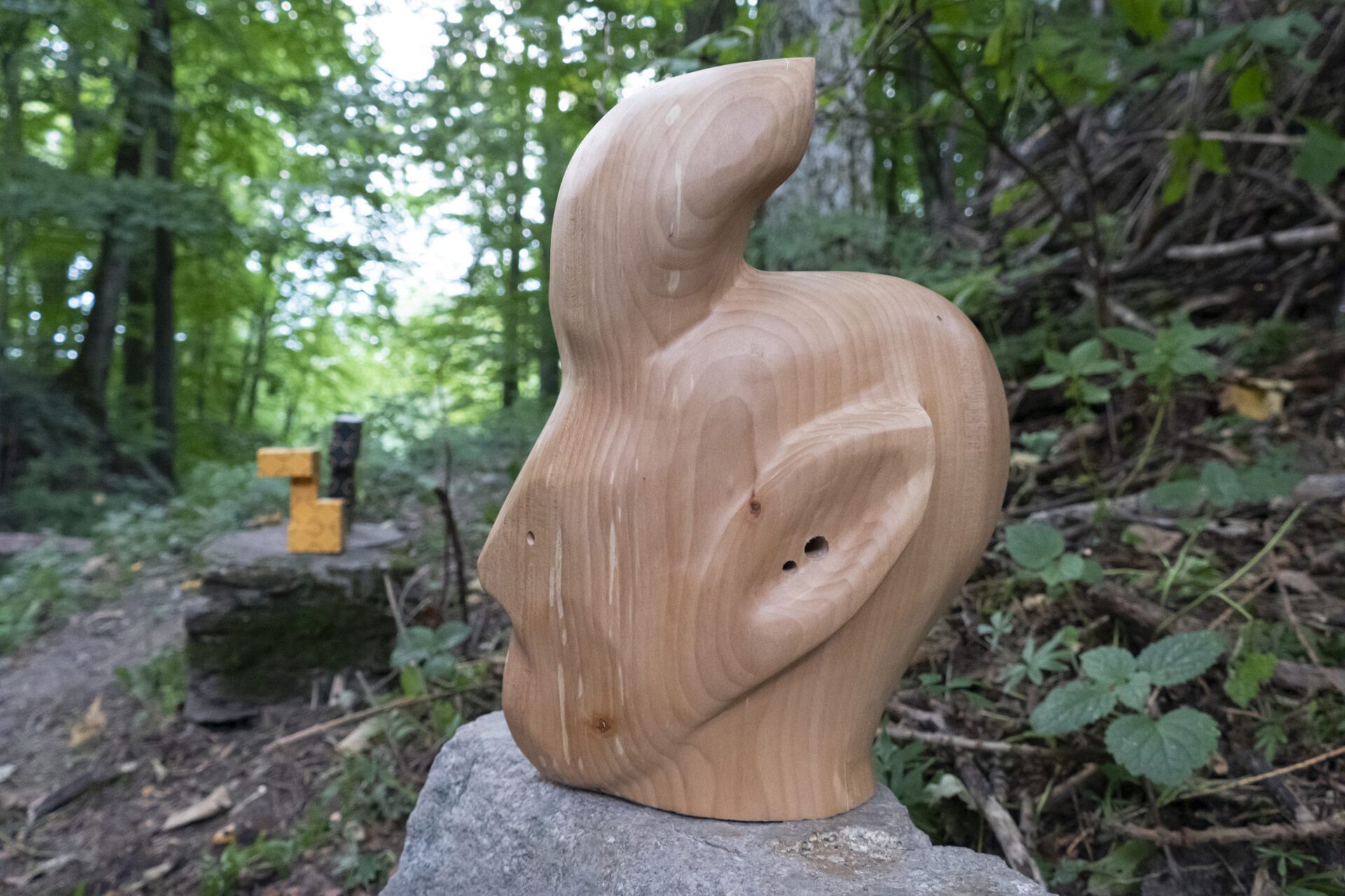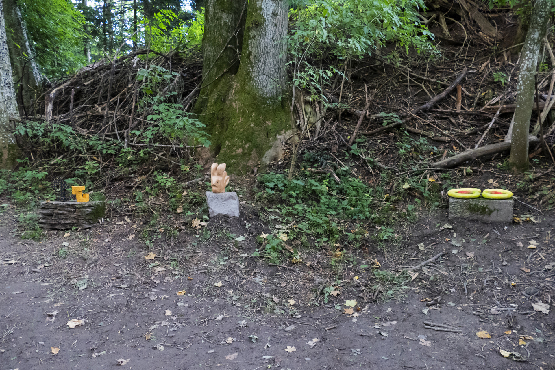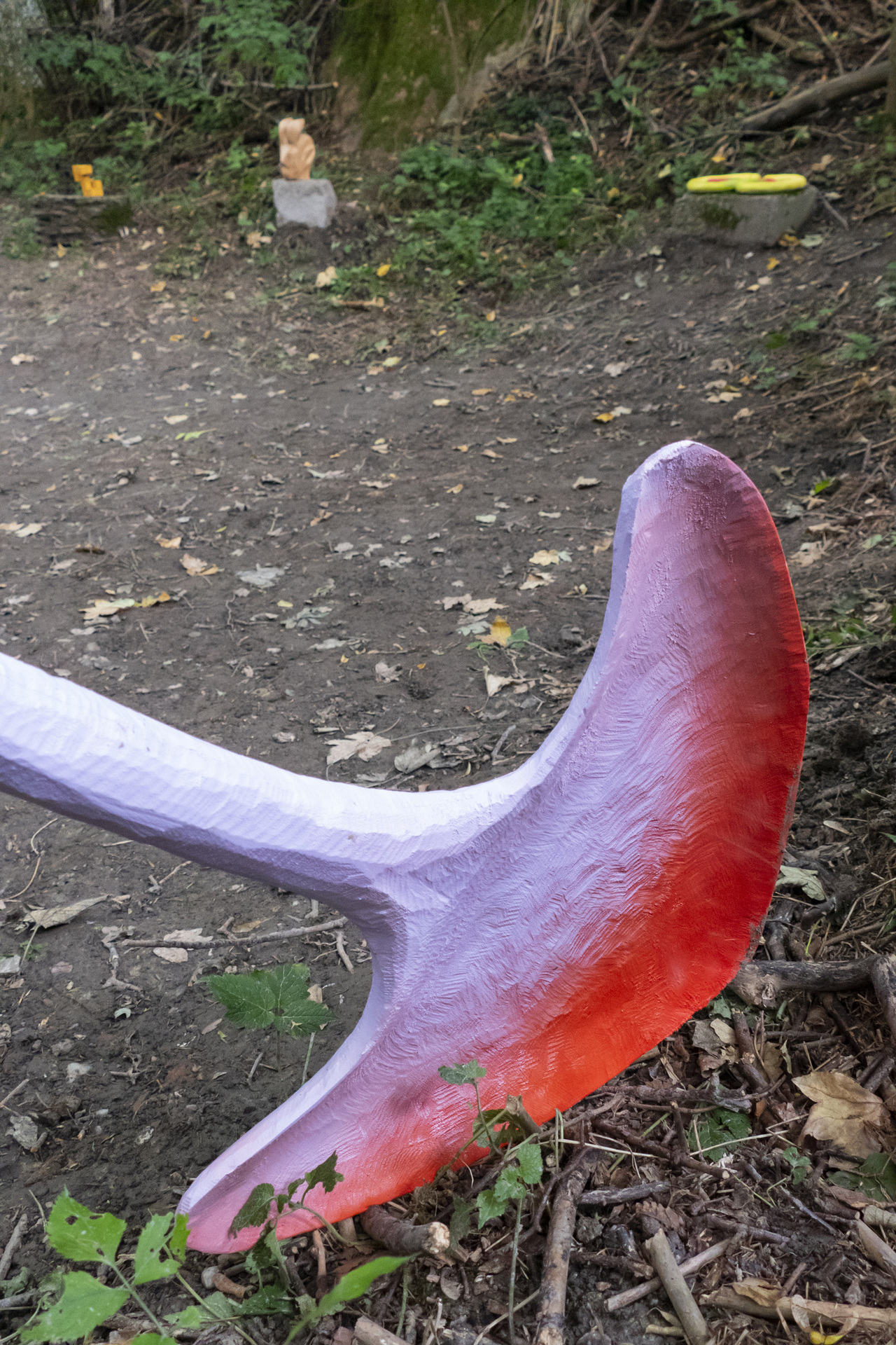 Four different Paddles relate to farming tools and their implementation in folkloric Austrian dance. A Kissing-Flute, which is to be held and played, is placed on a stone. Two Rams are to be smashed against the trunks of trees to give a rhythmic experience. The 24 magnetic cubes of Day and night are to decide the everlasting rivalry between day and night, in the form of a game.