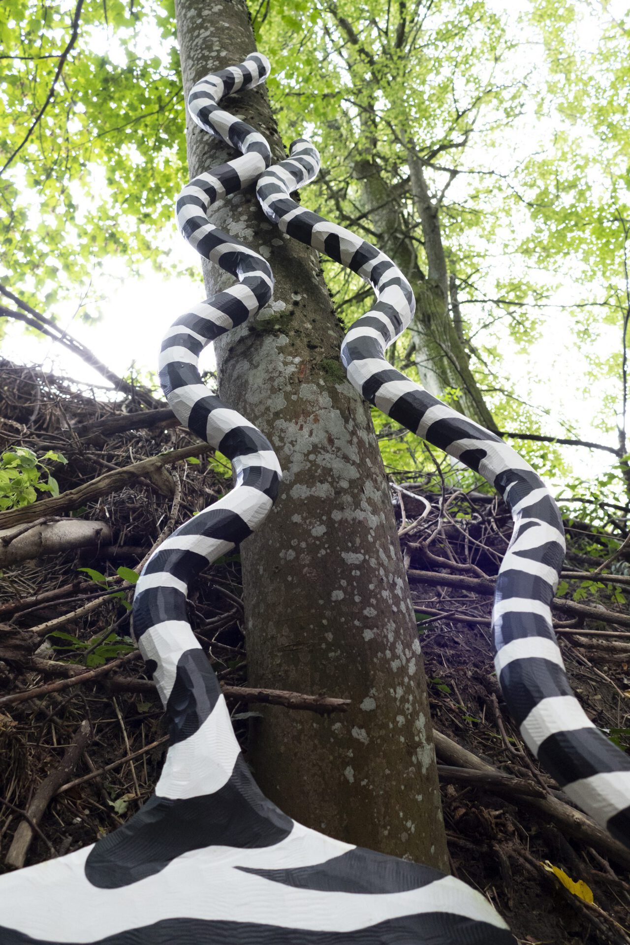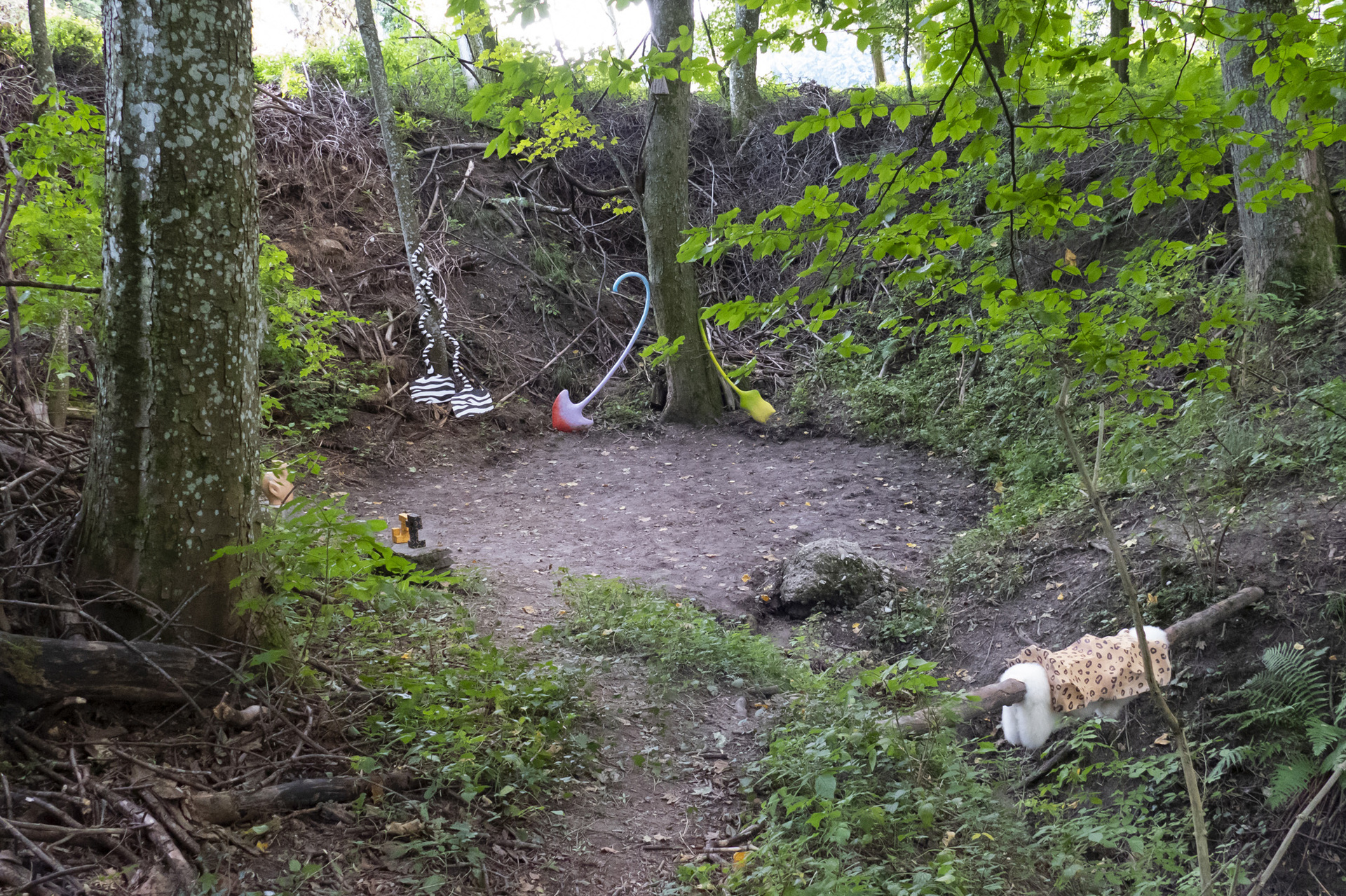 Vertigo is located in a deciduous forest next to fields and an old farmhouse. One can interact with the various wooden objects that are placed on the periphery of a natural arena. The installation is accompanied with a ritual track composed by Dance Divine.