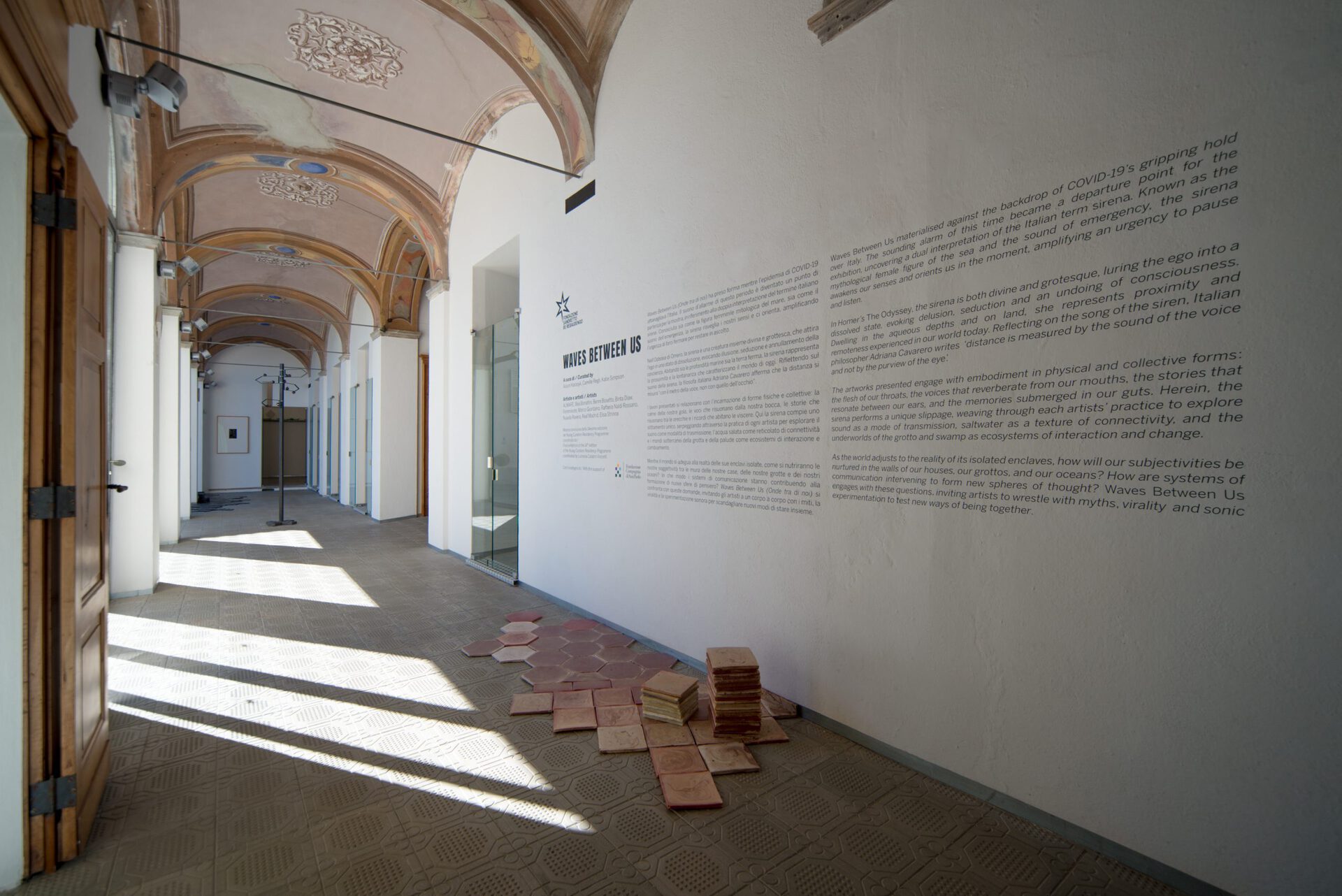 Artists ALMARE Bea Bonafini Benni Bosetto Binta Diaw Femminote Marco Giordano Raffaela Naldi Rossano Nuvola Ravera Real Madrid Elisa Strinna Final exhibition of the 14th edition of the Young Curators Residency Programme coordinated by Lucrezia Calabrò Visconti Waves Between Us materialised against the backdrop of COVID-19’s gripping hold over Italy. The sounding alarm of this time became a departure point for the exhibition, uncovering a dual interpretation of the Italian term 'sirena'. Known as the mythological female figure of the sea and the sound of emergency, the 'sirena' awakens our senses and orients us in the moment, amplifying an urgency to pause and listen. In Homer’s The Odyssey, the 'sirena' is both divine and grotesque, luring the ego into a dissolved state, evoking delusion, seduction and an undoing of consciousness. Dwelling in the aqueous depths and on land, she represents proximity and remoteness experienced in our world today. Reflecting on the song of the siren, Italian philosopher Adriana Cavarero writes, ‘distance is measured by the sound of the voice and not by the purview of the eye’. The artworks presented engage with embodiment in physical and collective forms: the flesh of our throats, the voices that reverberate from our mouths, the stories that resonate between our ears, and the memories submerged in our guts. Herein, the 'sirena' performs a unique slippage, weaving through each artists’ practice to explore sound as a mode of transmission, saltwater as a texture of connectivity, and the underworlds of the grotto and swamp as ecosystems of interaction and change. As the world adjusts to the reality of its isolated enclaves, how will our subjectivities be nurtured in the walls of our houses, our grottos, and our oceans? How are systems of communication intervening to form new spheres of thought? Waves Between Us engages with these questions, inviting artists to wrestle with myths, virality, and sonic experimentation to test new ways of being together.Text