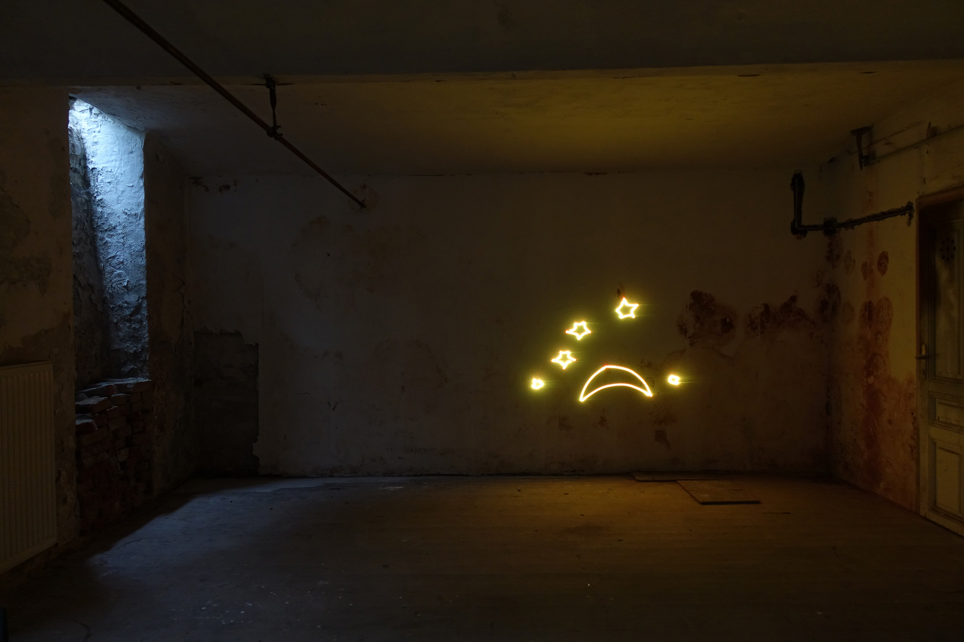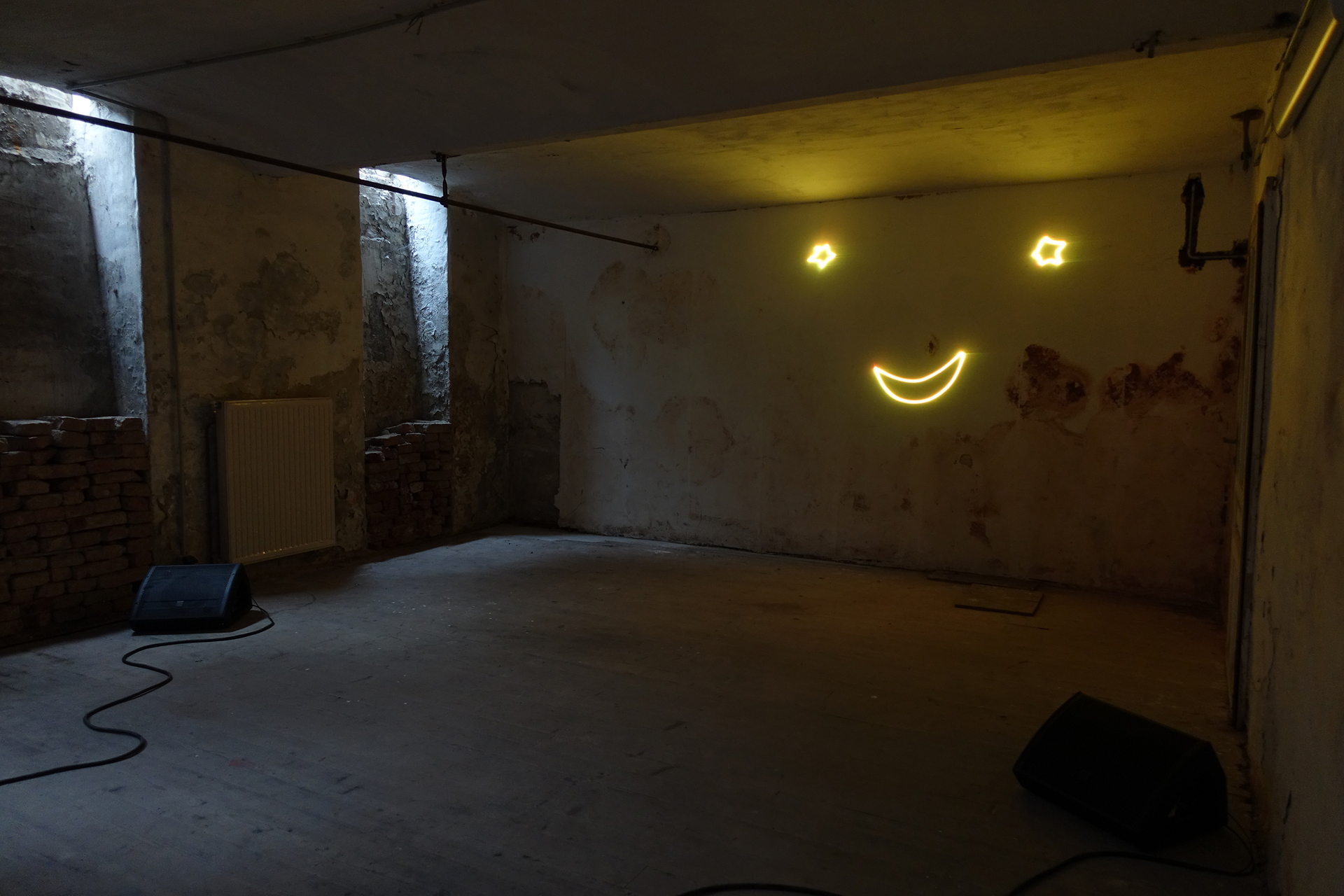 Downstairs, backstage. Daylight is barely claiming existence. Cables lying on the old wooden floor, some speakers and a yellow laser light on the spotted wall. Is that all there is? my thoughts sing again. No portal to Berghain, nor Burning Man, or Tomorrowland. An awkward silence is surrounding me that is underlined by a rather obtrusive whirring. An invisible hand is drawing a star for me on the back wall with the cursor, a sound clearly recognisable now. The mouse scratching over the desk, tipped by a forefinger. A star, then two, a half moon. Smiley! And I do smiley vaguely instantly. The initial abstract form becomes a character. Just a few lines it takes, to imagine a whole cosmos. I stare at the night sky within us.
