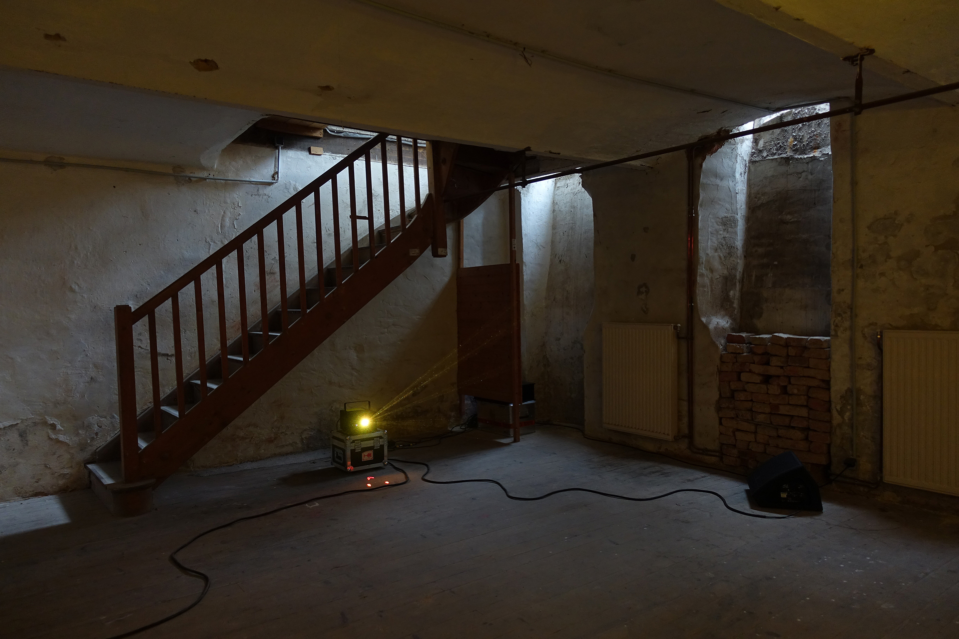 Spengemann reminds us that the artist’s life is akin to that of funfair exhibitors. In the best-case scenario, they're postmodern magicians, working from behind the curtains, showing us the trick, the joke, we’re usually missing. What we witness is therefore, a movie’s exodus from the screen, trying to striptease cinema. Indeed, reminiscent of early experimental and structural film, Spengemann does use the laser light as pure material. The dust sparkling in the room. Strobe effects rumple our heads. Yet it dances along the borderline and jumps easily between abstraction and figuration, between simple light and a story. It can do both at the same time. Playing with causality. In the fairy-tale of the Sterntaler, the stars fall out of the sky, turning into coins on earth, as a reward for a girl acting generous. Sterntaler’s alleged gain however implies a deep loss for the sky, relinquishing some of its members. What if the stars could remain in the sky and be gifted simultaneously? Proliferating Doppelgängers – like the stars do in Spengemann’s work. Dream about it, will you?