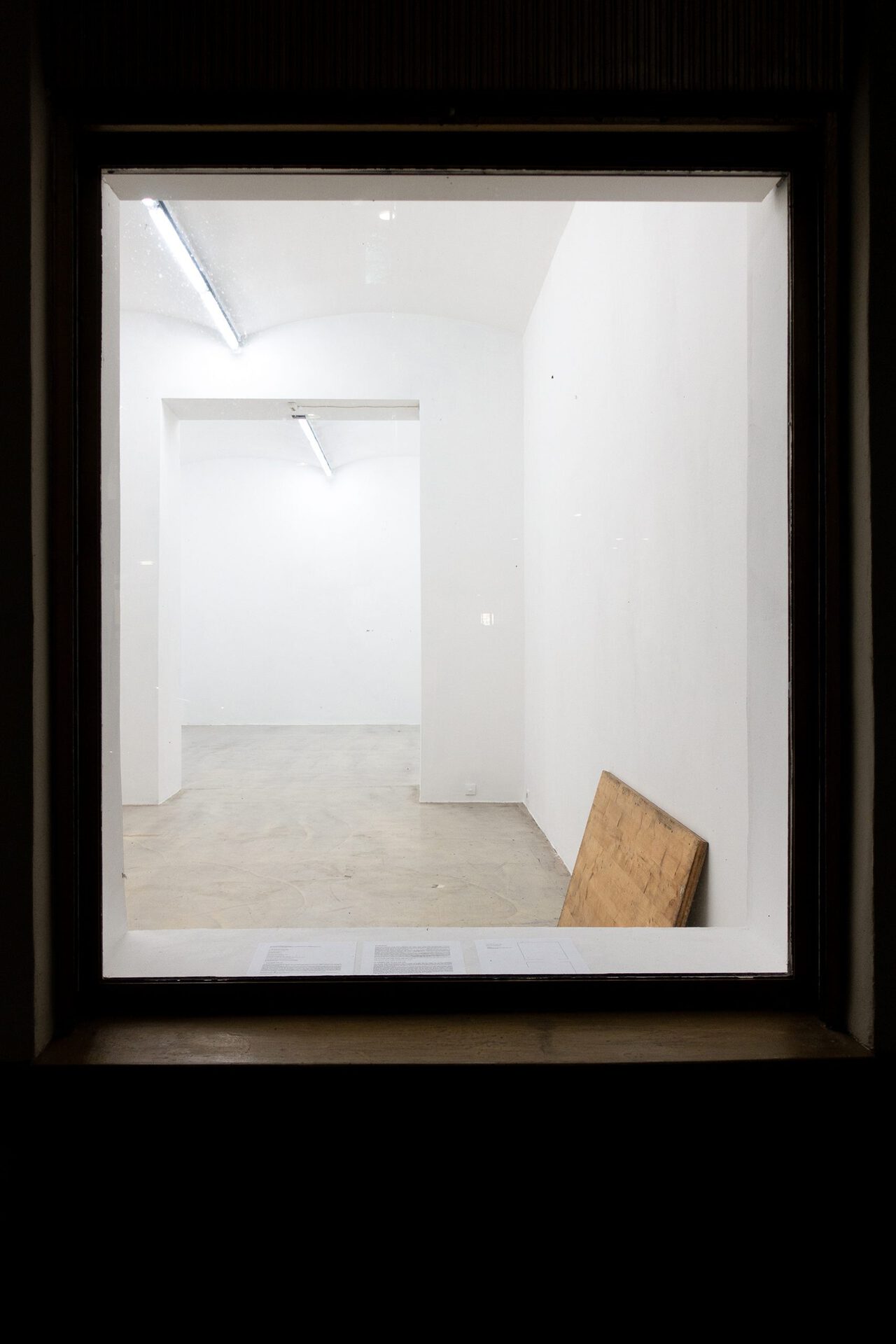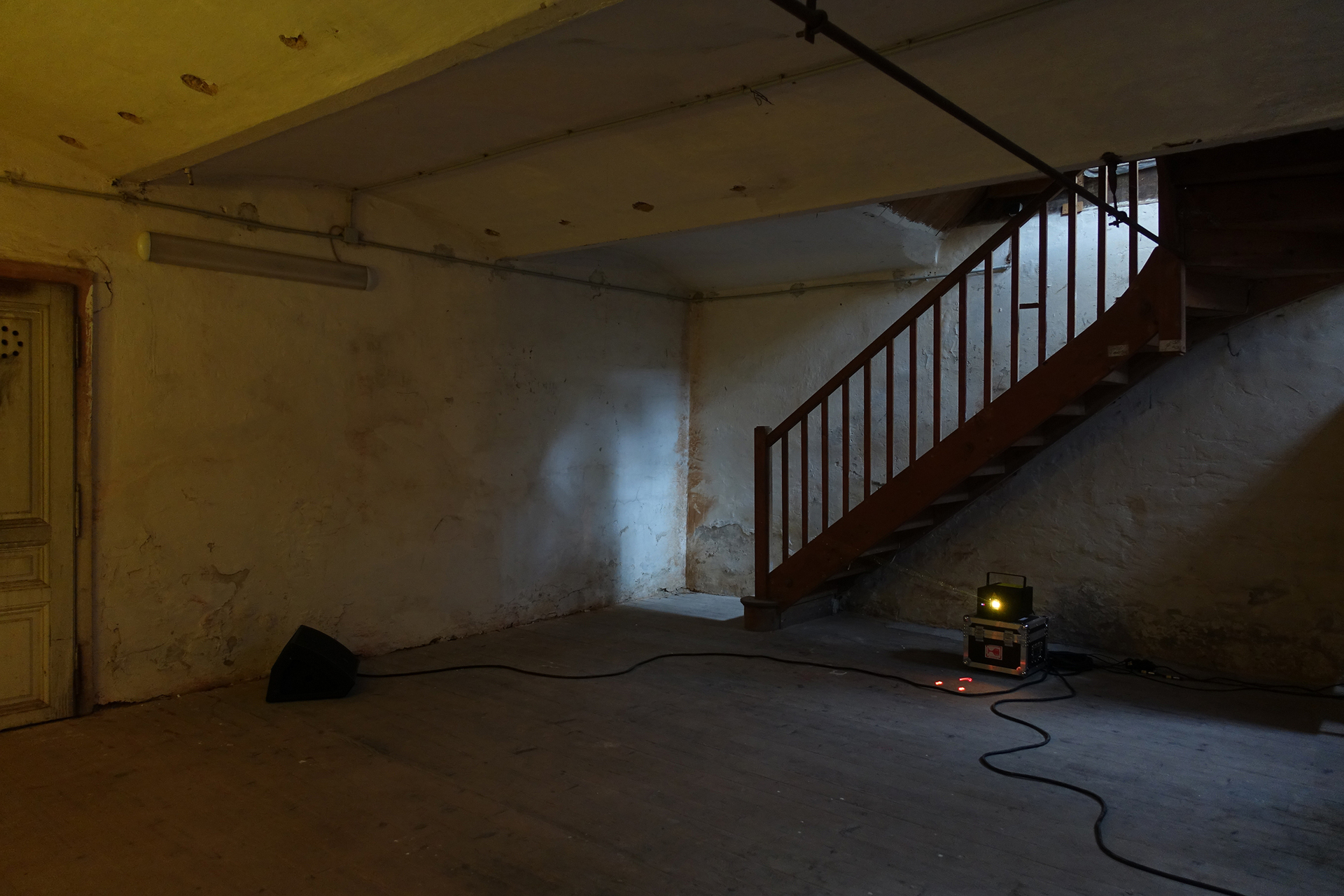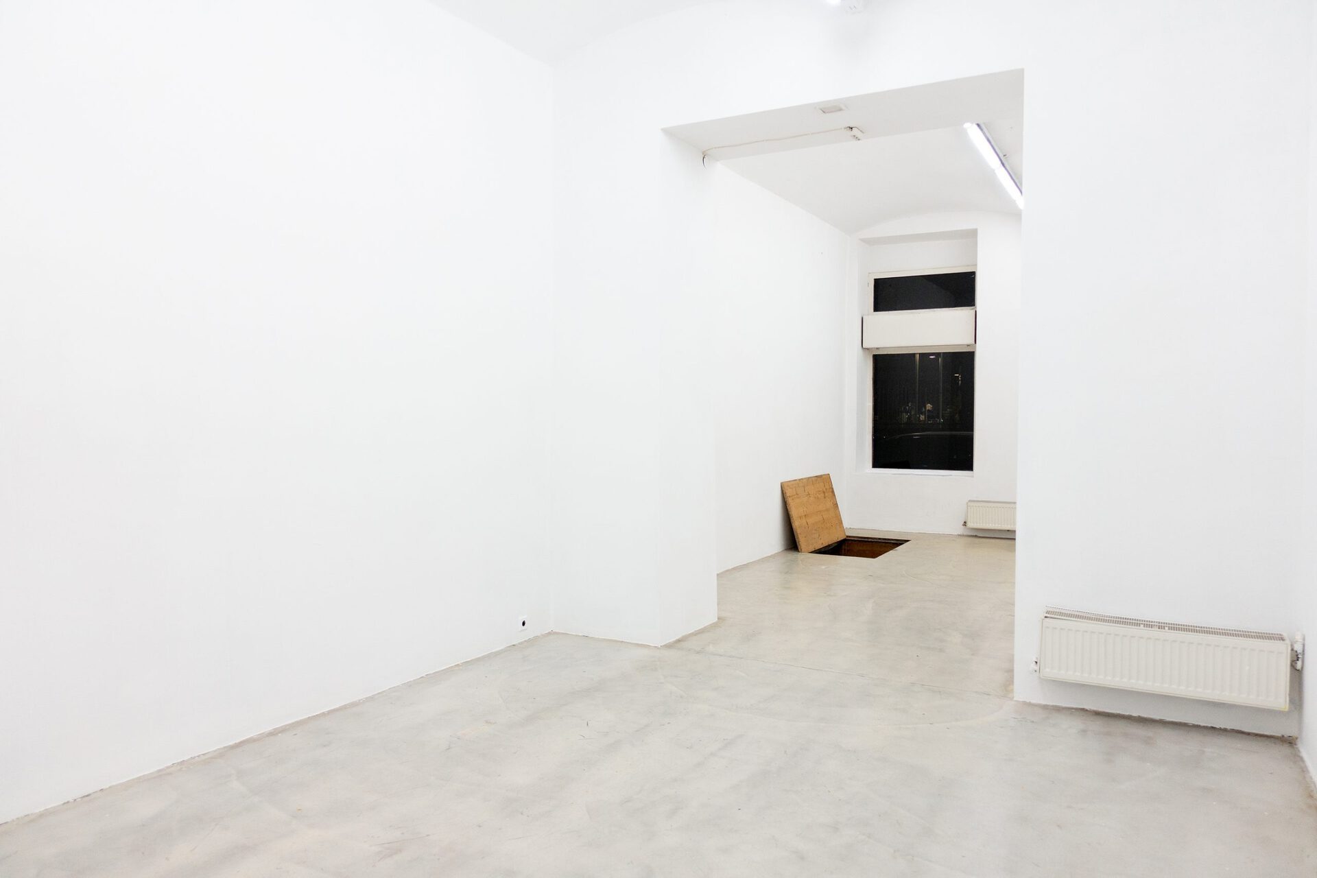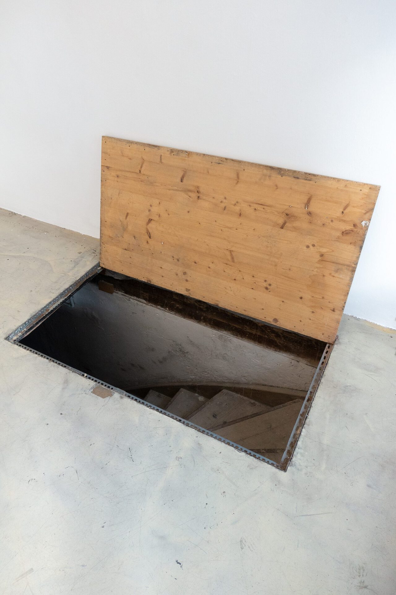 My feet are cold and bloodless. Why is it, I wonder, that every summer we seem to forget how winter feels, as if the cozy, yellow, enshrouding beams of the sun eradicate all remembrance of hibernal discomfort? Every season a surprise. Goldfish mind. The bare exhibition space prompts an unnoticed shiver when standing in its pale grey white. Is that all there is? Is that all there is? I start humming in my head, the famous US Jazz song, my colleague Nana Dahlin sings so beautifully, hers the only right way. Spengemann presents us a gallery unfurnished, denying us the company we sought. The only hope left now for entertainment is the opened hatch at the edge of the space. And finally: undefinable noises are emitted from the hole, then some peculiar music. The party must be downstairs this time. It moved to the cellar, the stash, maybe the subconscious.