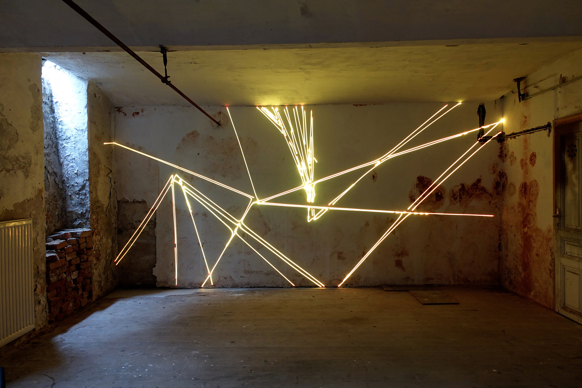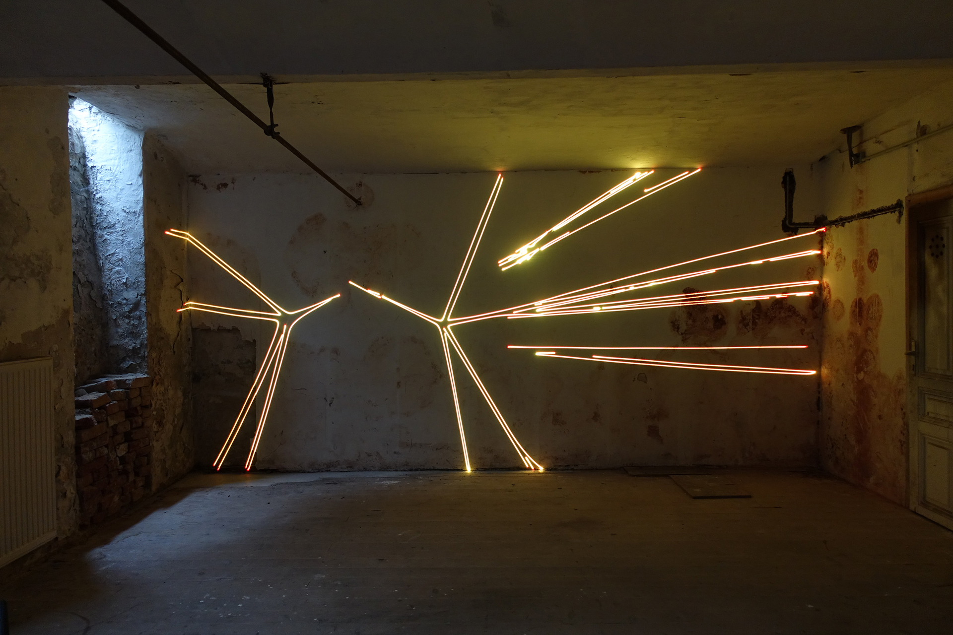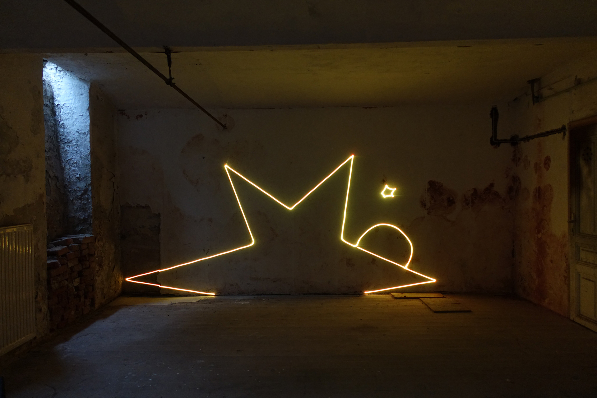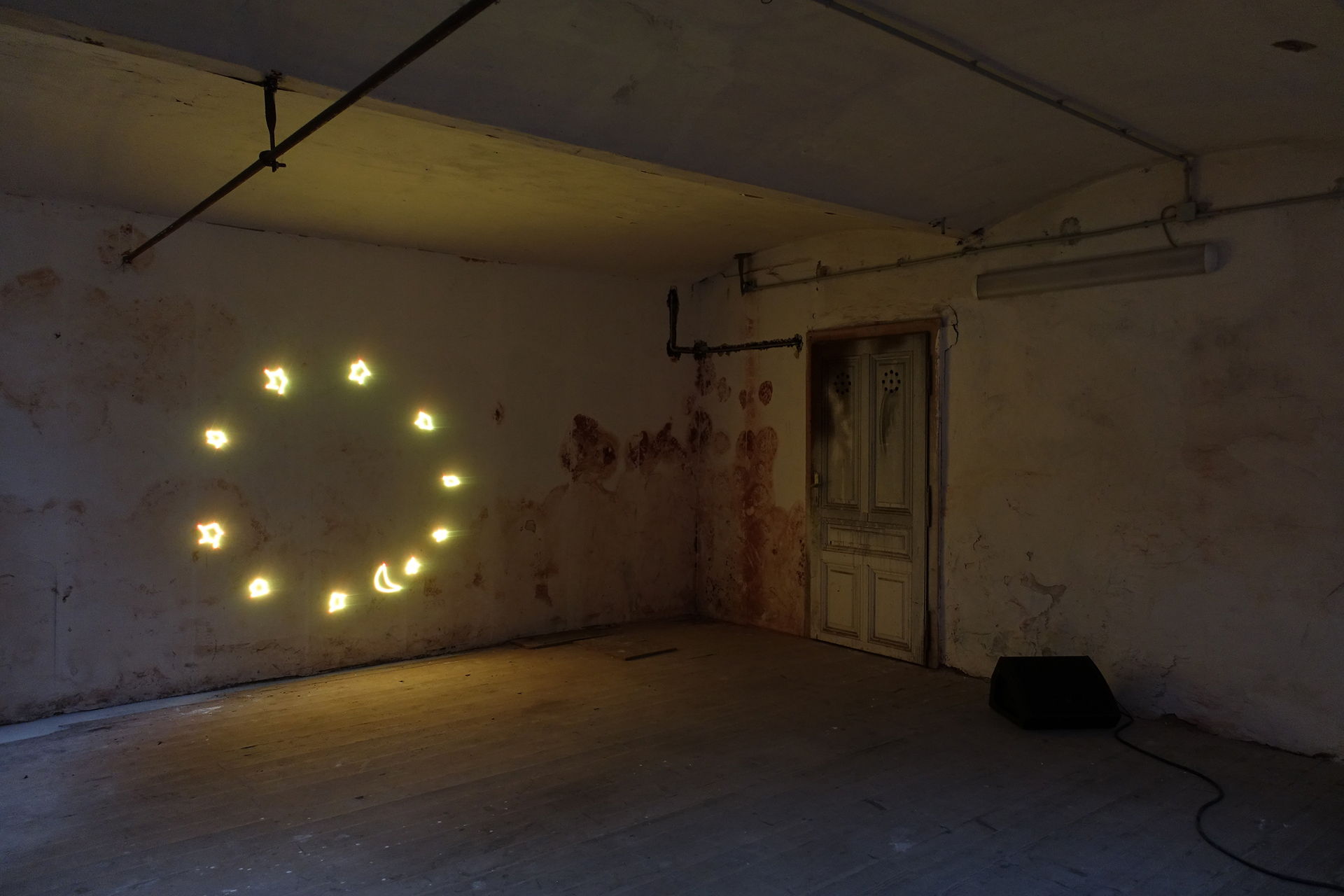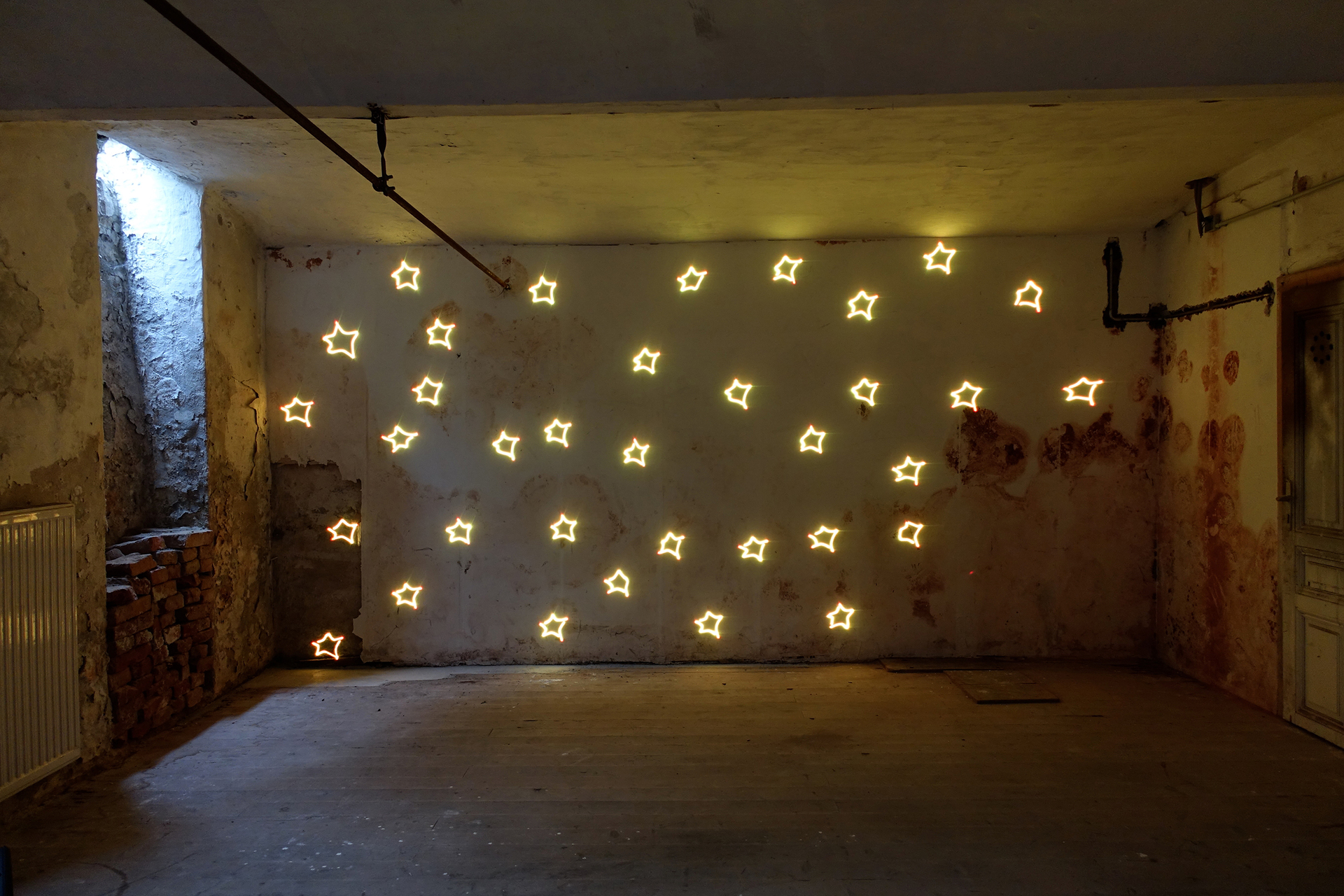 Walking the Viennese Prater in winter, your breath turns into little clouds and through the haze, the figurines of the amusement park, that just looked sad, pale and in need of renovation, suddenly seem saturated and full of life. Here in the cellar, Giraffes, galaxies, you name it, dance across the stonework. Even the projector has landed a part. He struggles heavy as the mirror pointer tries to retrace every laser point. When an army of stars invades, he lets them tremble in exhaustion.