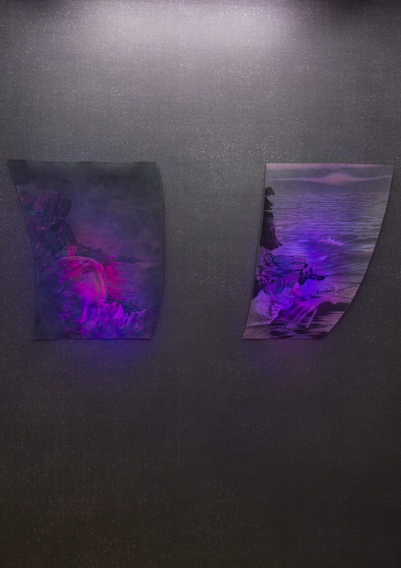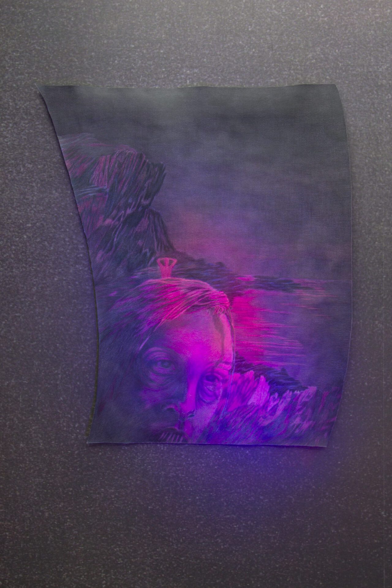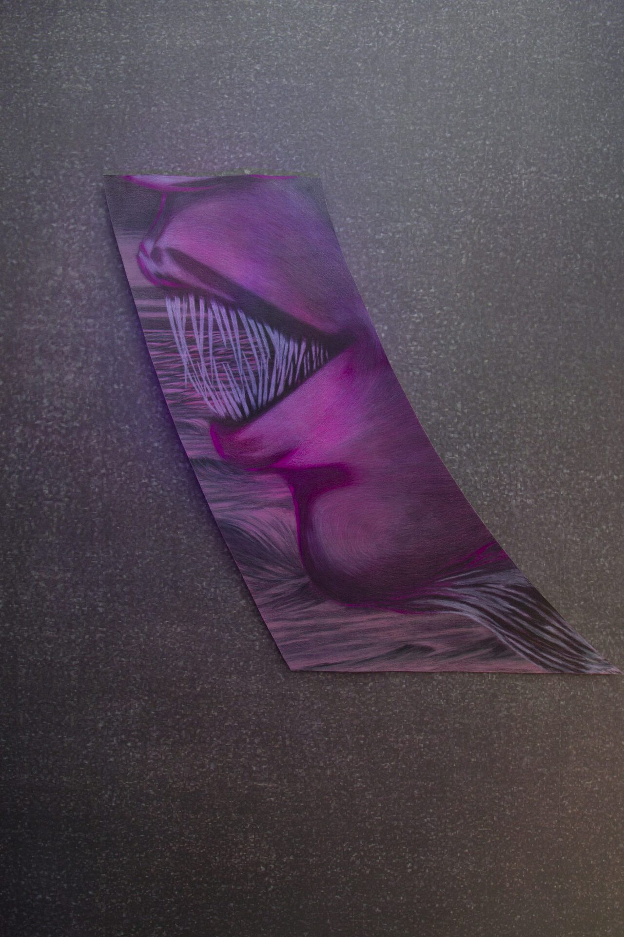 Tess Bilhartz’s solo exhibition What on Earth at Super Dutchess Gallery depicts an imagined mermaid sighting. Images of this sometimes monstrous, sometimes vulnerable figure flicker into focus and dissolve back into the water. The haze and heave of the ocean distort our view. Mermaids are the sirens who sing sailors to their deaths; they are red-haired Ariel in a clamshell bikini; they have also eaten humans alive with shark-like rows of long, pointy teeth. They have been known to evaporate into seafoam when their love for a human is unrequited. Glimpsed only in legends or by sailors on the verge of insanity and hallucination, mermaids are, in other words, the opposite of solid. How can a mermaid, with all her slippery shifting, be depicted?